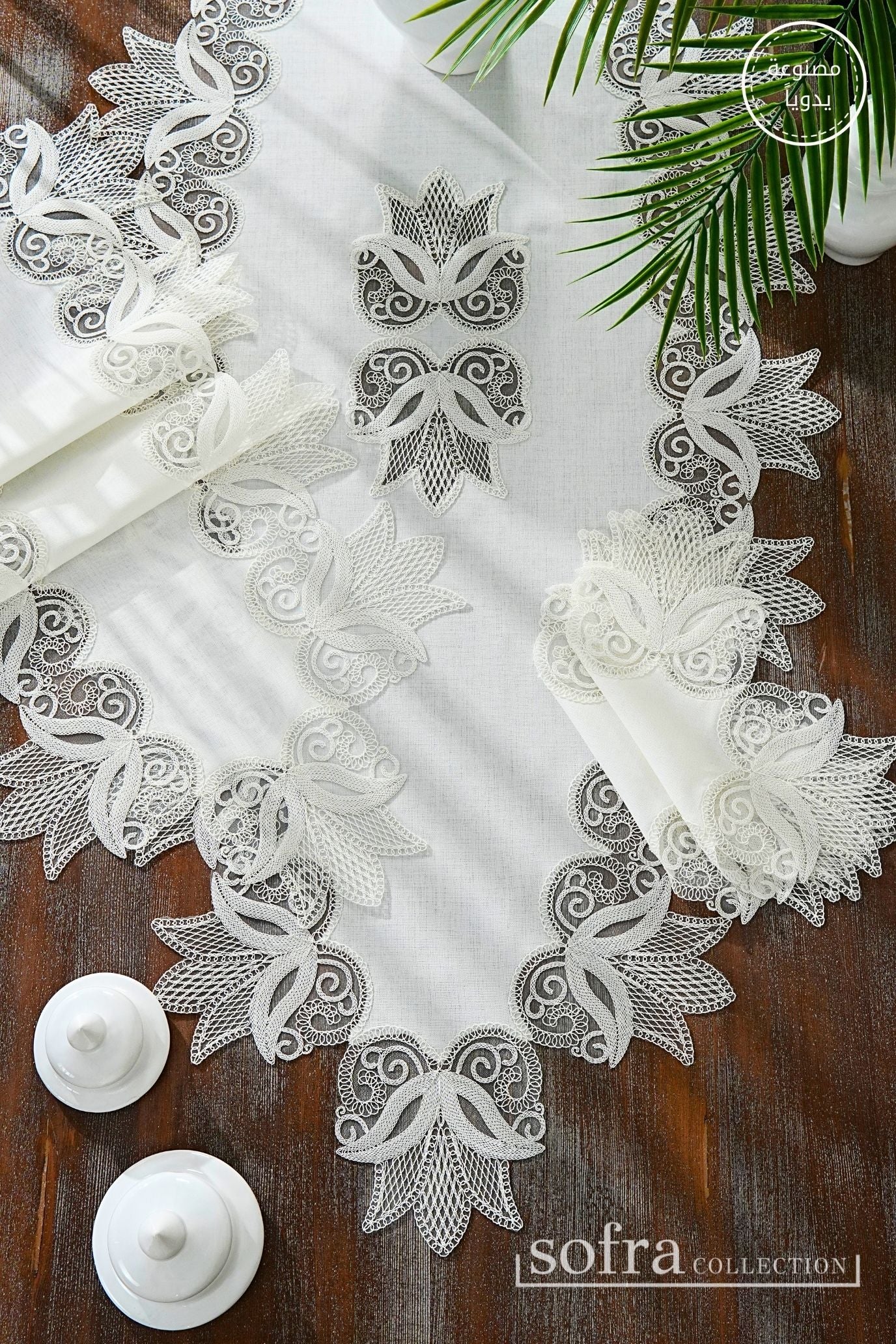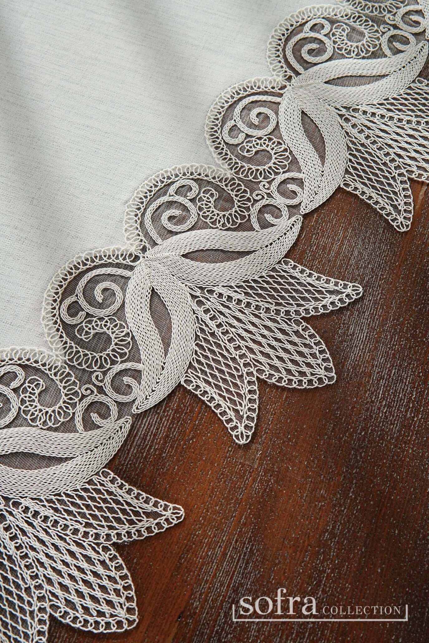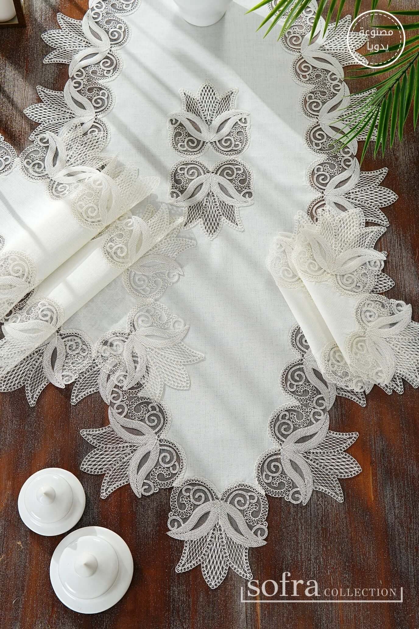 طقم مفارش صالون ٥ قطع مزين بدانتيل اوف وايت – موديل لالى - قماش كتان فاخر مقاوم للبقع