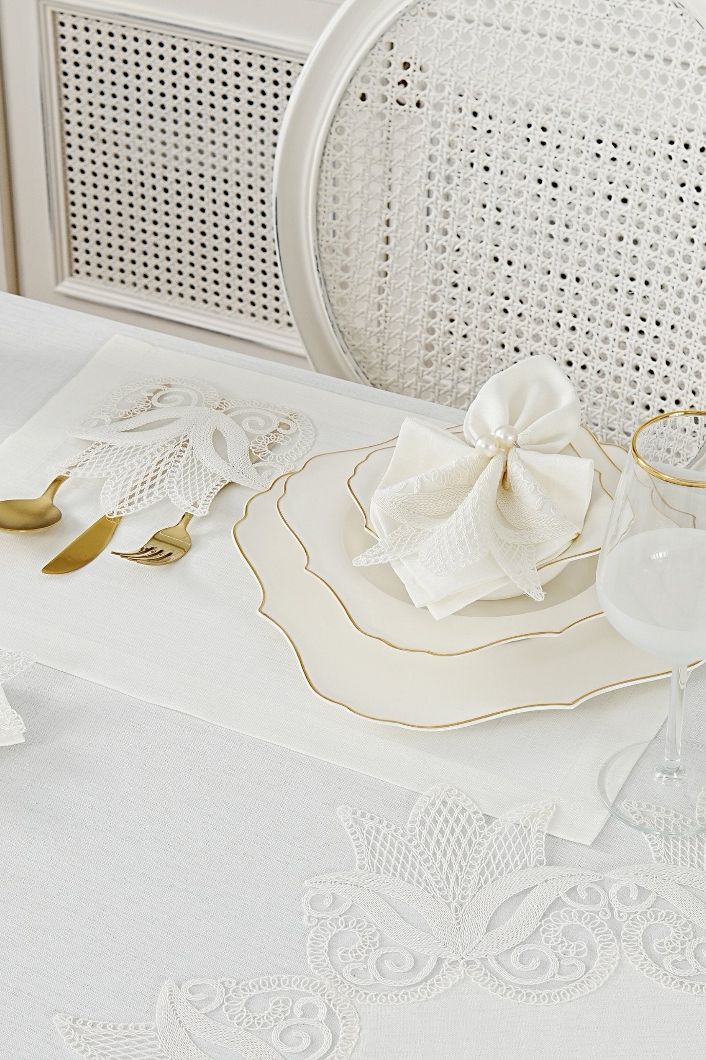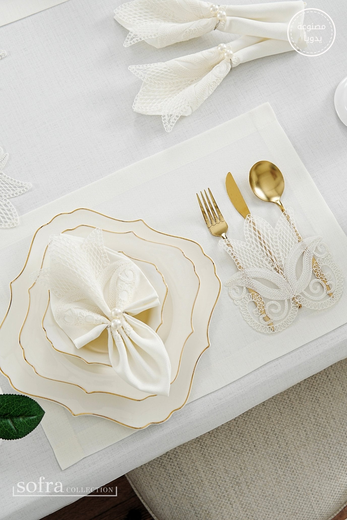 طقم مفارش سفرة كامل مزين بدانتيل اوف وايت - موديل لالى – ٣٨ قطعة – ١٢ شخص - قماش كتان مقاوم للبقع
