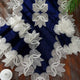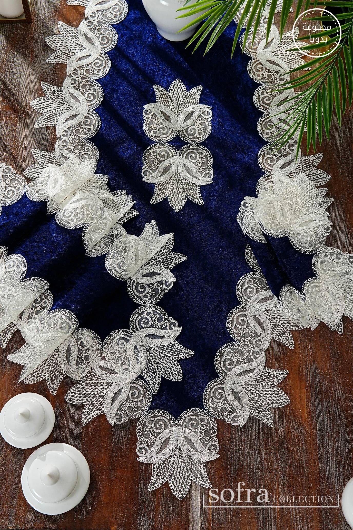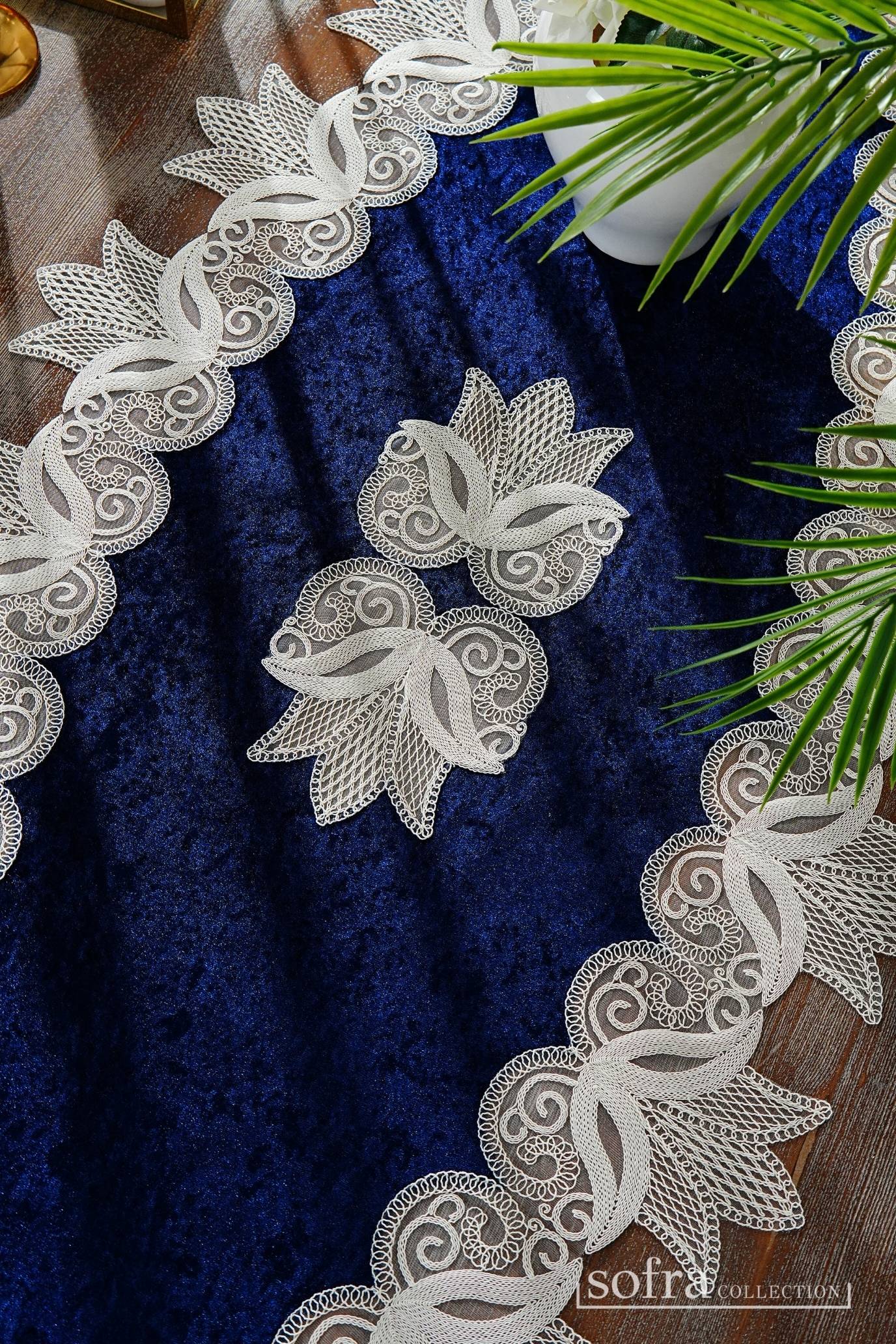 طقم مفارش صالون ٥ قطع مزين بدانتيل اوف وايت – موديل لالى - قماش قطيفة فاخر ازرق داكن اللون