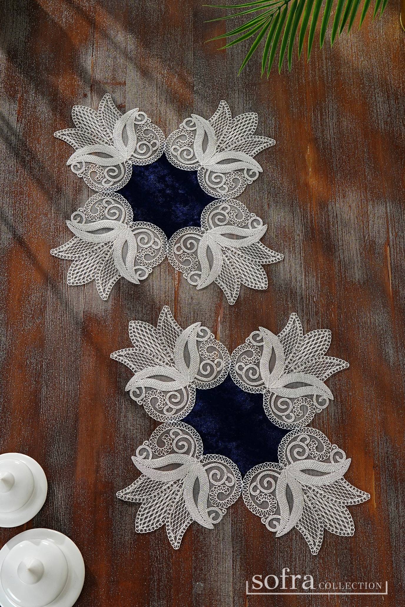طقم مفارش صالون قماش قطيفة مزين بالدانتيل ٥ قطع