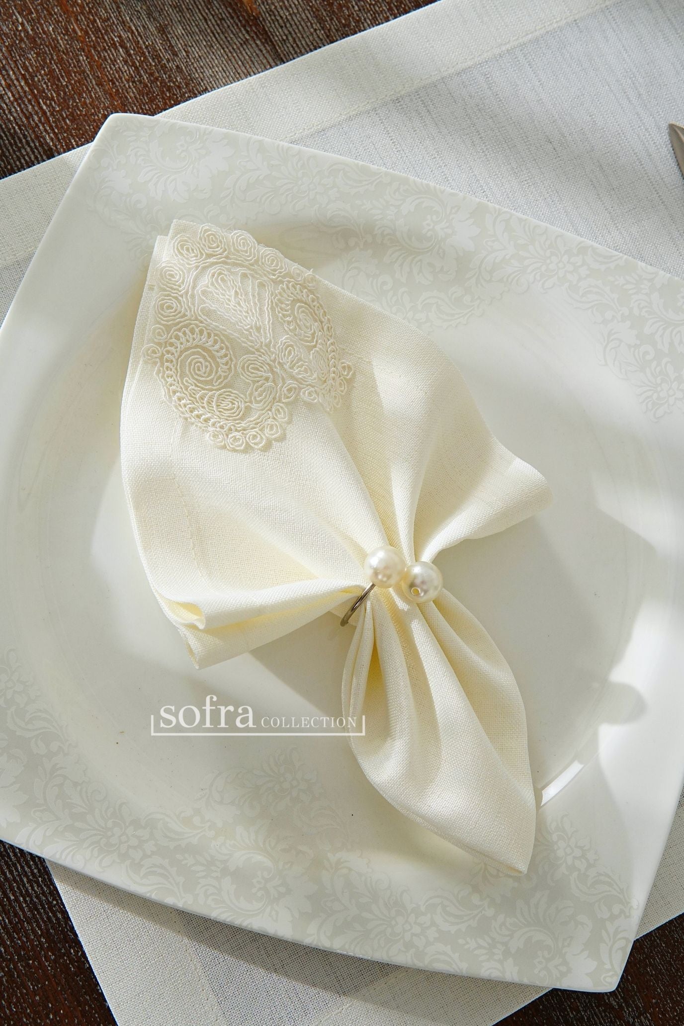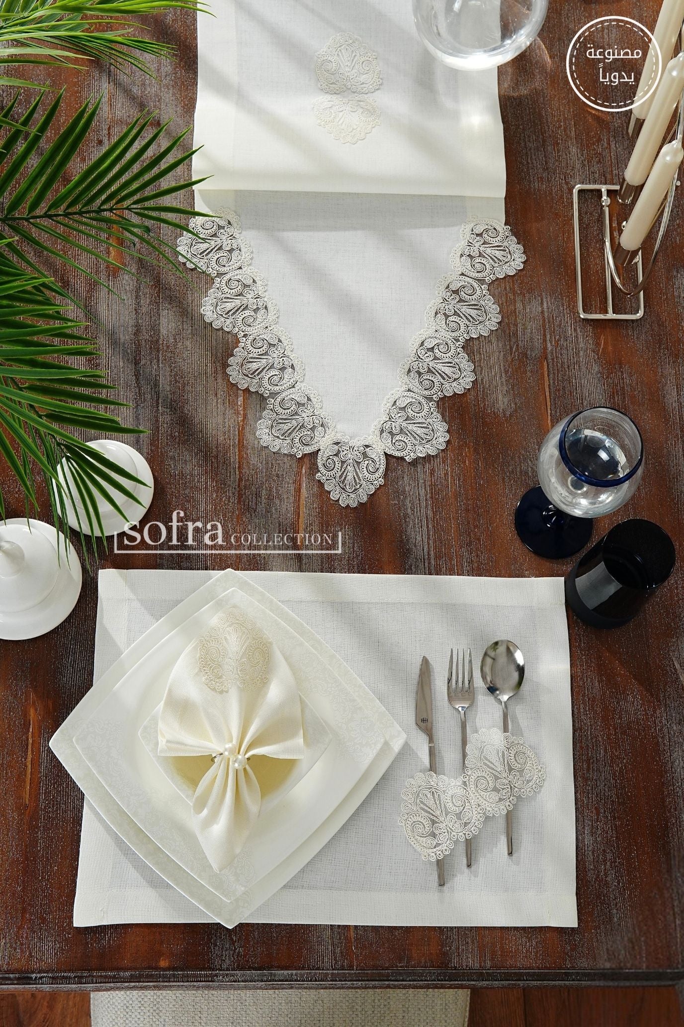 طقم مفارش سفرة مزين بدانتيل اوف وايت - موديل لايرا – شامل المناديل - ٣٧ قطعة – ١٢ شخص - قماش كتان مقاوم للبقع