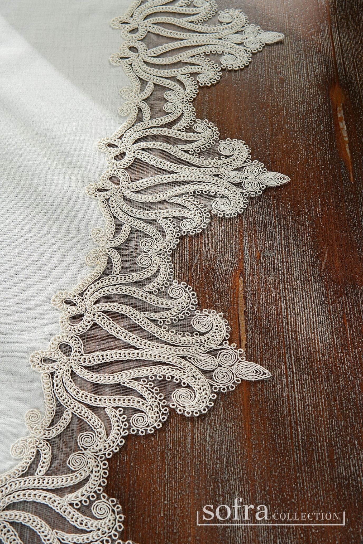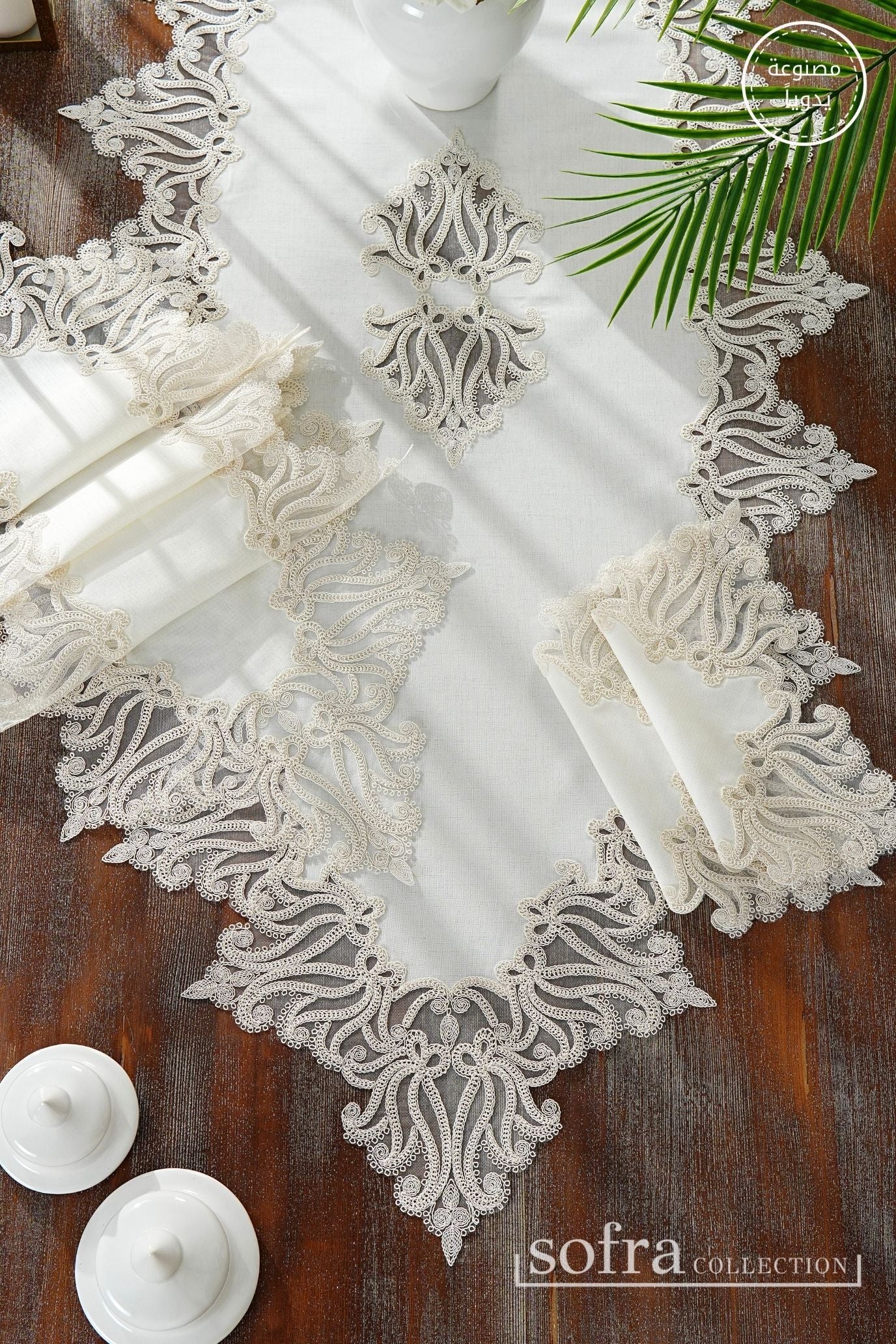 طقم مفارش صالون ٥ قطع مزين بدانتيل اوف وايت – موديل لونا - قماش كتان فاخر مقاوم للبقع