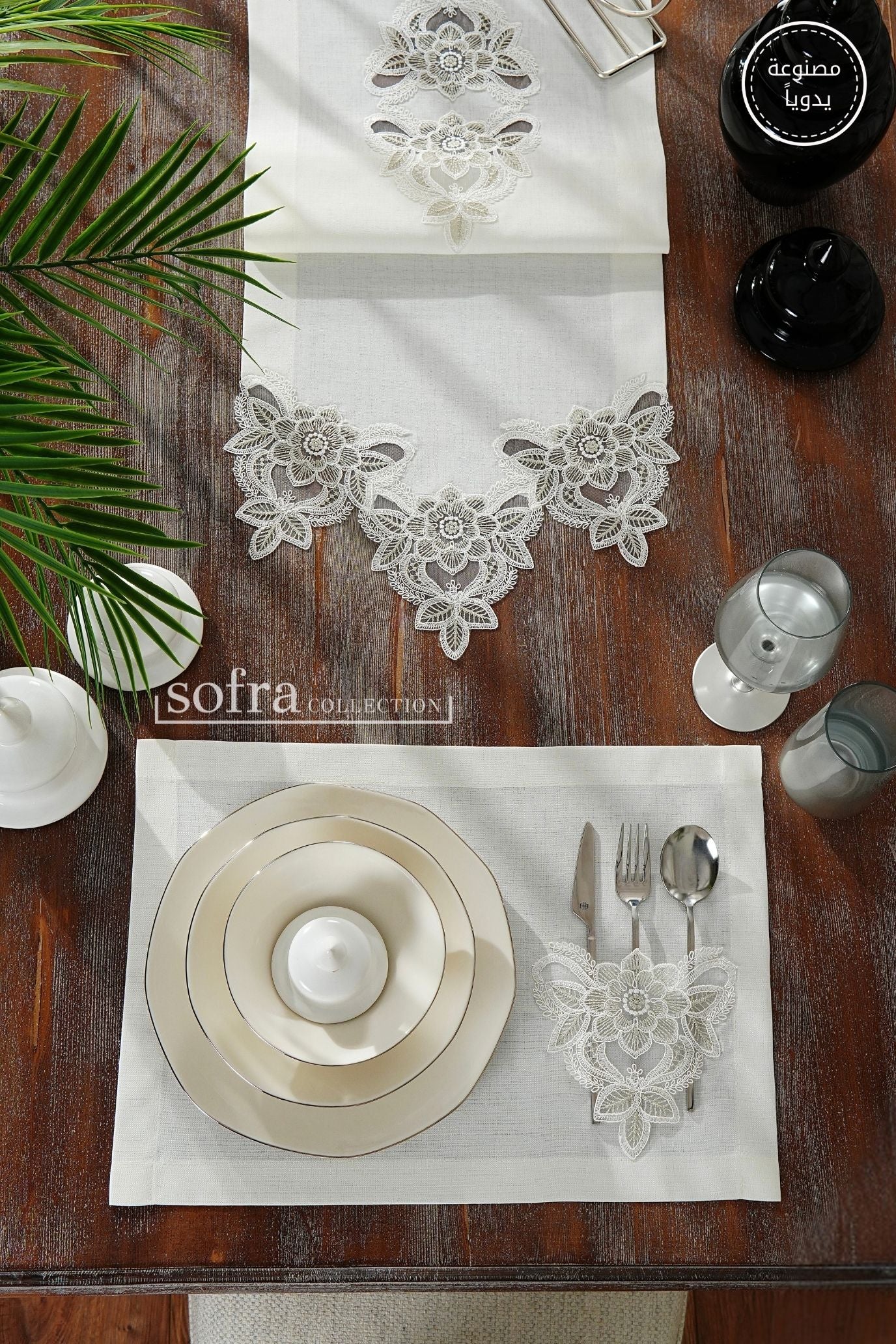 طقم مفارش سفرة مزين بدانتيل فضى واوف وايت - موديل زهرة البنفسج – بدون مناديل - ١٣ قطعة – ١٢ شخص - قماش كتان مقاوم للبقع