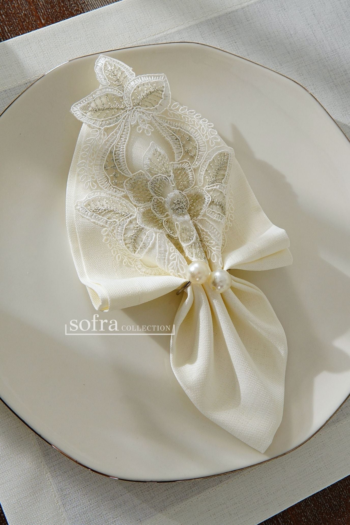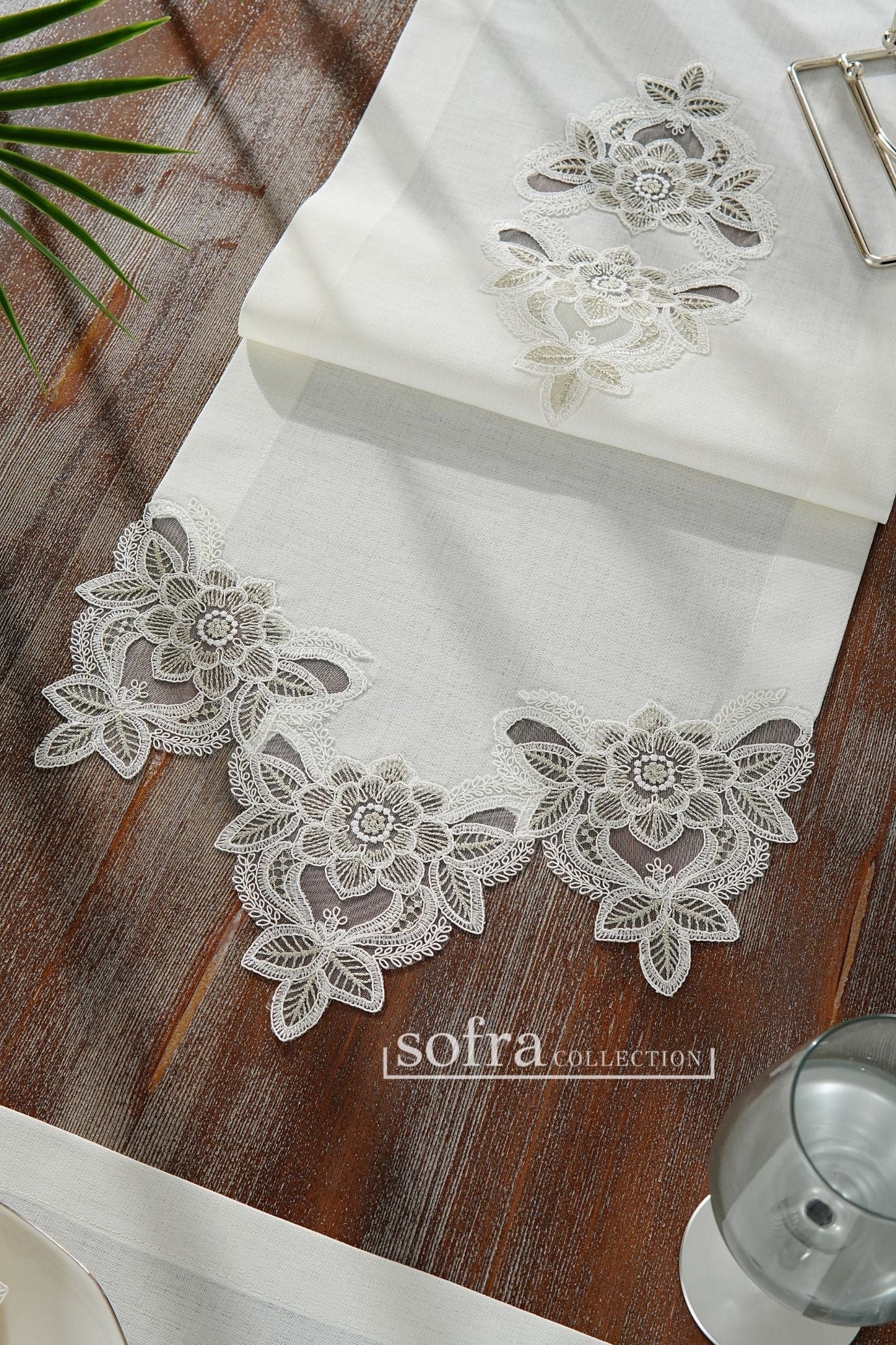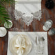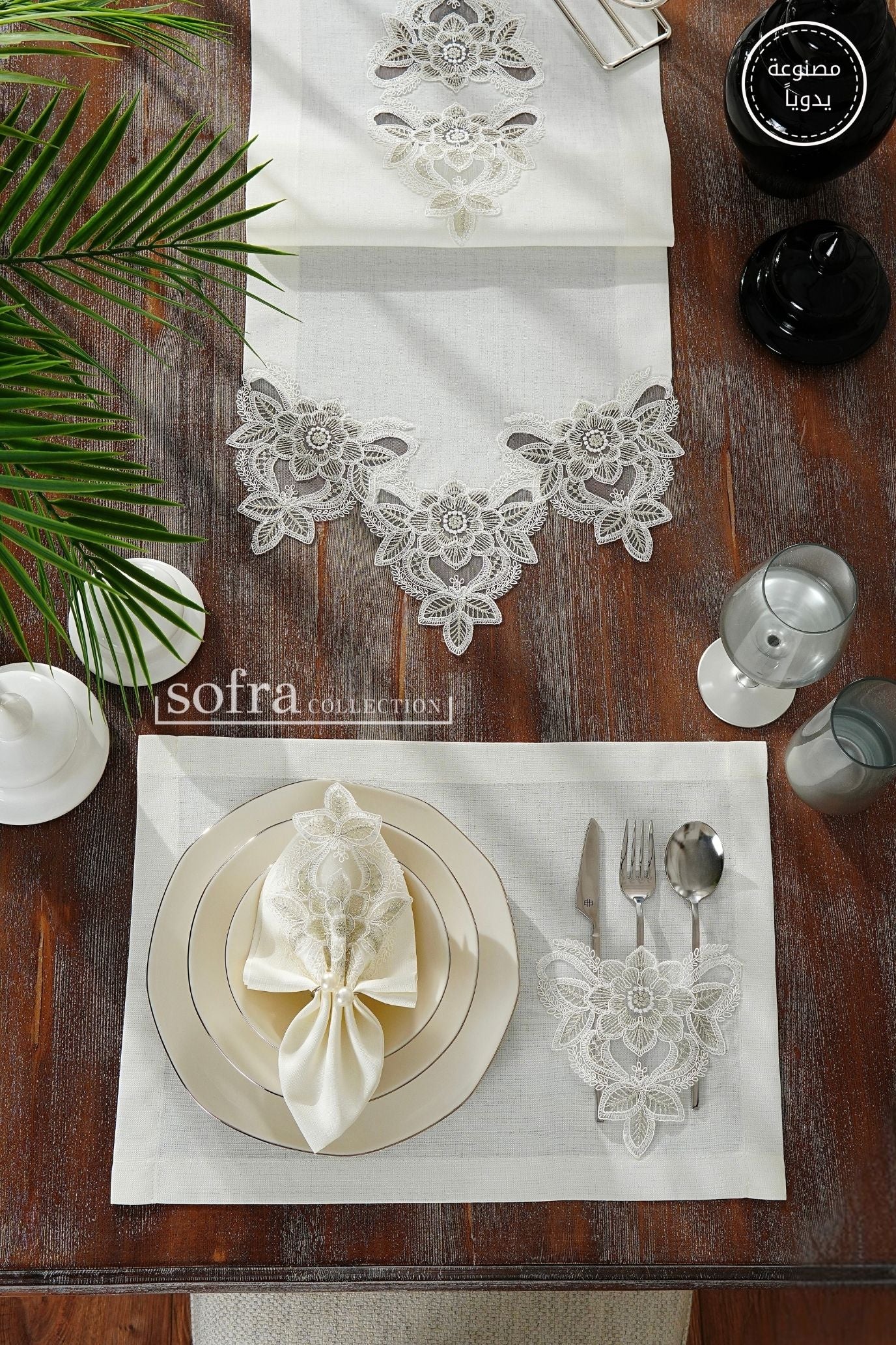 طقم مفارش سفرة مزين بدانتيل فضى واوف وايت - موديل زهرة البنفسج – شامل المناديل - ٣٧ قطعة – ١٢ شخص - قماش كتان مقاوم للبقع