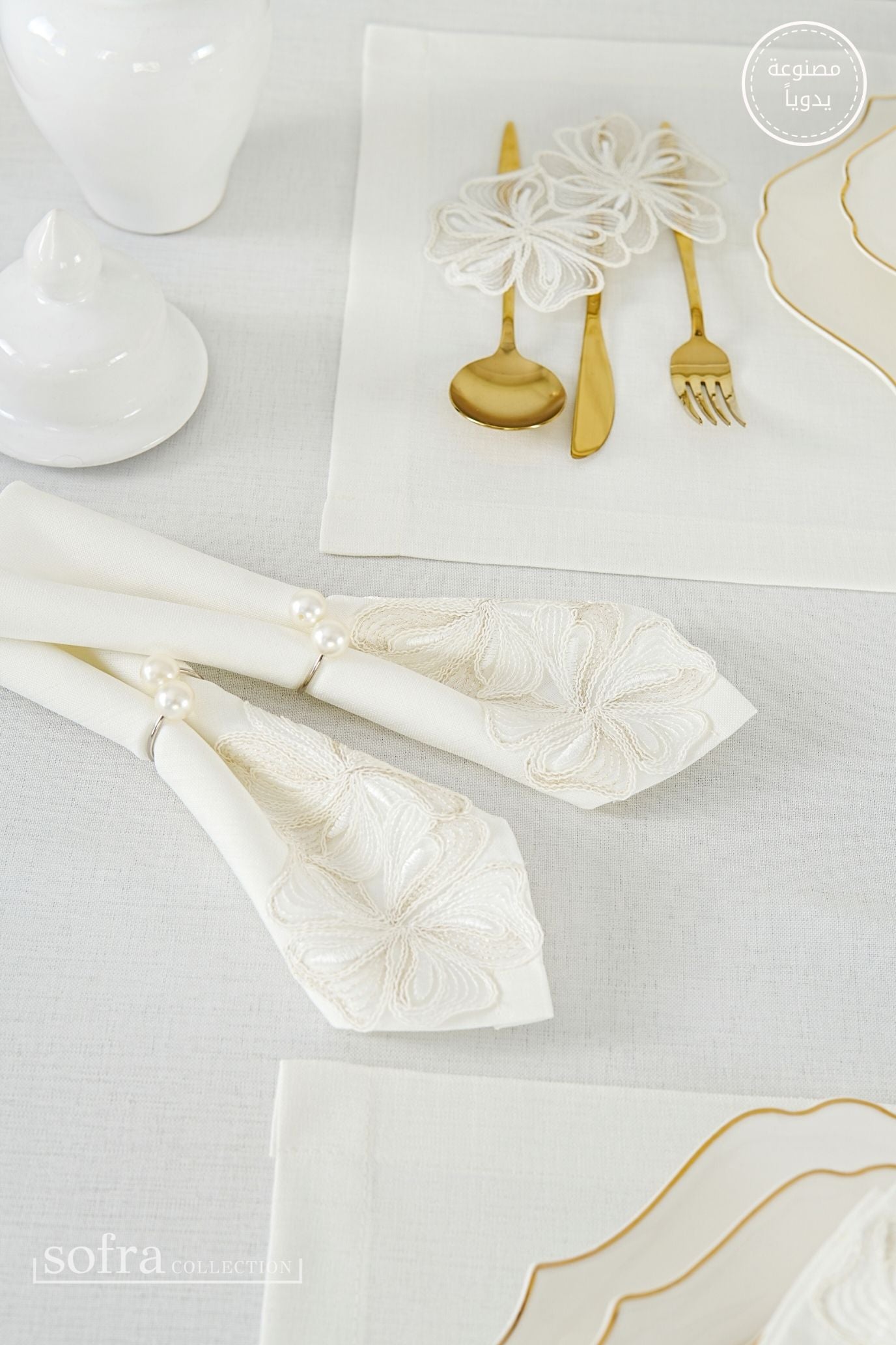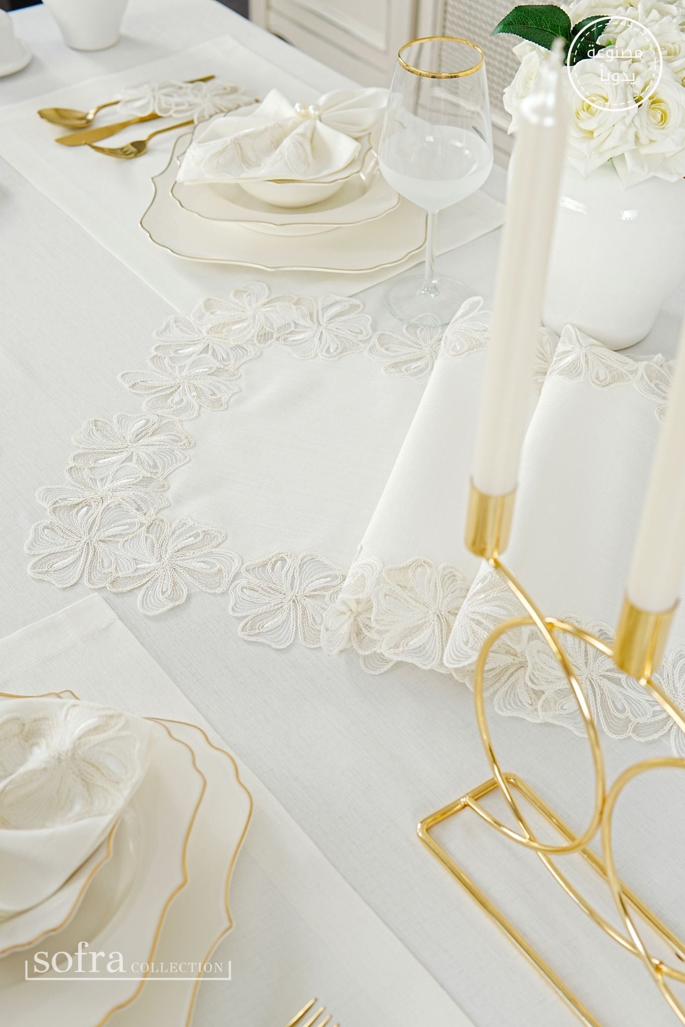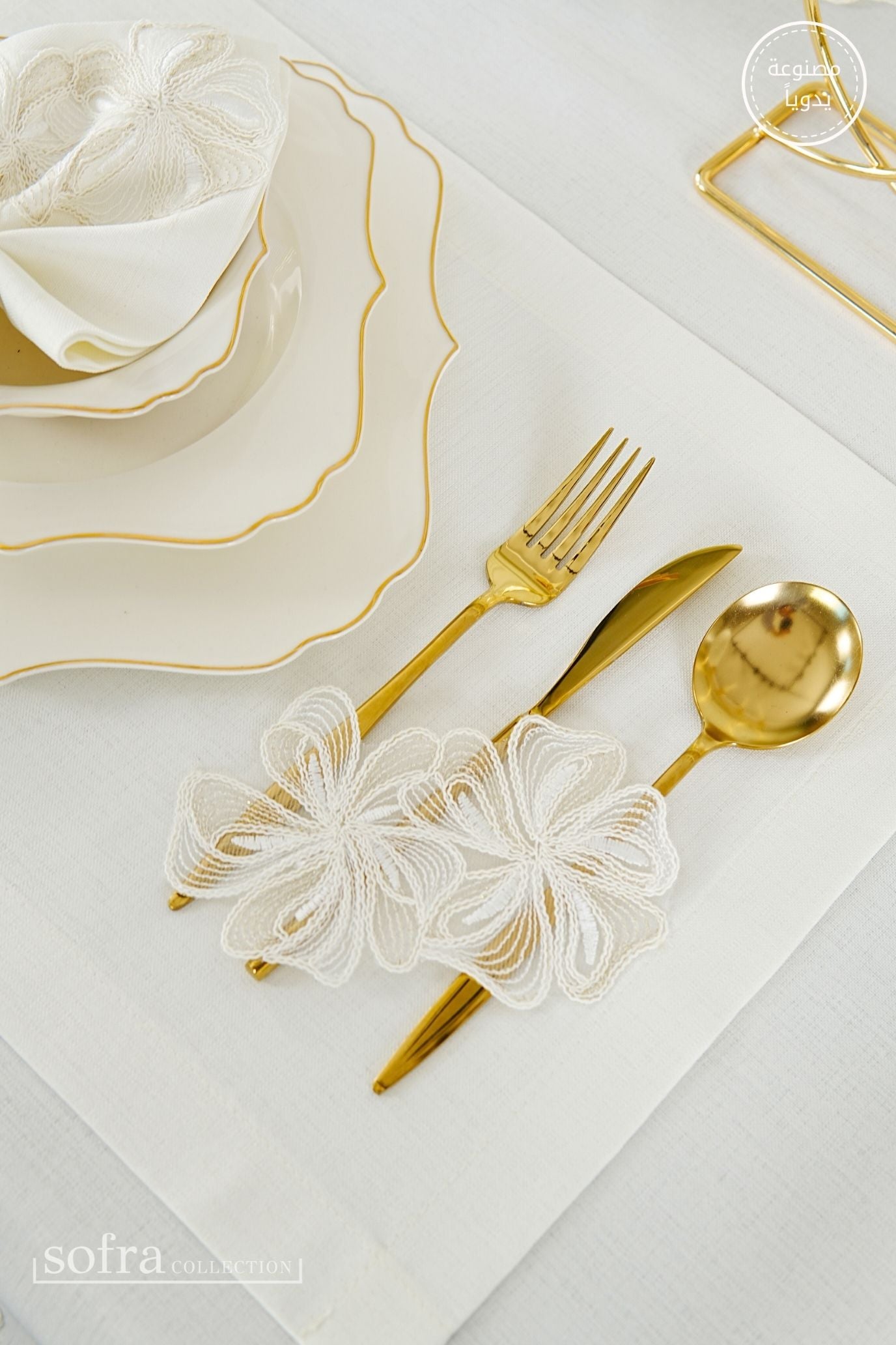 طقم مفارش سفرة كامل مزين بدانتيل ذهبى وأوف وايت - موديل اوركيد – ٣٨ قطعة – ١٢ شخص - قماش كتان مقاوم للبقع