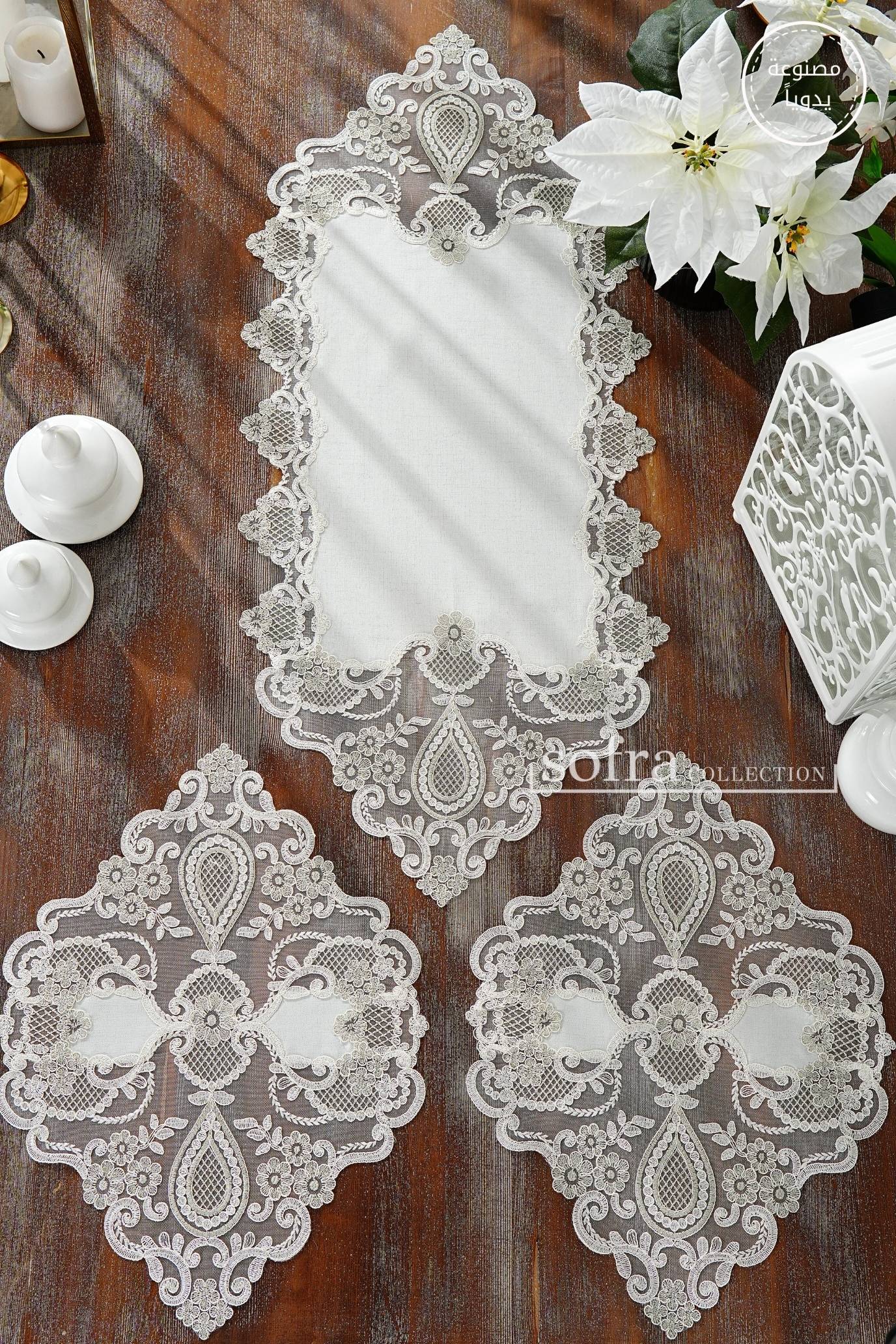 طقم مفارش ٣ قطع مزين بدانتيل فضى واوف وايت – موديل سفير - قماش كتان فاخر مقاوم للبقع