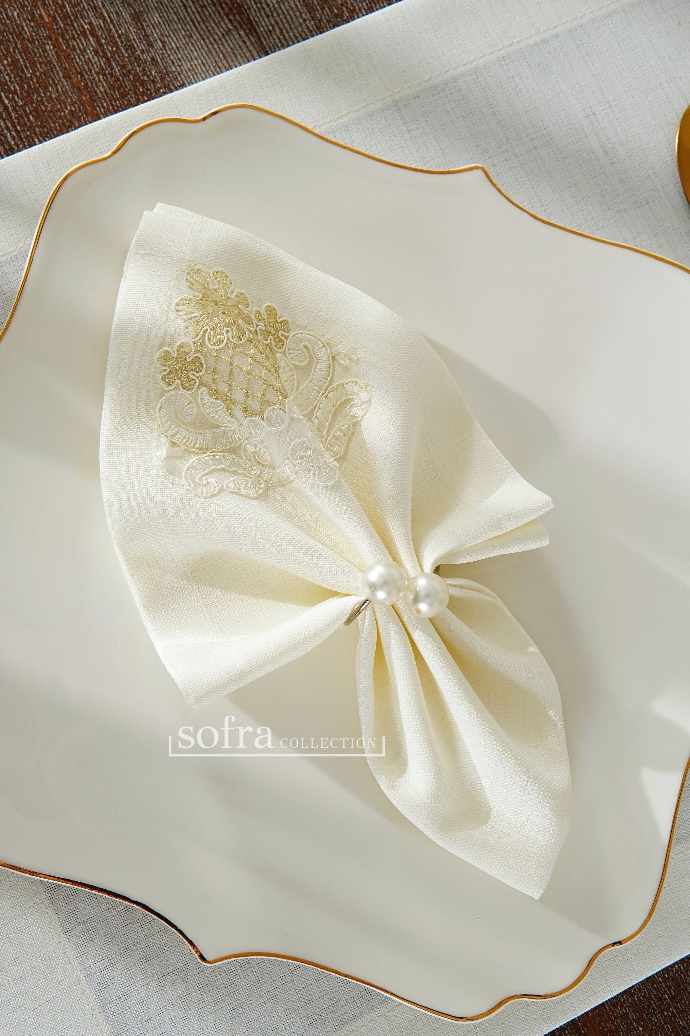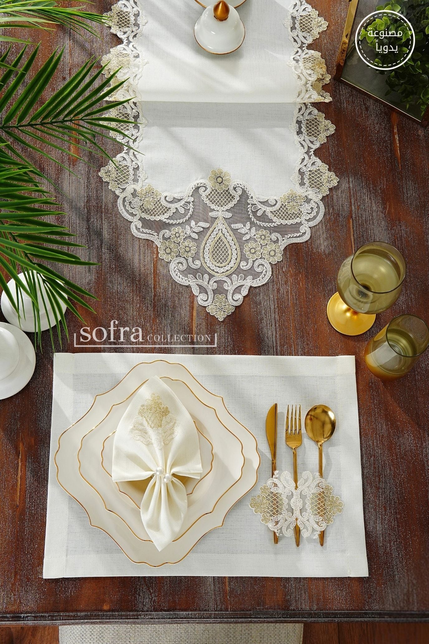 طقم مفارش سفرة مزين بدانتيل ذهبى - موديل سفير – شامل المناديل - ٣٧ قطعة – ١٢ شخص - قماش كتان مقاوم للبقع