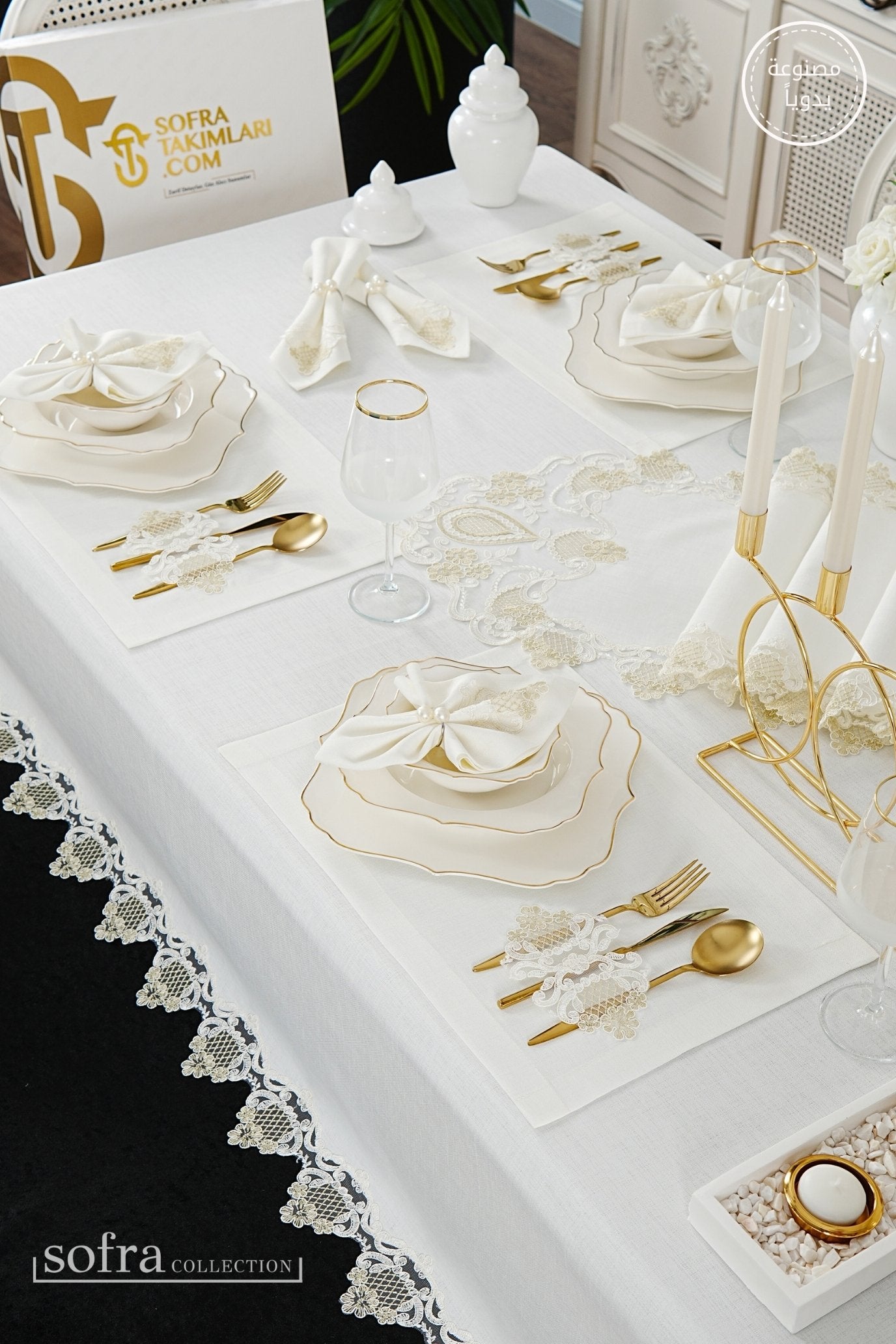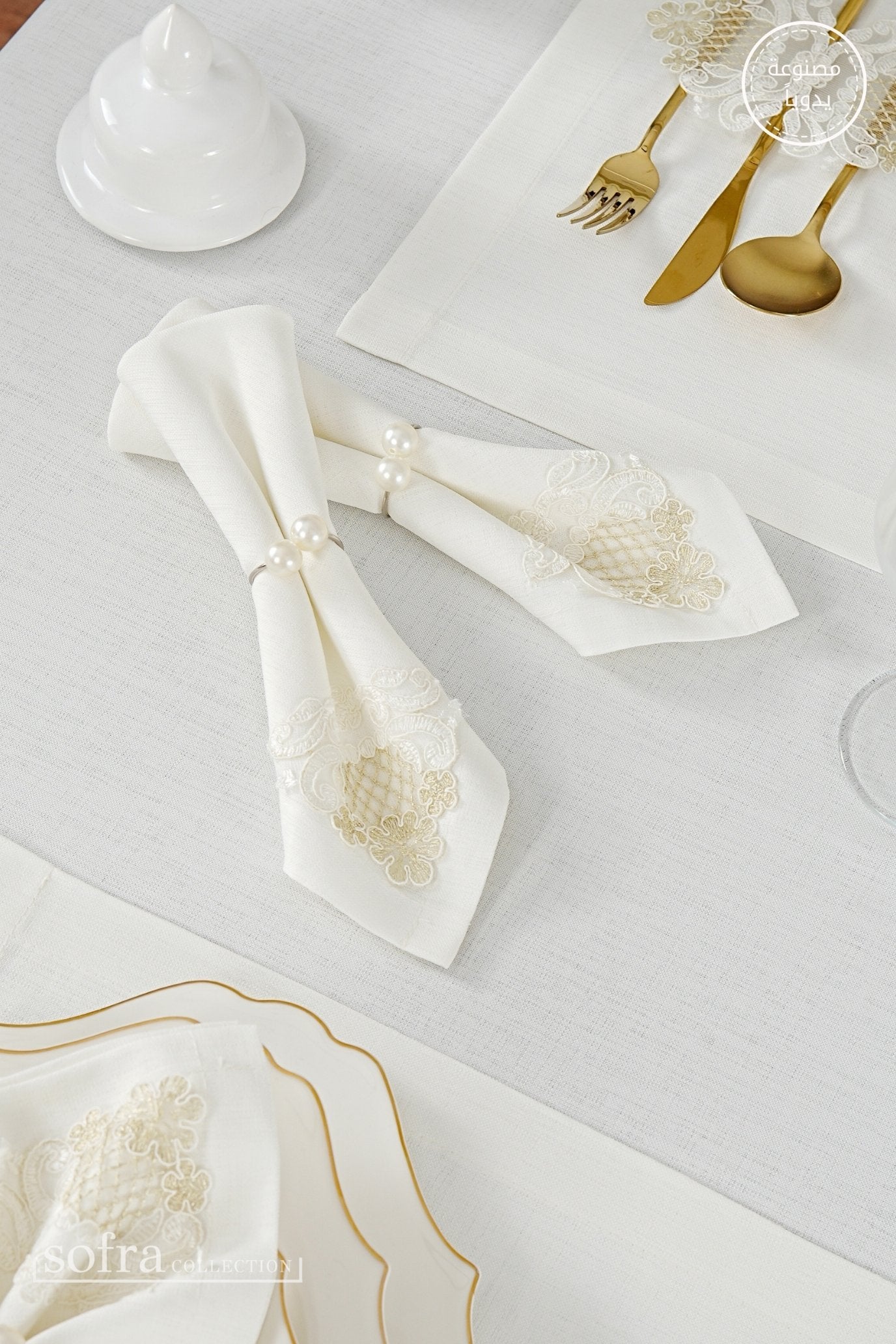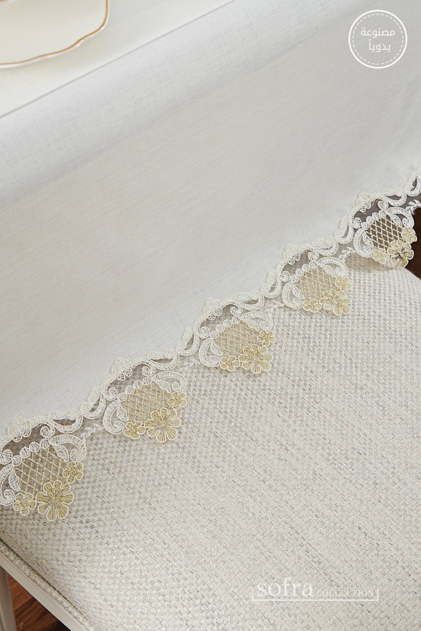 طقم مفارش سفرة كامل مزين بدانتيل ذهبى وأوف وايت - موديل سفير – ٣٨ قطعة – ١٢ شخص - قماش كتان مقاوم للبقع