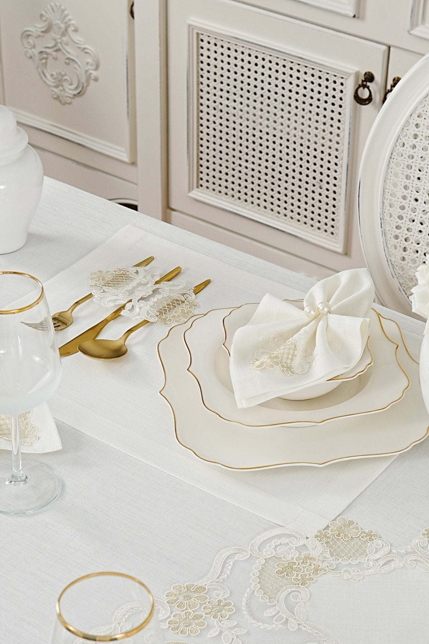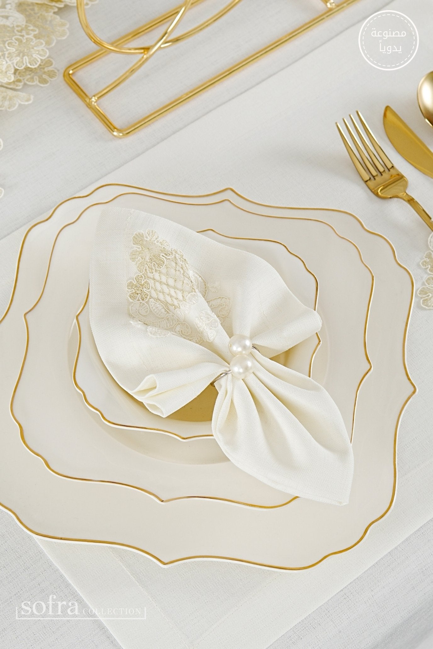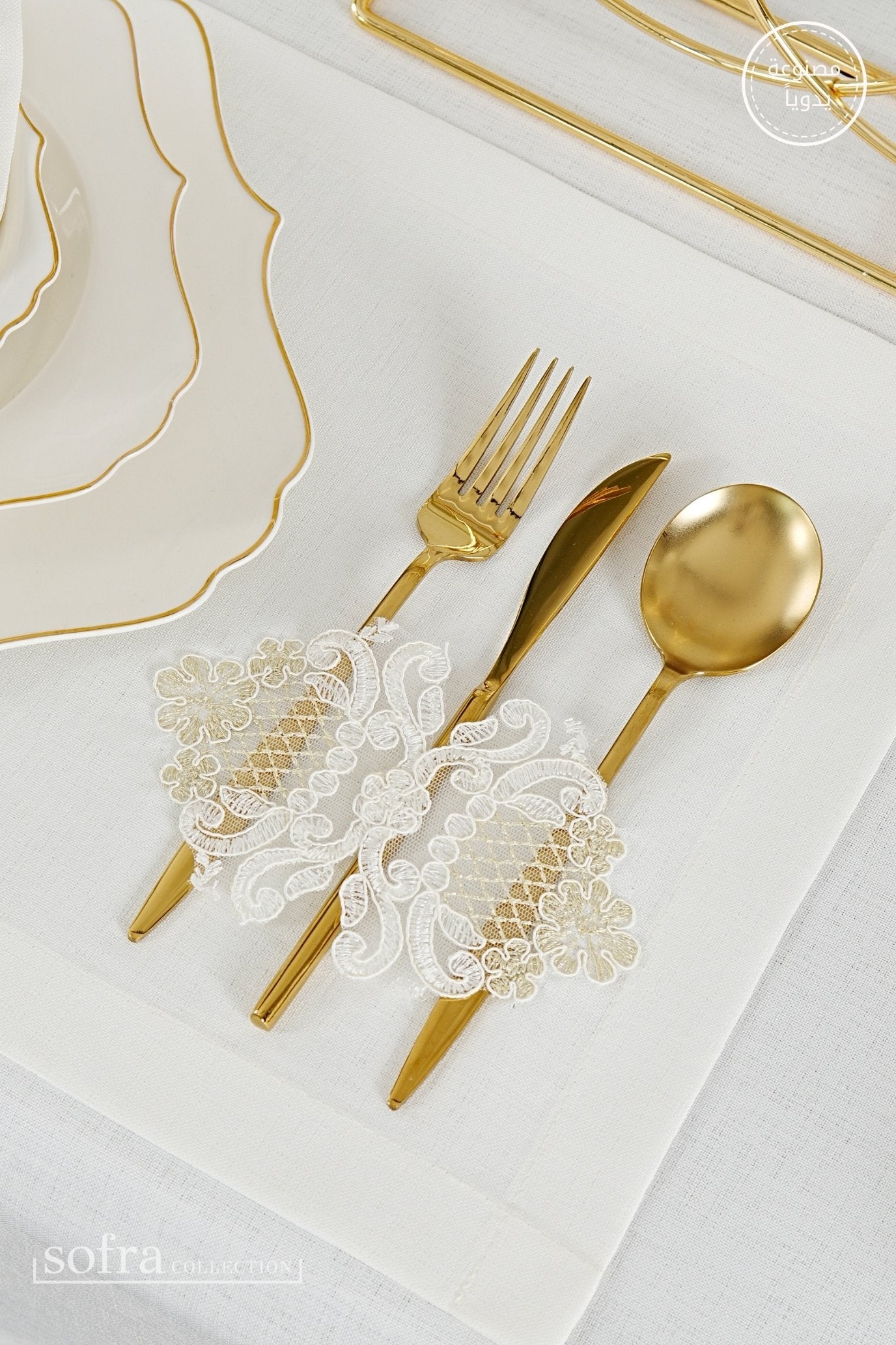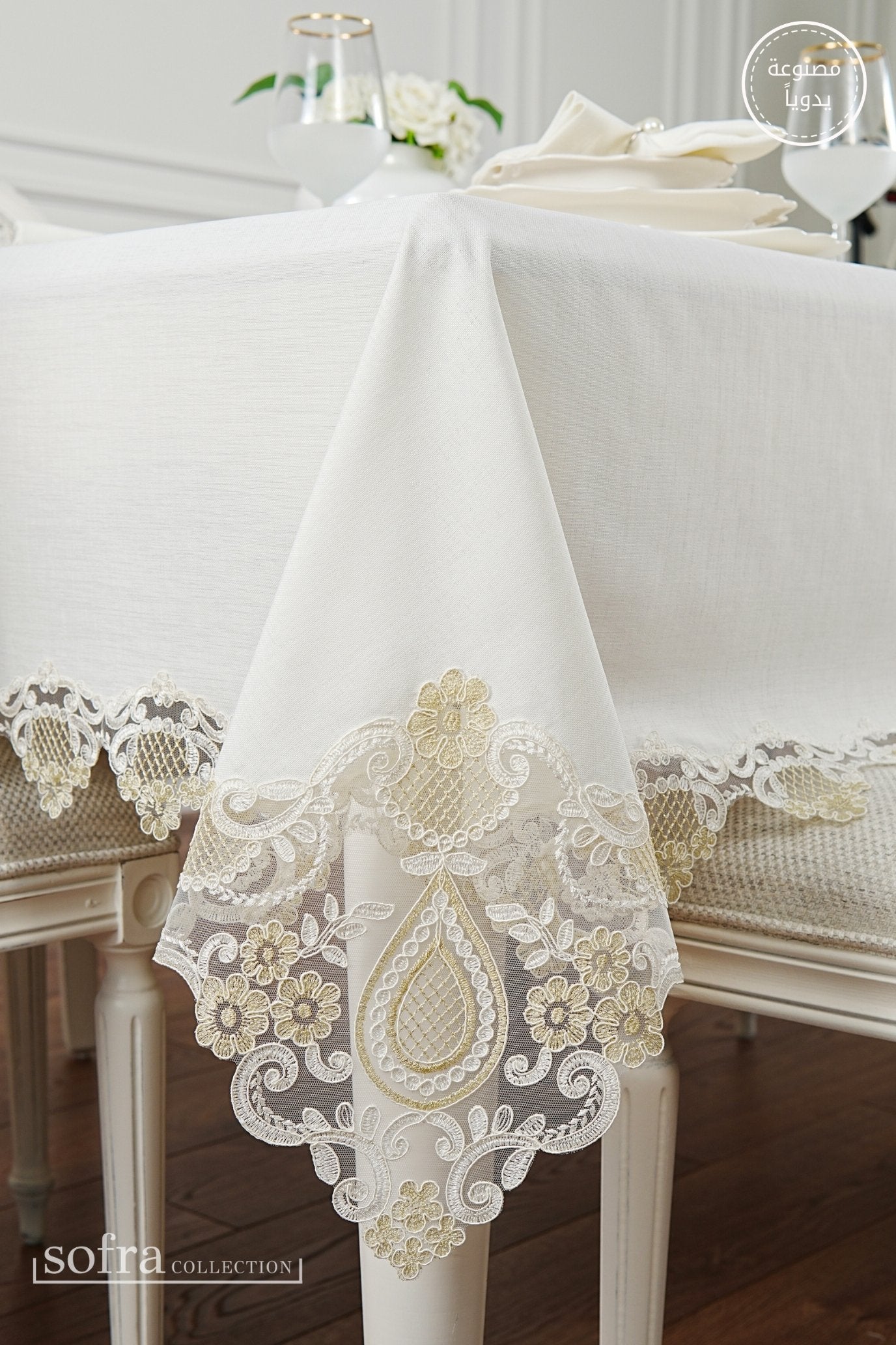 طقم مفارش سفرة كامل مزين بدانتيل ذهبى وأوف وايت - موديل سفير – ٣٨ قطعة – ١٢ شخص - قماش كتان مقاوم للبقع