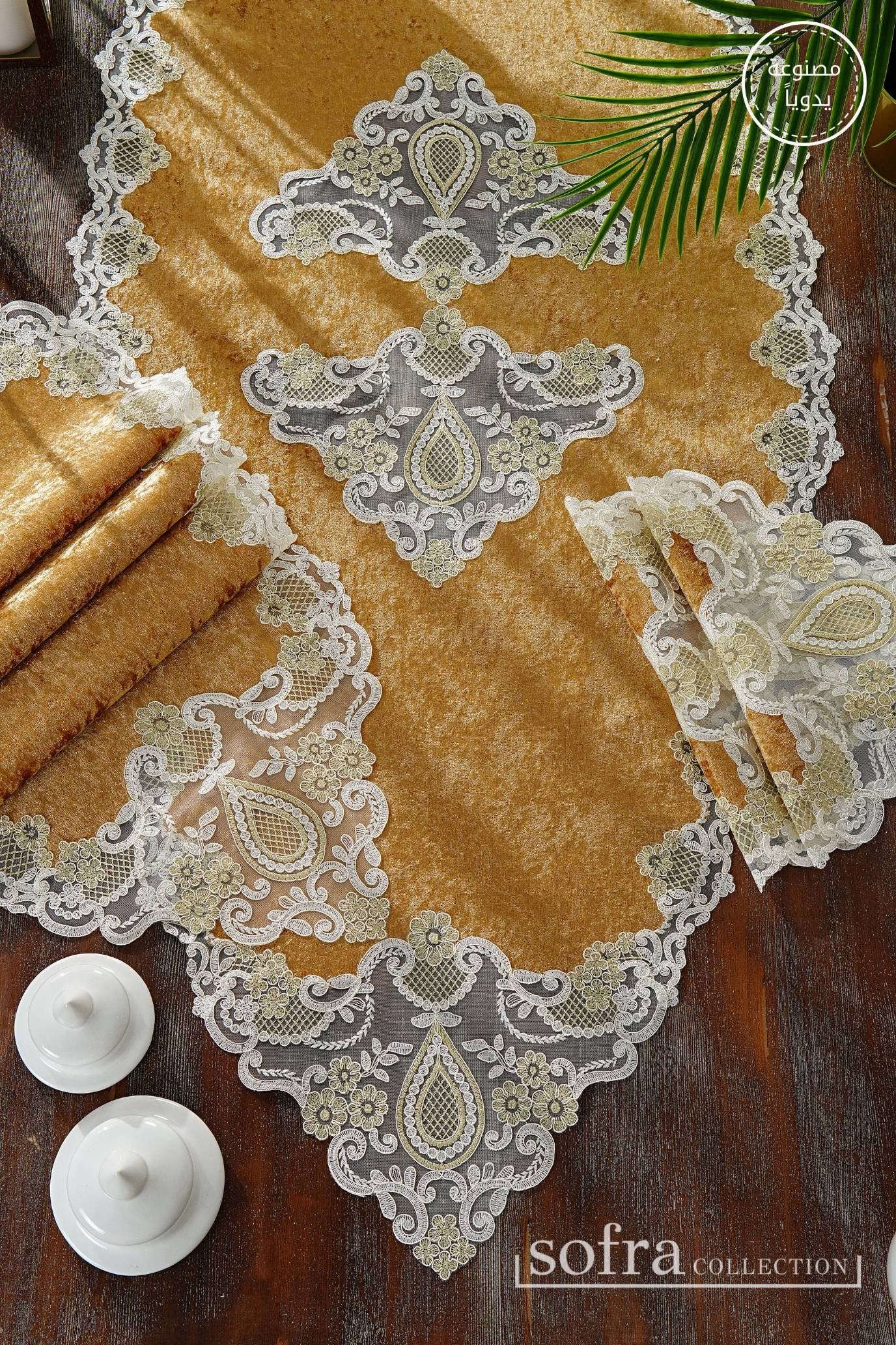 طقم مفارش صالون قماش قطيفة مزين بالدانتيل ٥ قطع