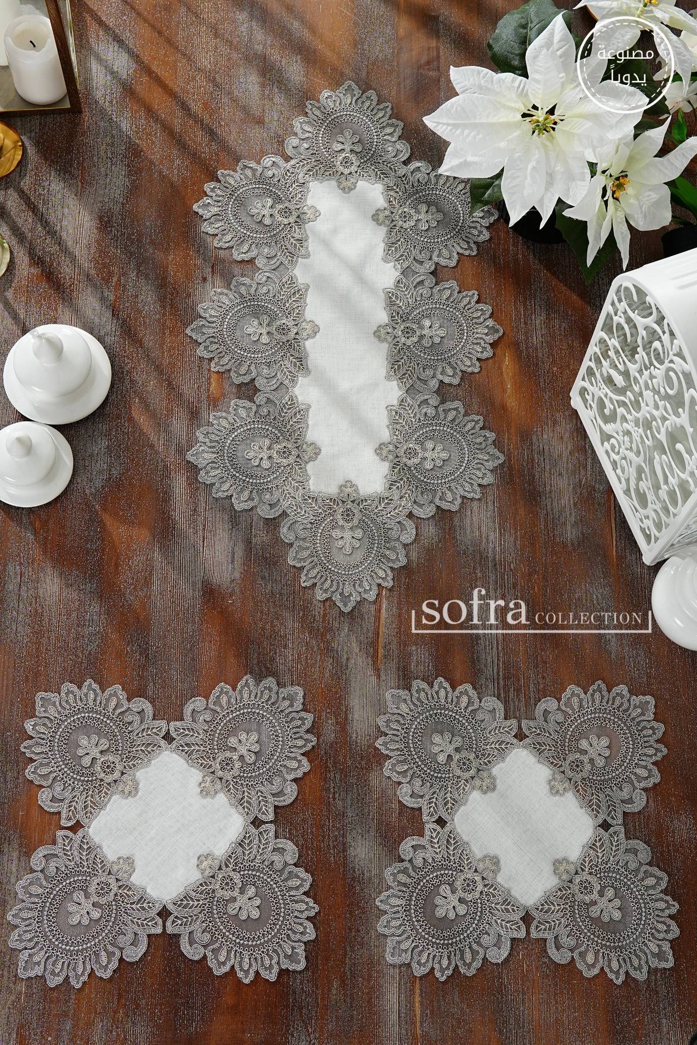 طقم مفارش ٣ قطع مزين بدانتيل رمادى وفضى – موديل شاهمران - قماش كتان فاخر مقاوم للبقع