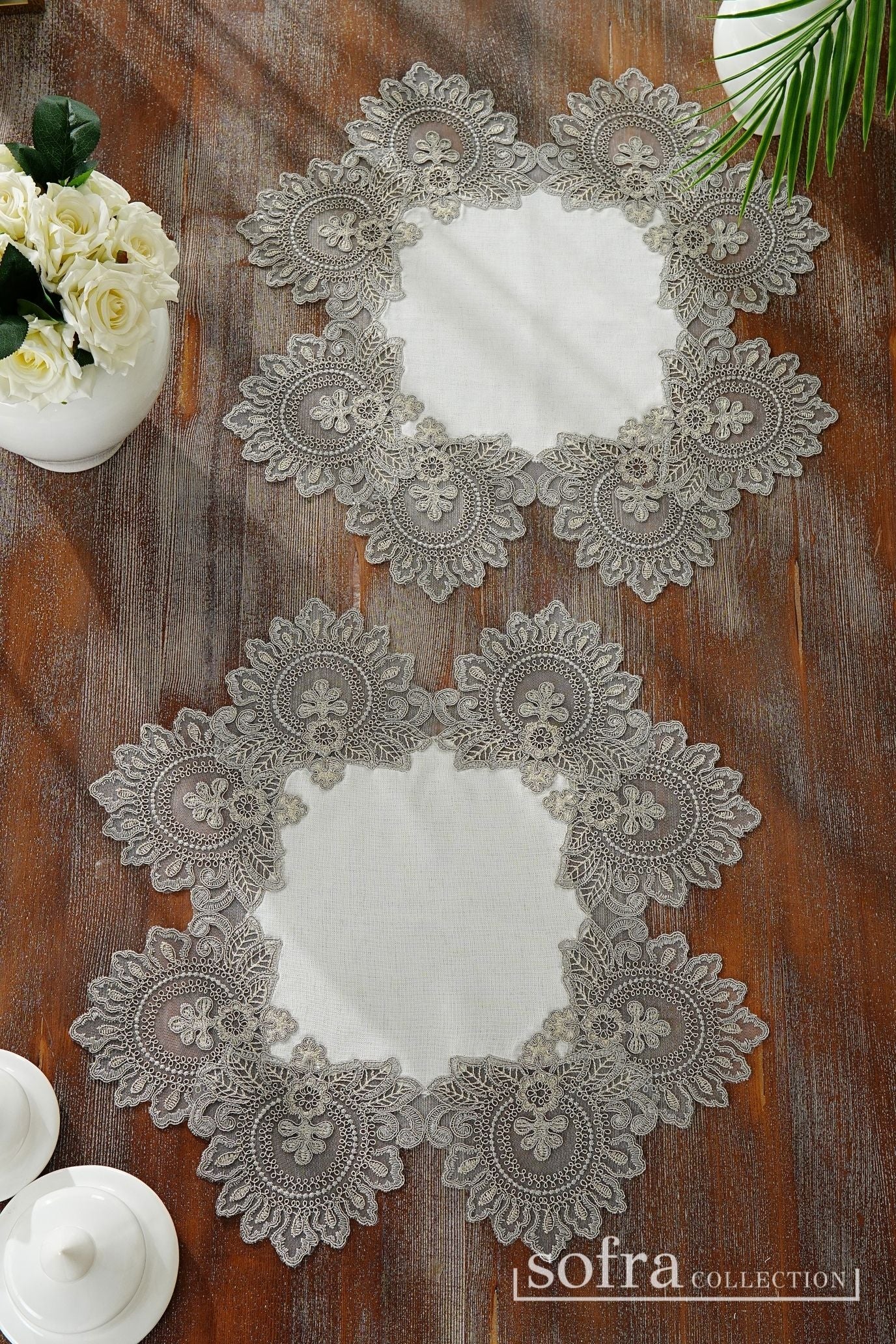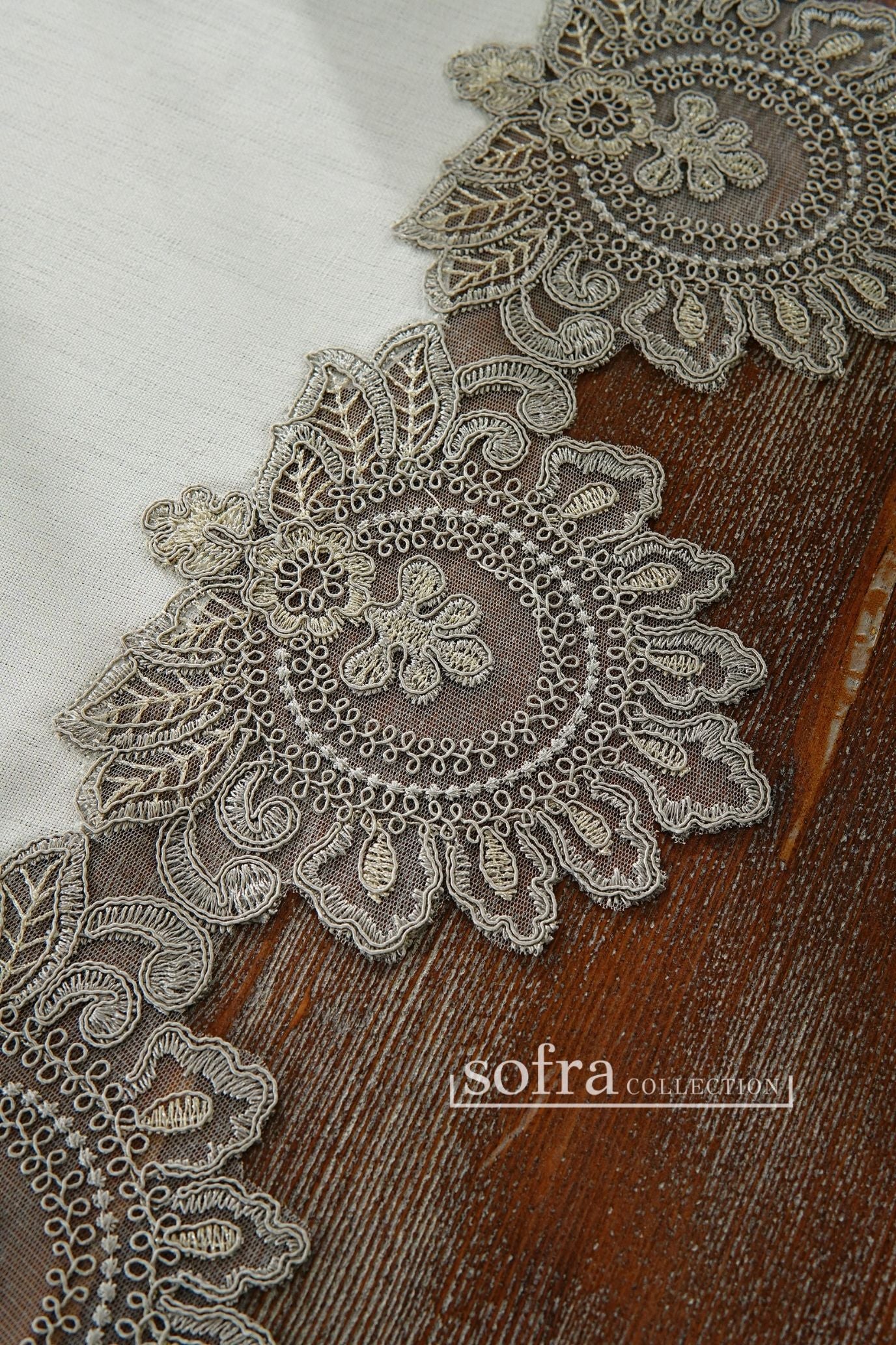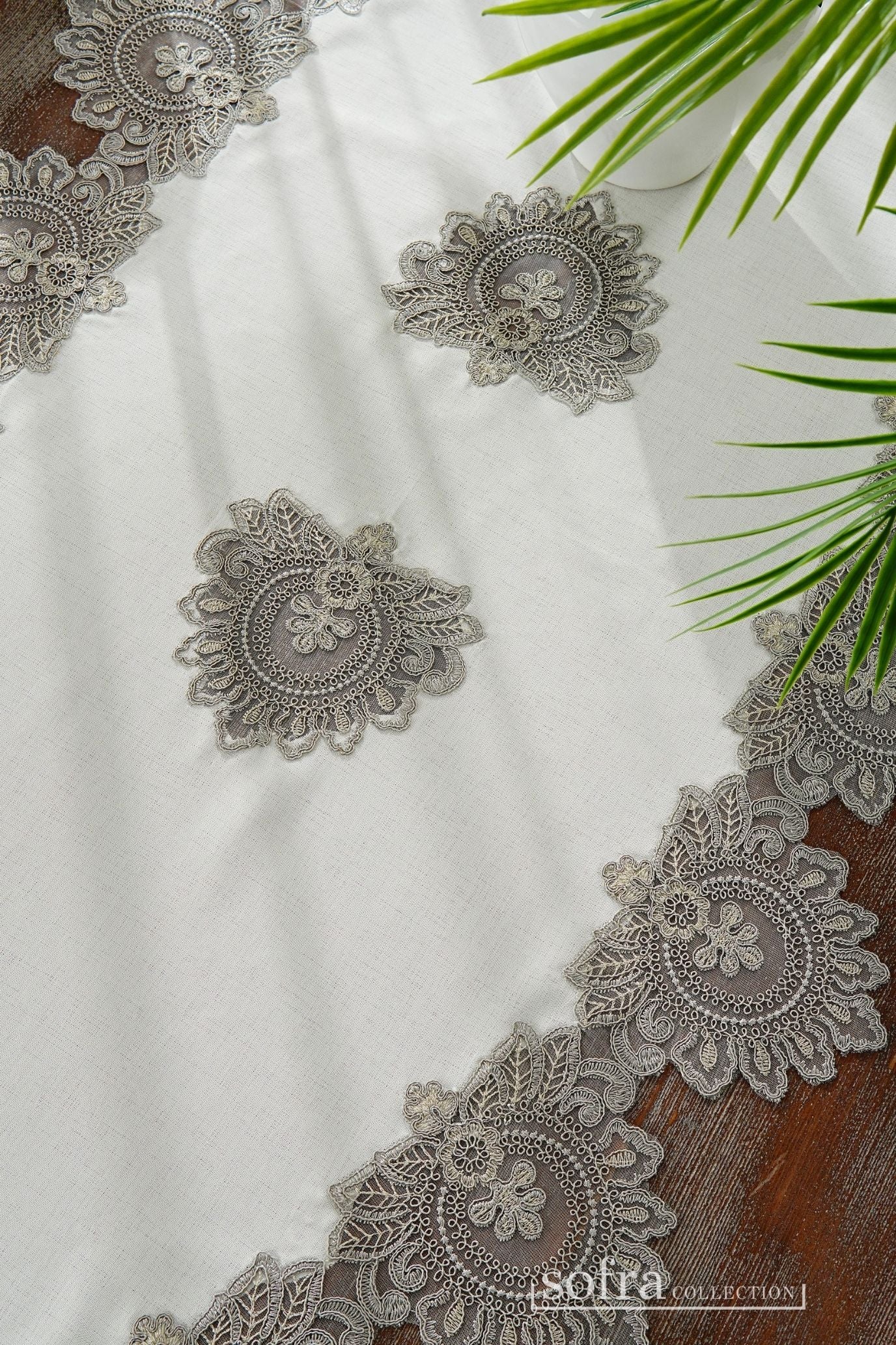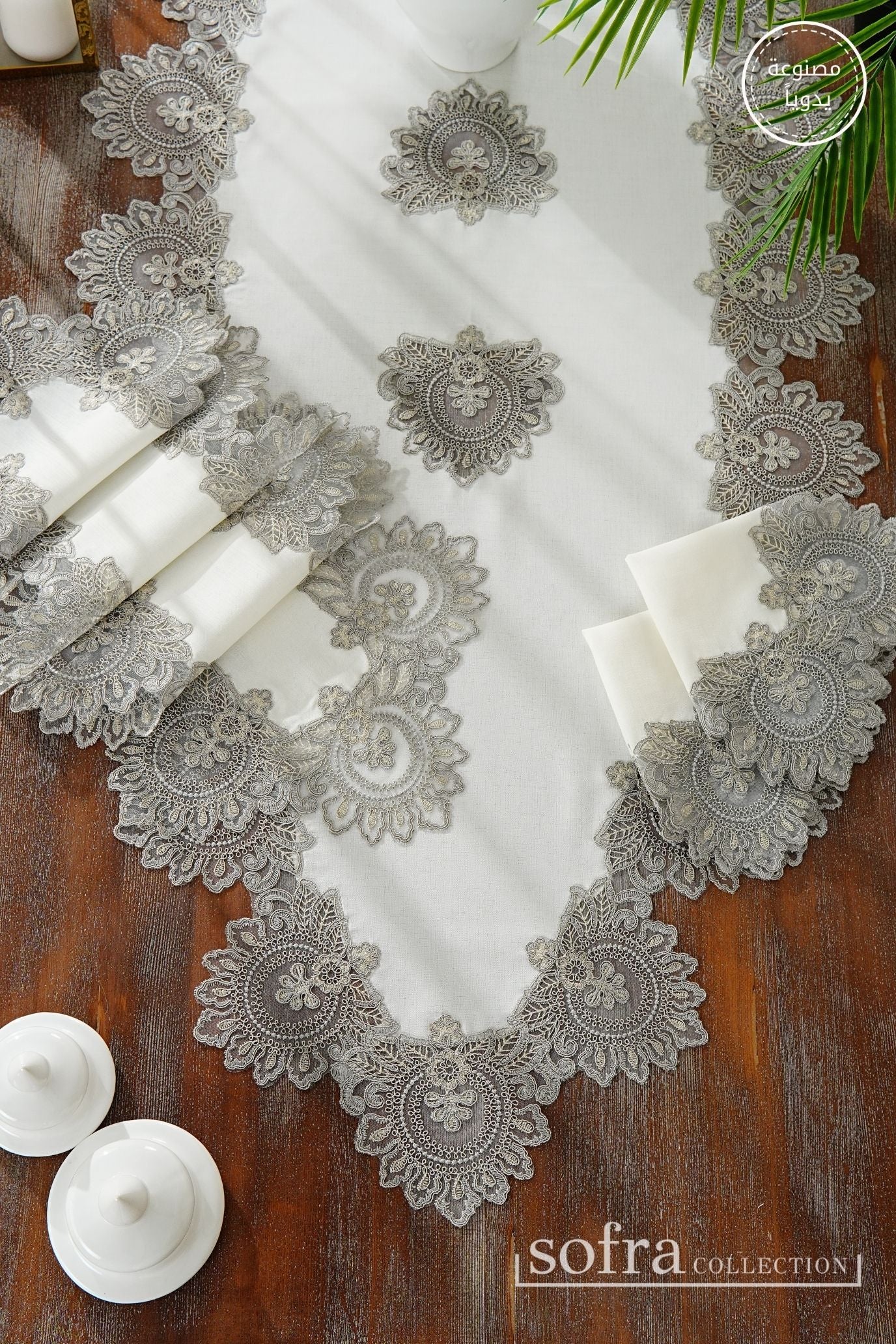 طقم مفارش صالون ٥ قطع مزين بدانتيل رمادى وفضى – موديل شاهمران - قماش كتان فاخر مقاوم للبقع