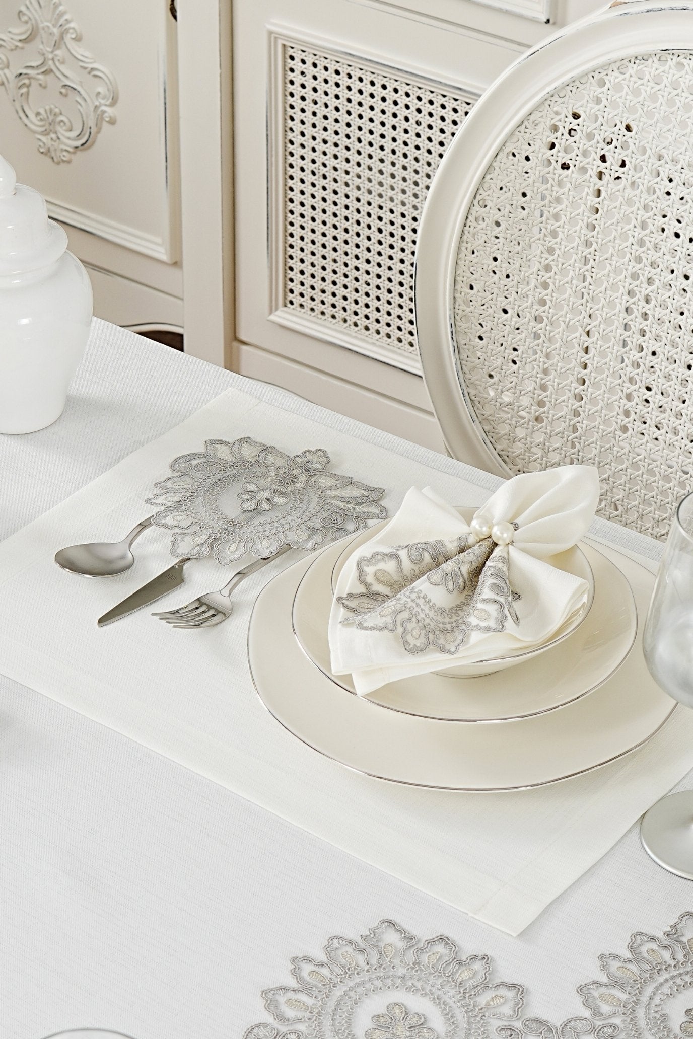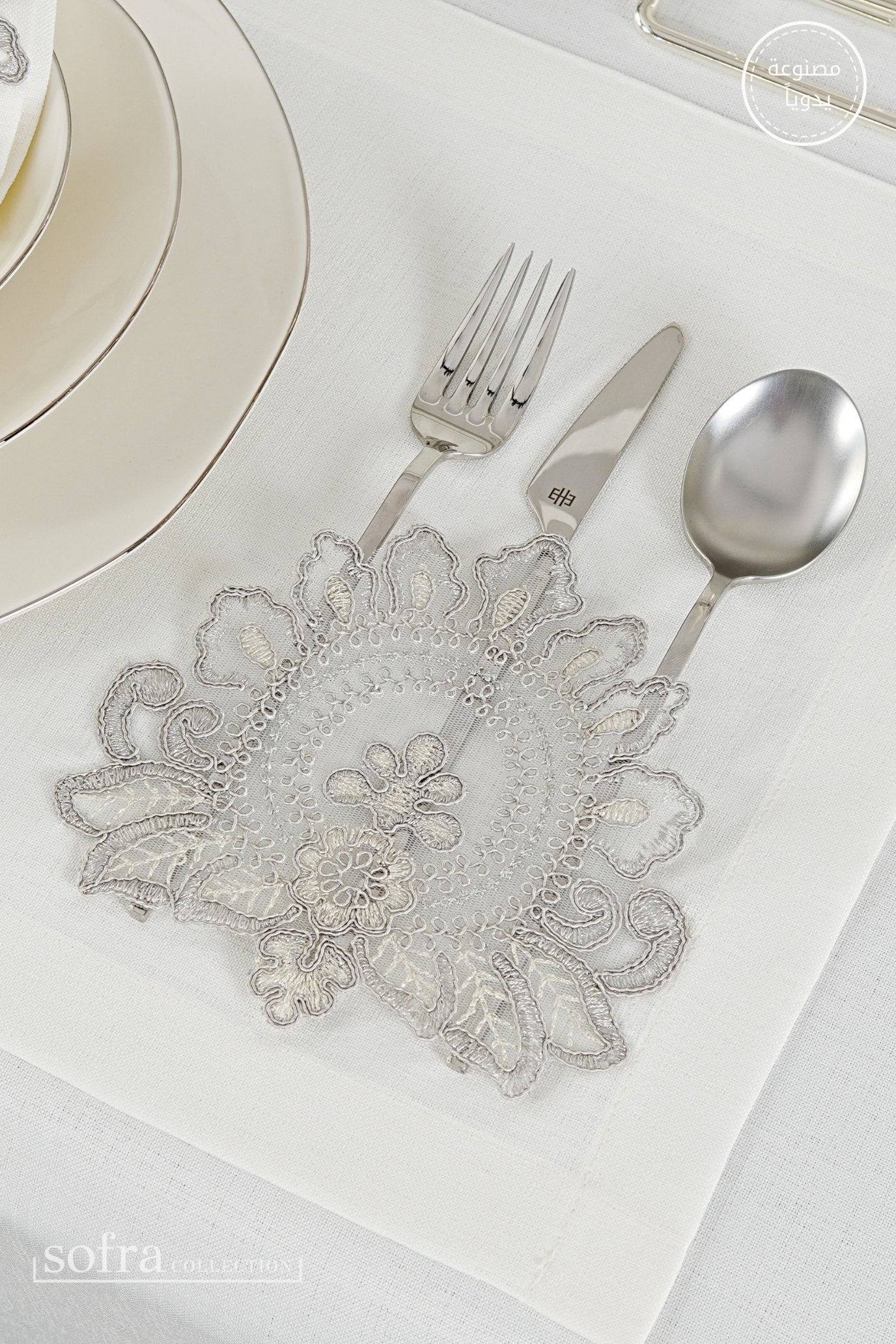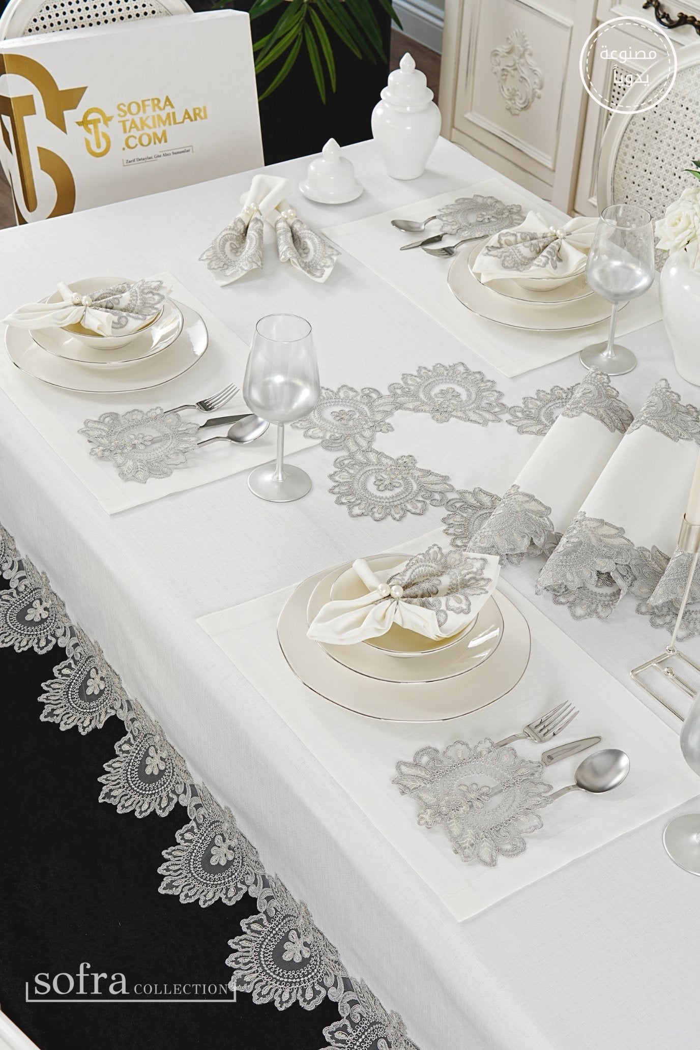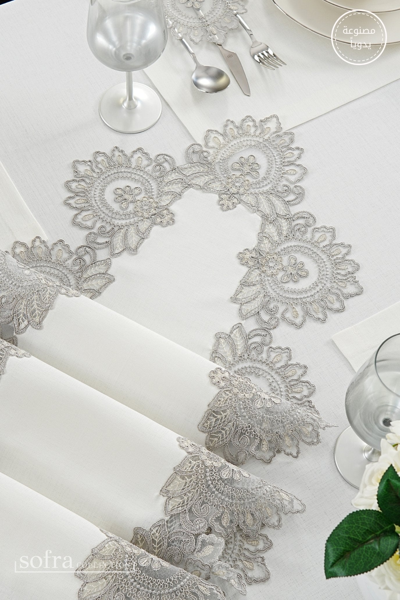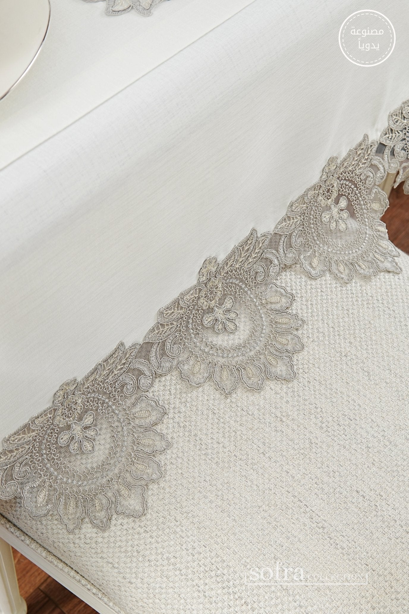 طقم مفارش سفرة كامل مزين بدانتيل رمادى - موديل شاهمران – ٣٨ قطعة – ١٢ شخص - قماش كتان مقاوم للبقع