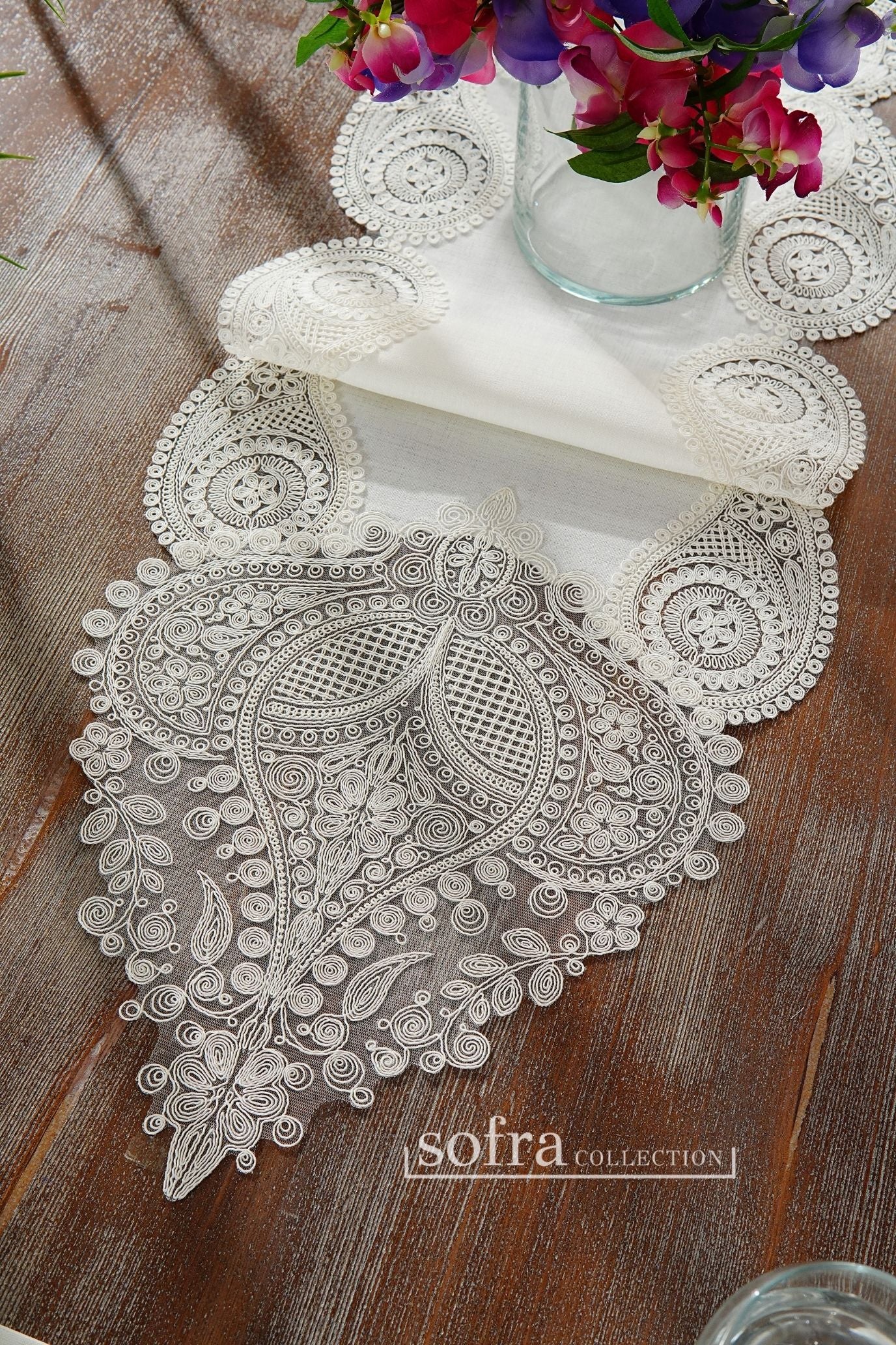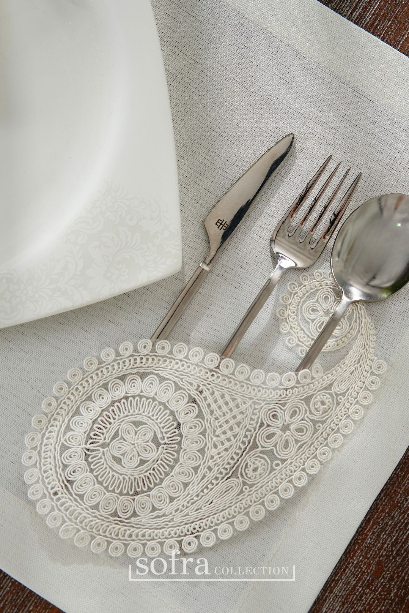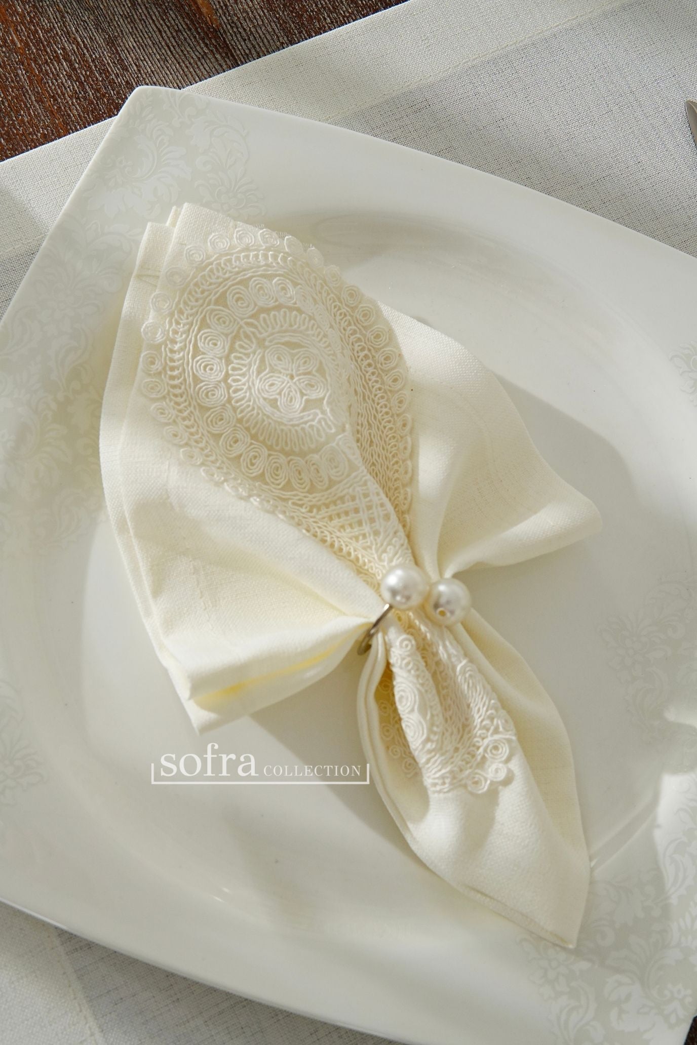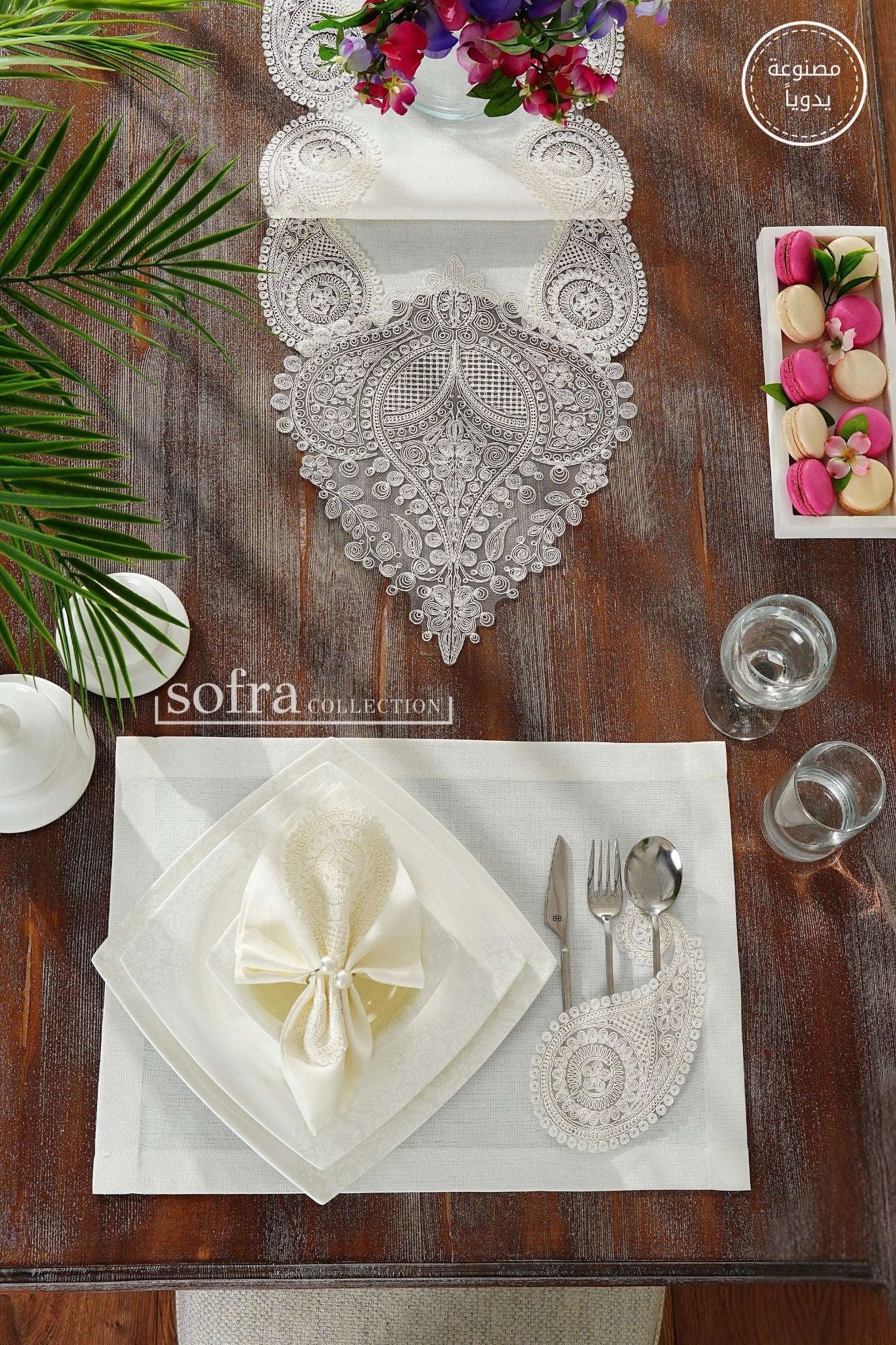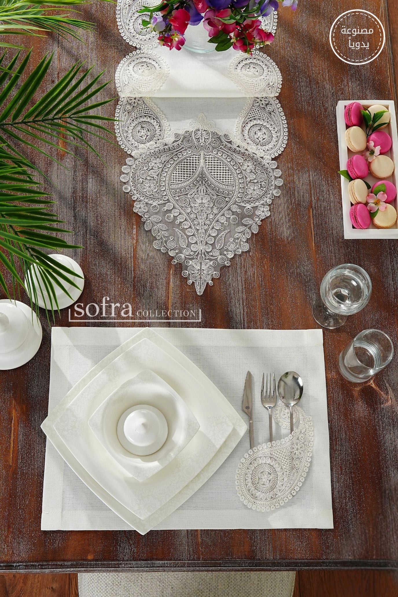 طقم مفارش سفرة مزين بدانتيل اوف وايت - موديل سالكم – شامل المناديل - ٣٧ قطعة – ١٢ شخص - قماش كتان مقاوم للبقع