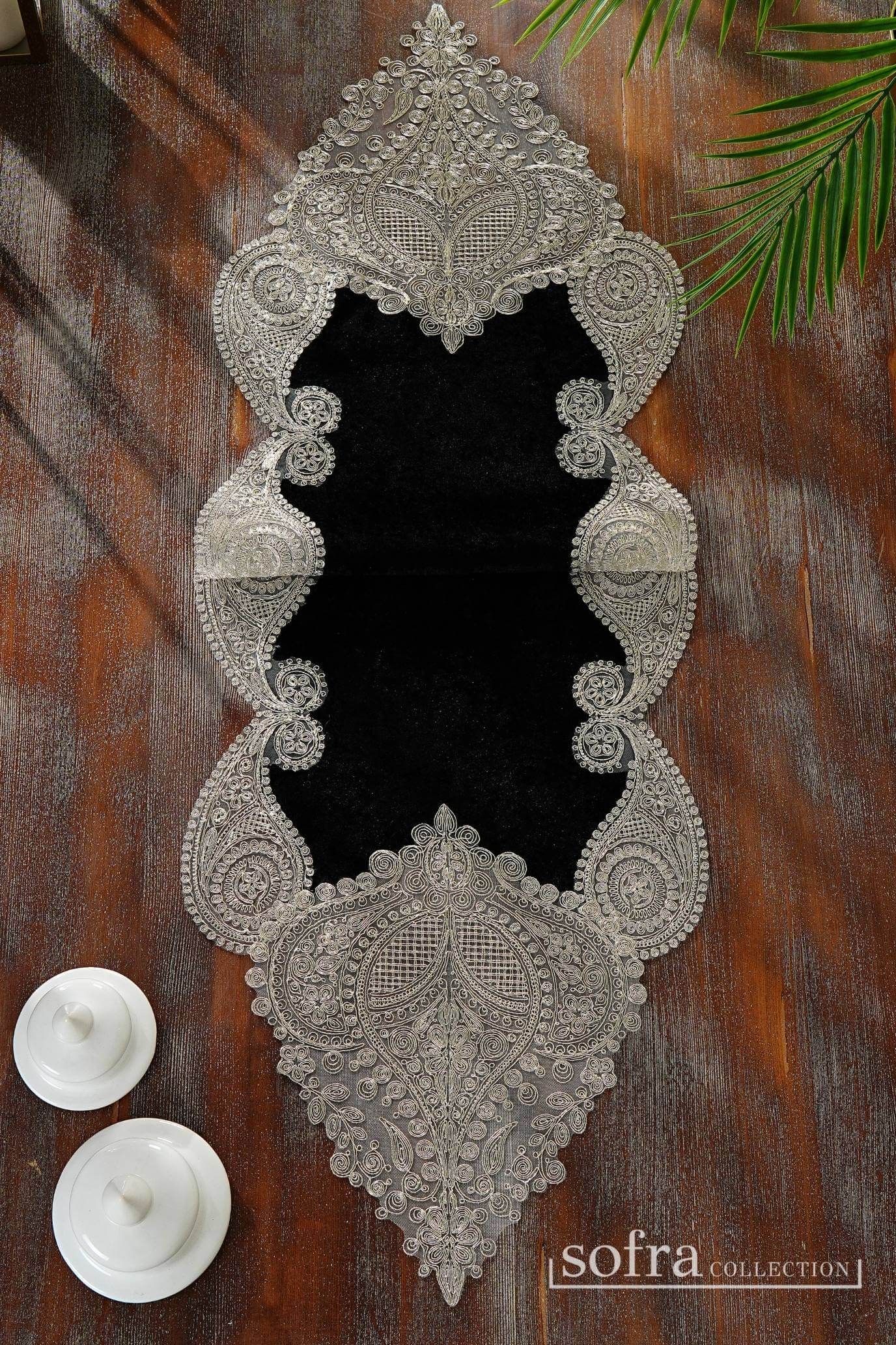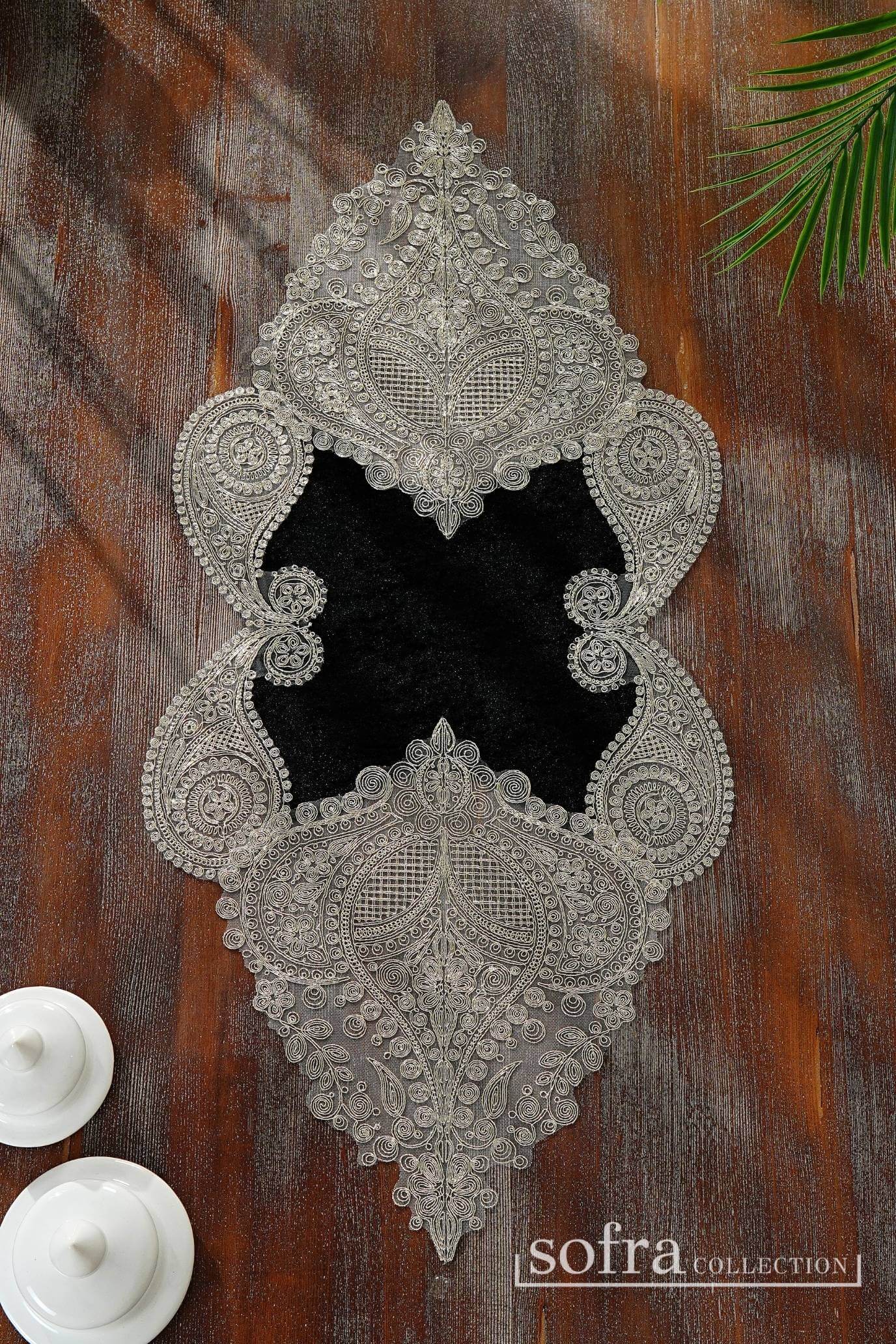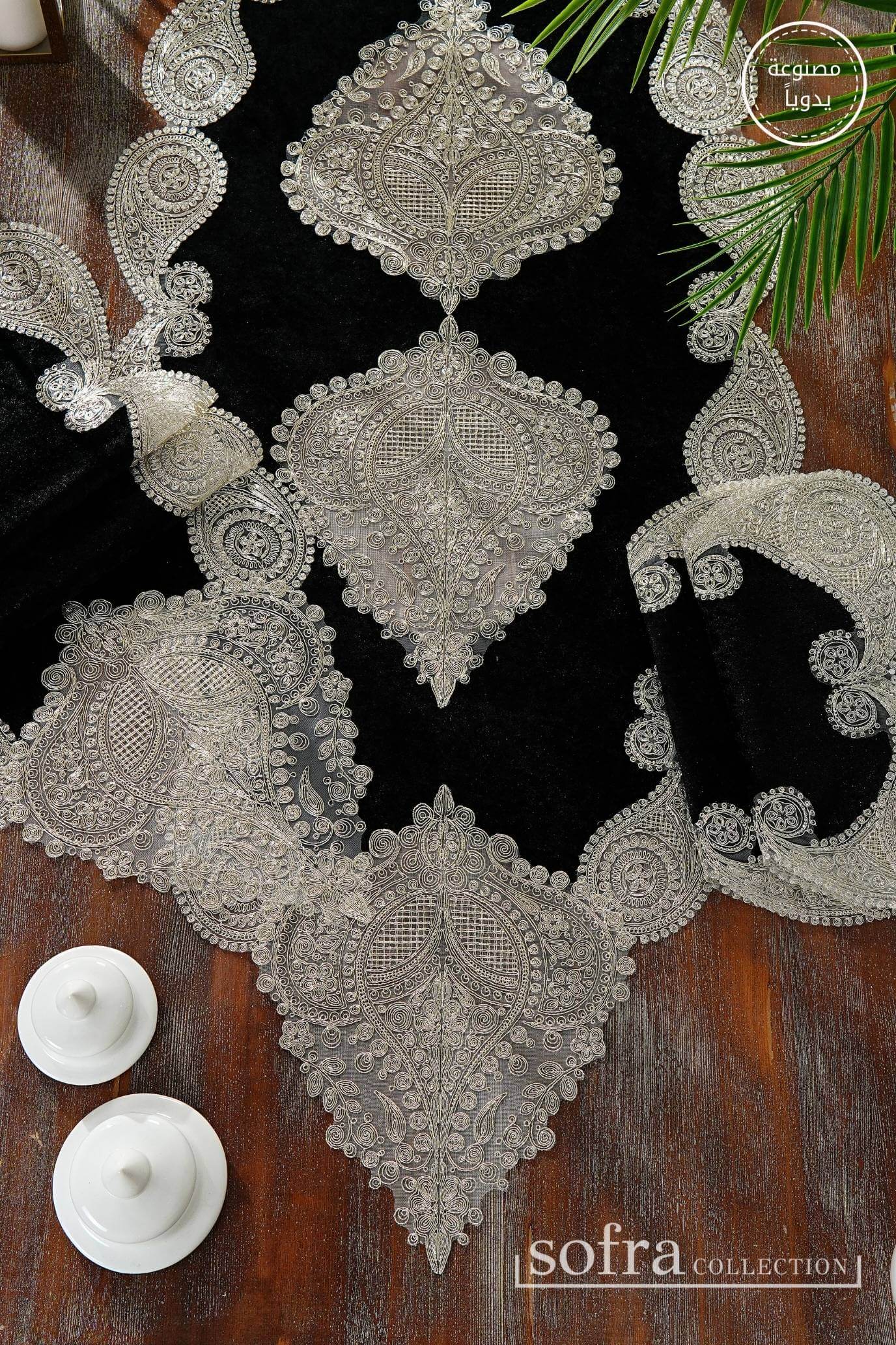 طقم مفارش صالون ٥ قطع مزين بدانتيل بلاتينى – موديل سالكم – قماش قطيفة فاخر اسود اللون