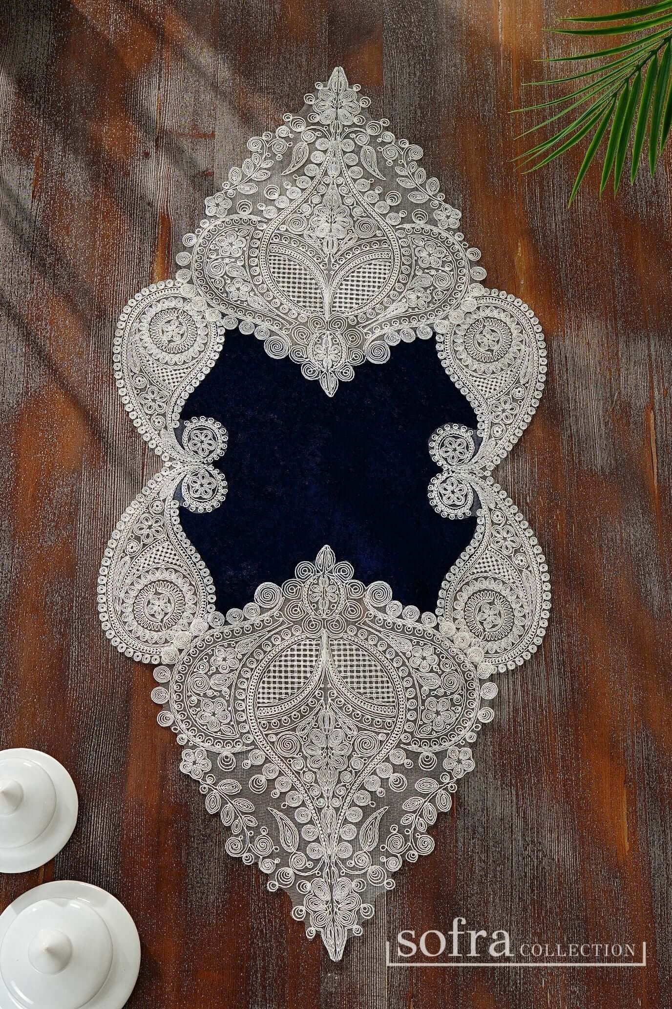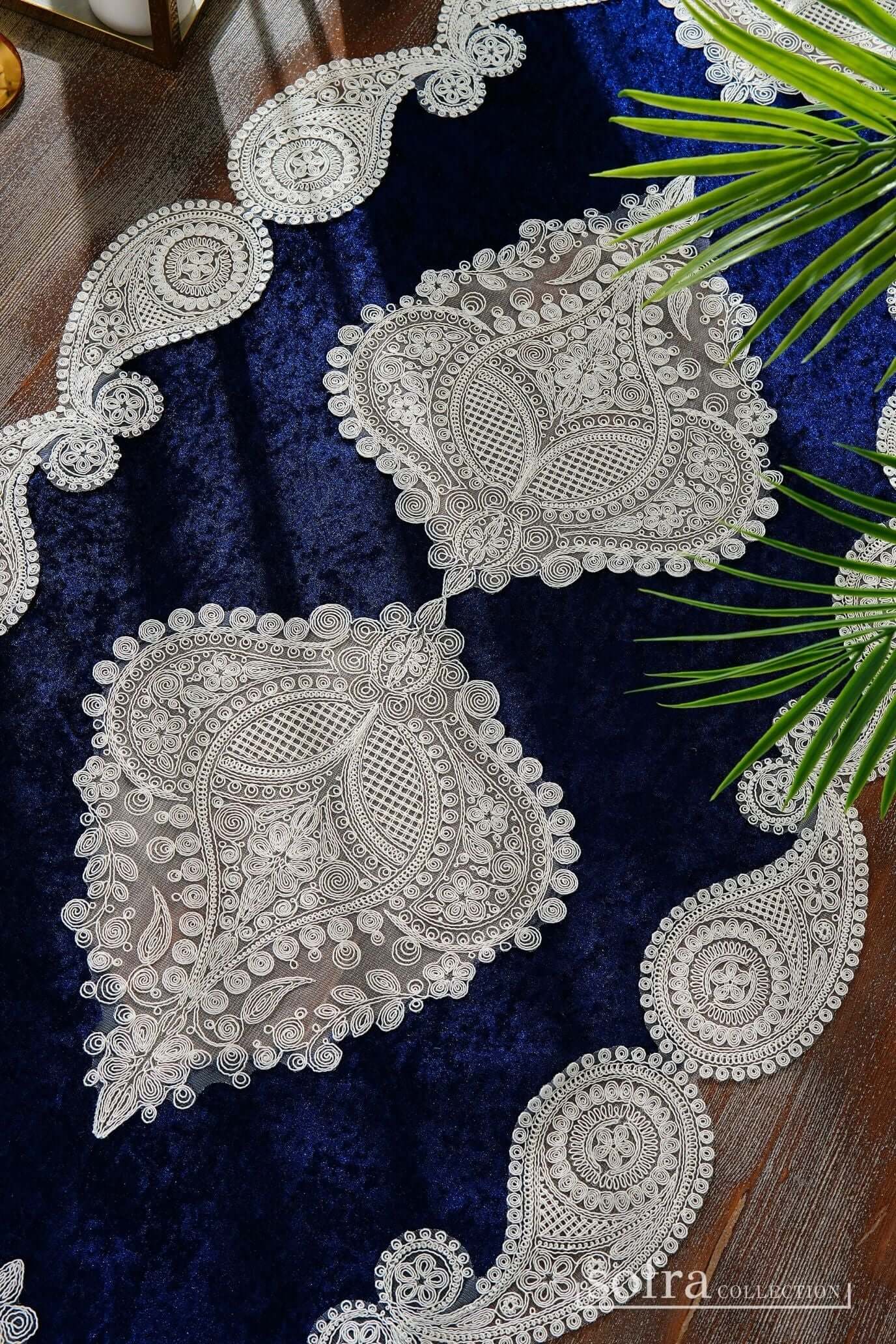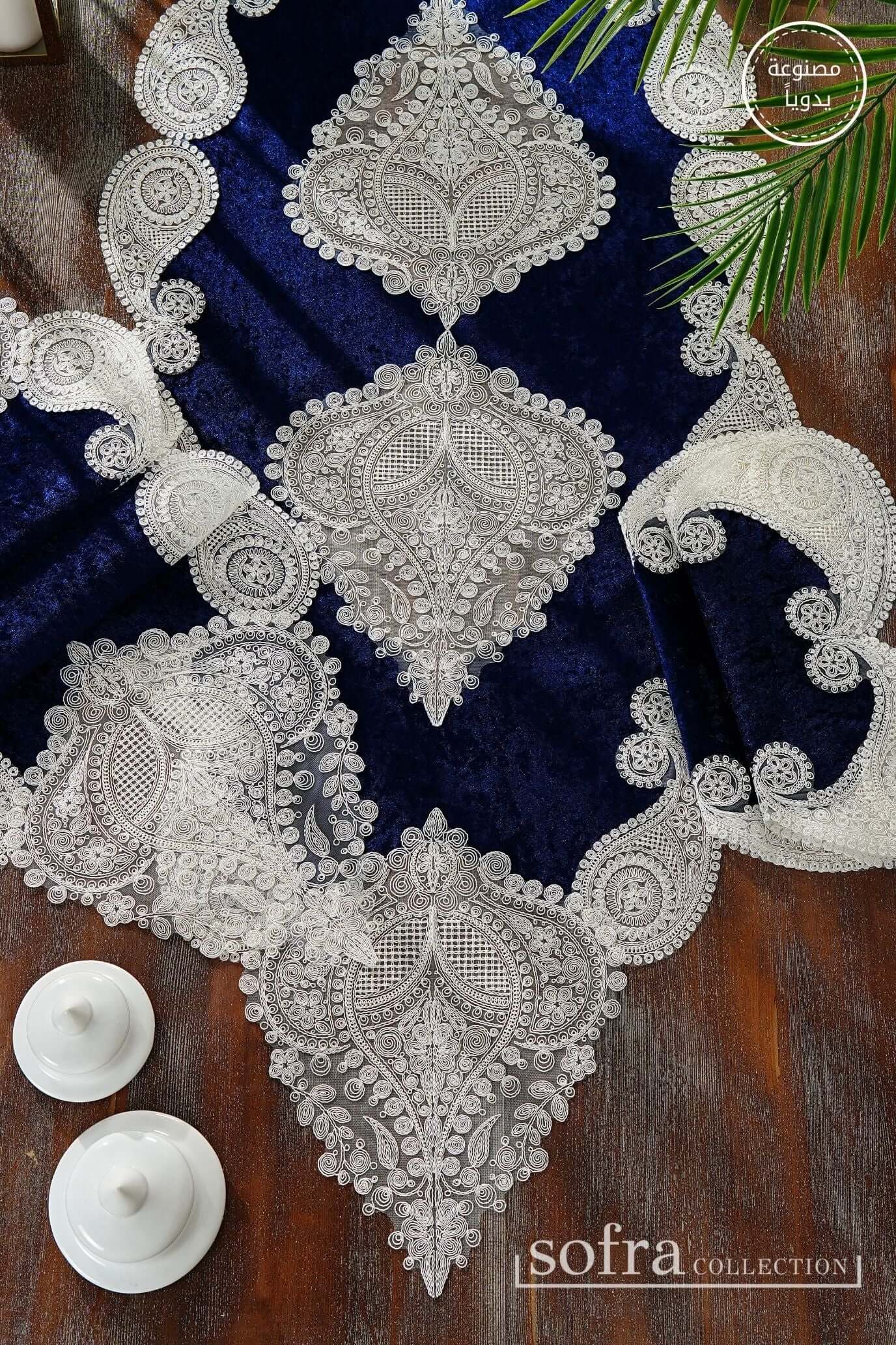 طقم مفارش صالون ٥ قطع مزين بدانتيل اوف وايت – موديل سالكم – قماش قطيفة فاخر ازرق داكن اللون