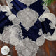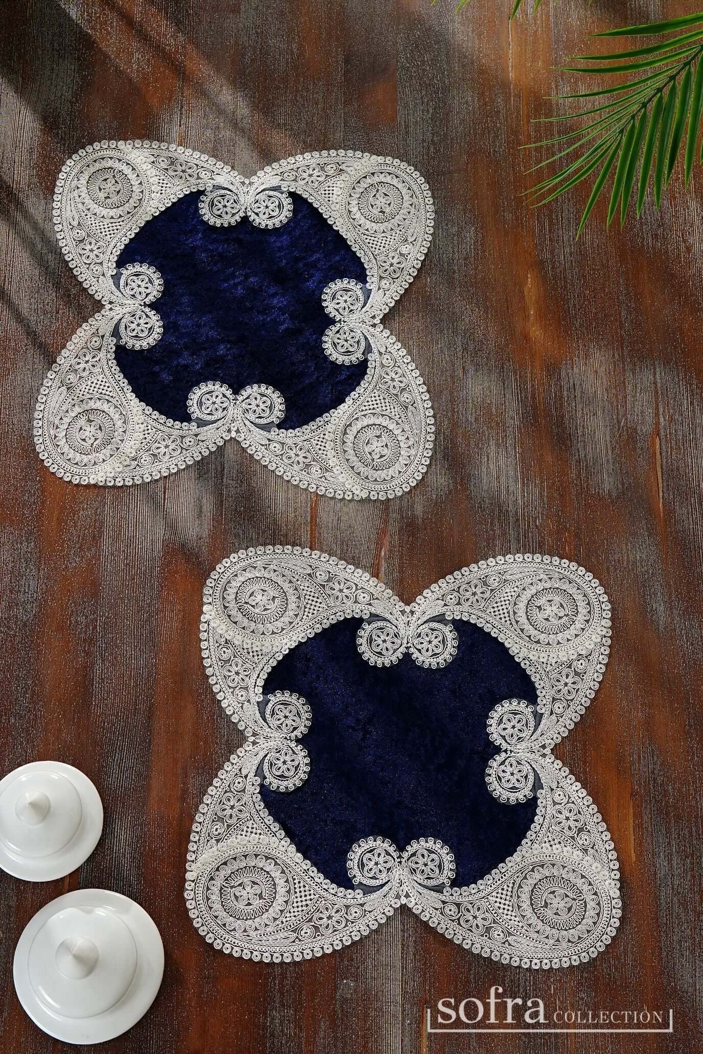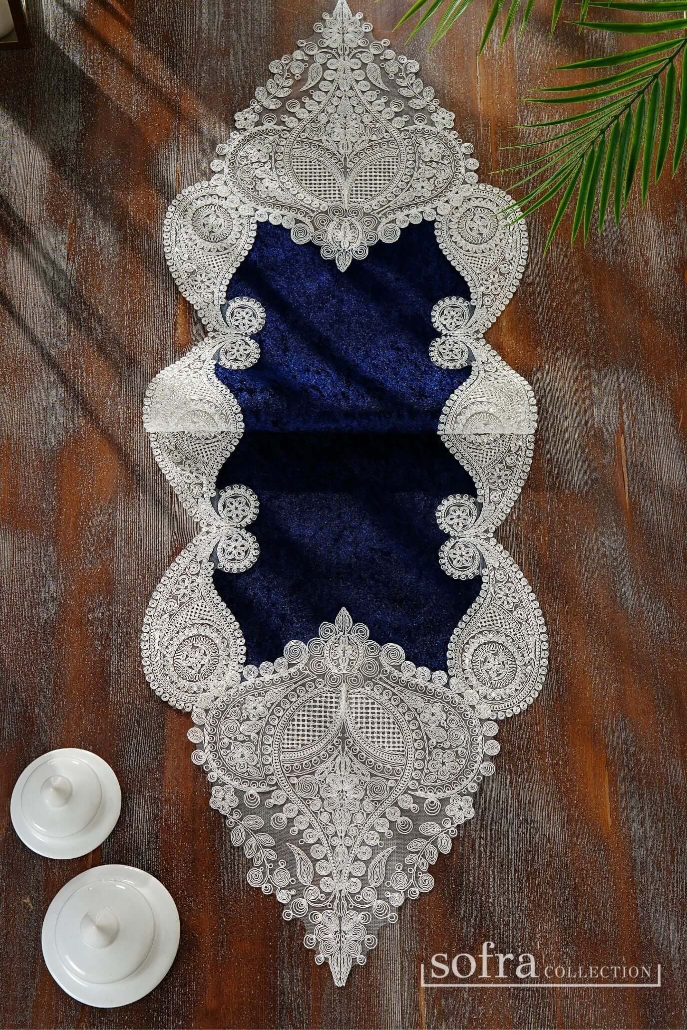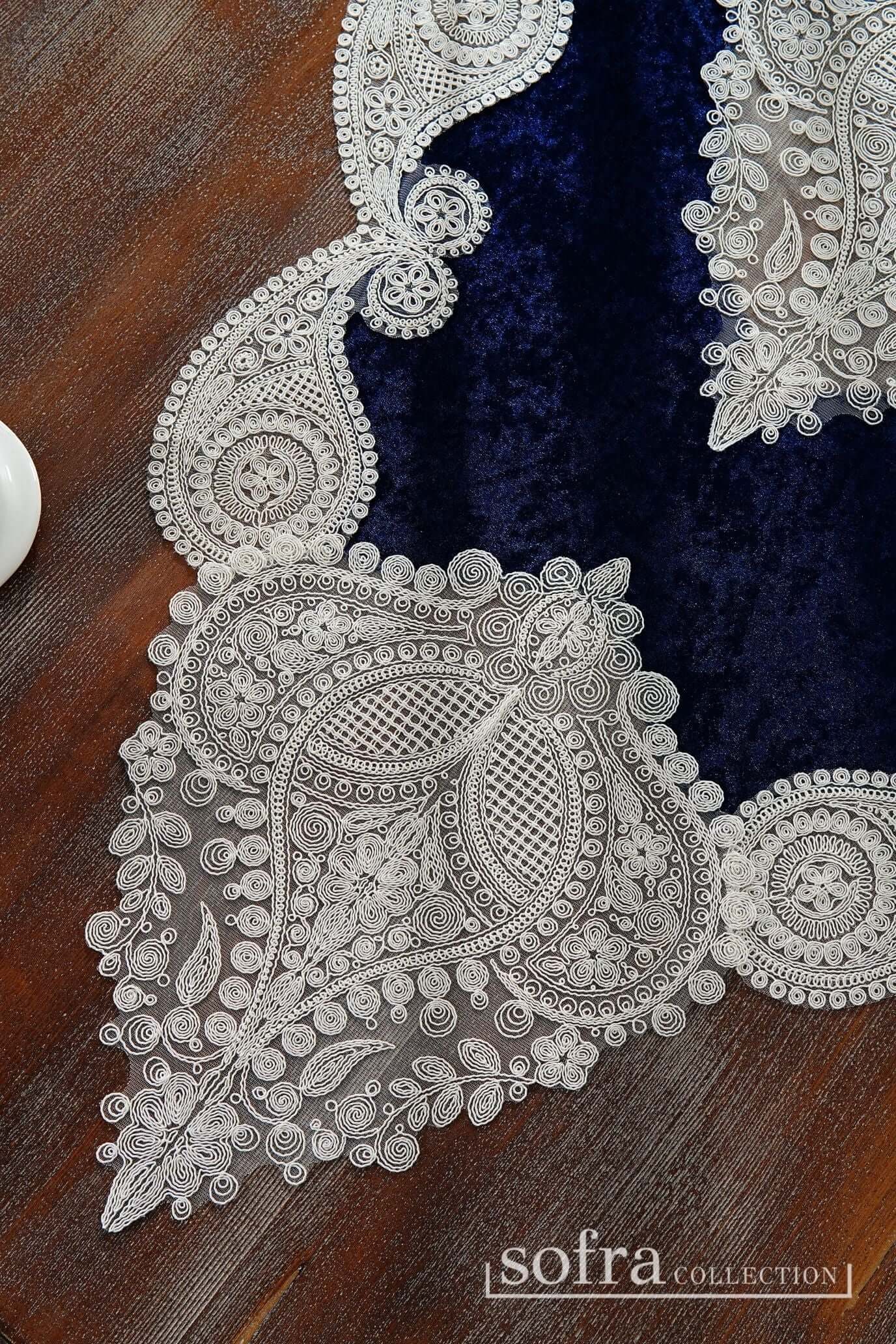 طقم مفارش صالون ٥ قطع مزين بدانتيل اوف وايت – موديل سالكم – قماش قطيفة فاخر ازرق داكن اللون