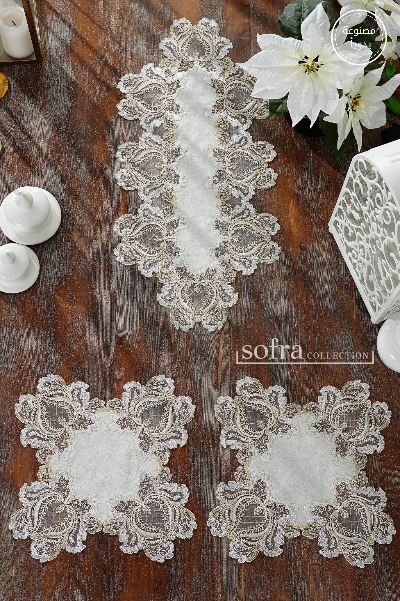 طقم مفارش ٣ قطع مزين بدانتيل ذهبى – موديل روزا - قماش كتان فاخر مقاوم للبقع