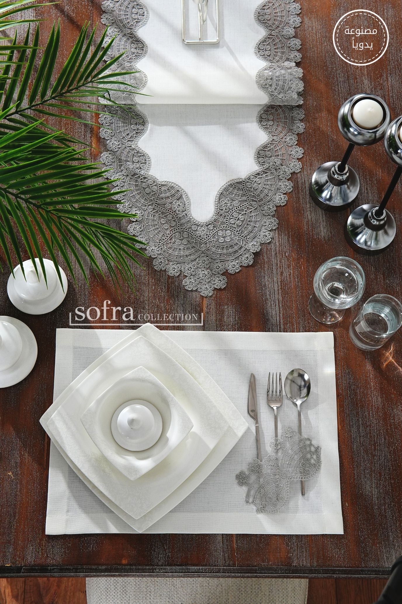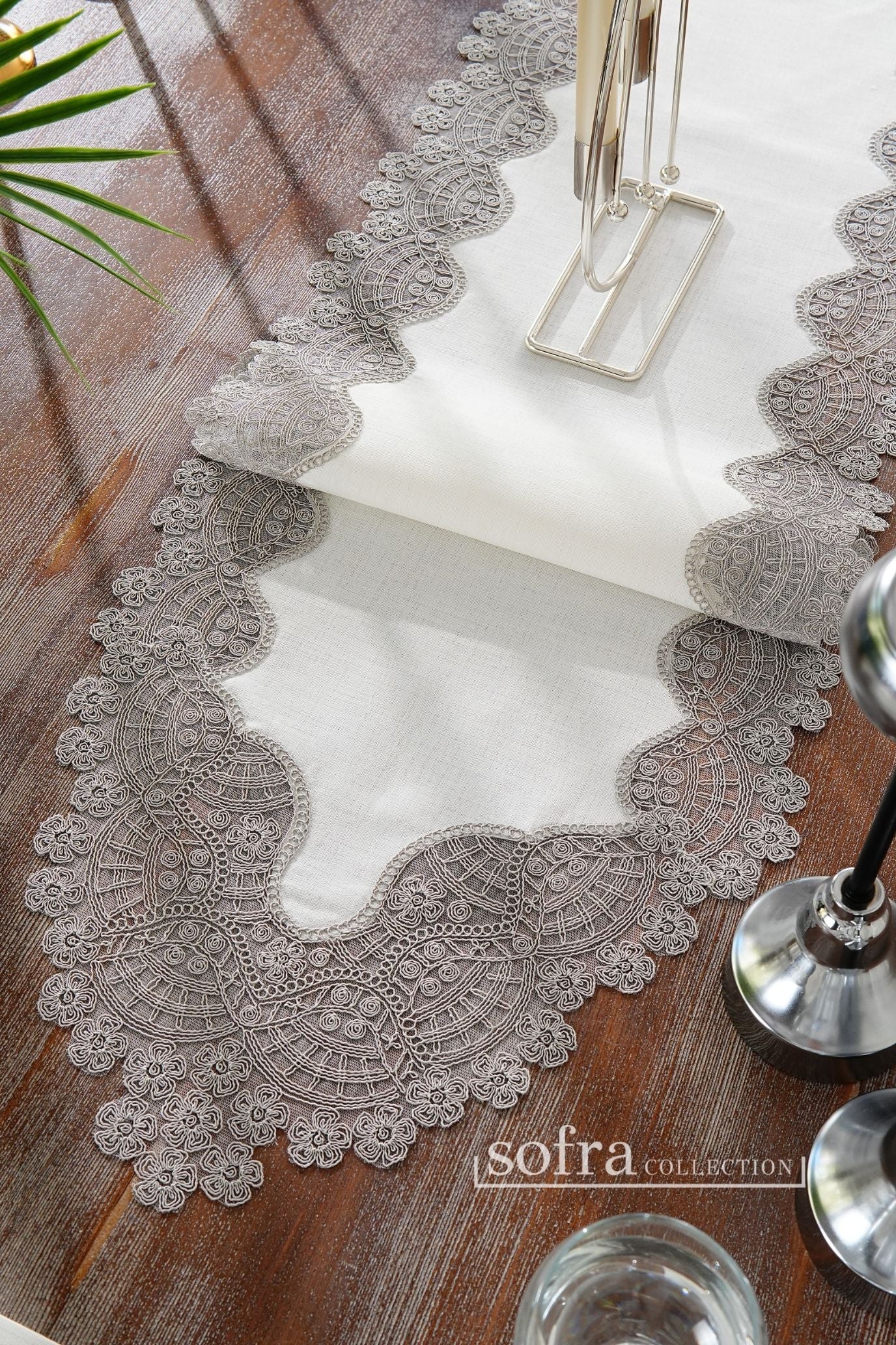 طقم مفارش سفرة مزين بدانتيل رمادى - موديل سيفدا – بدون مناديل - ١٣ قطعة – ١٢ شخص - قماش كتان مقاوم للبقع