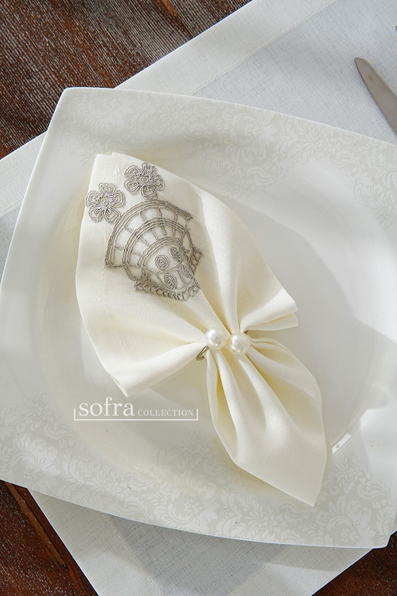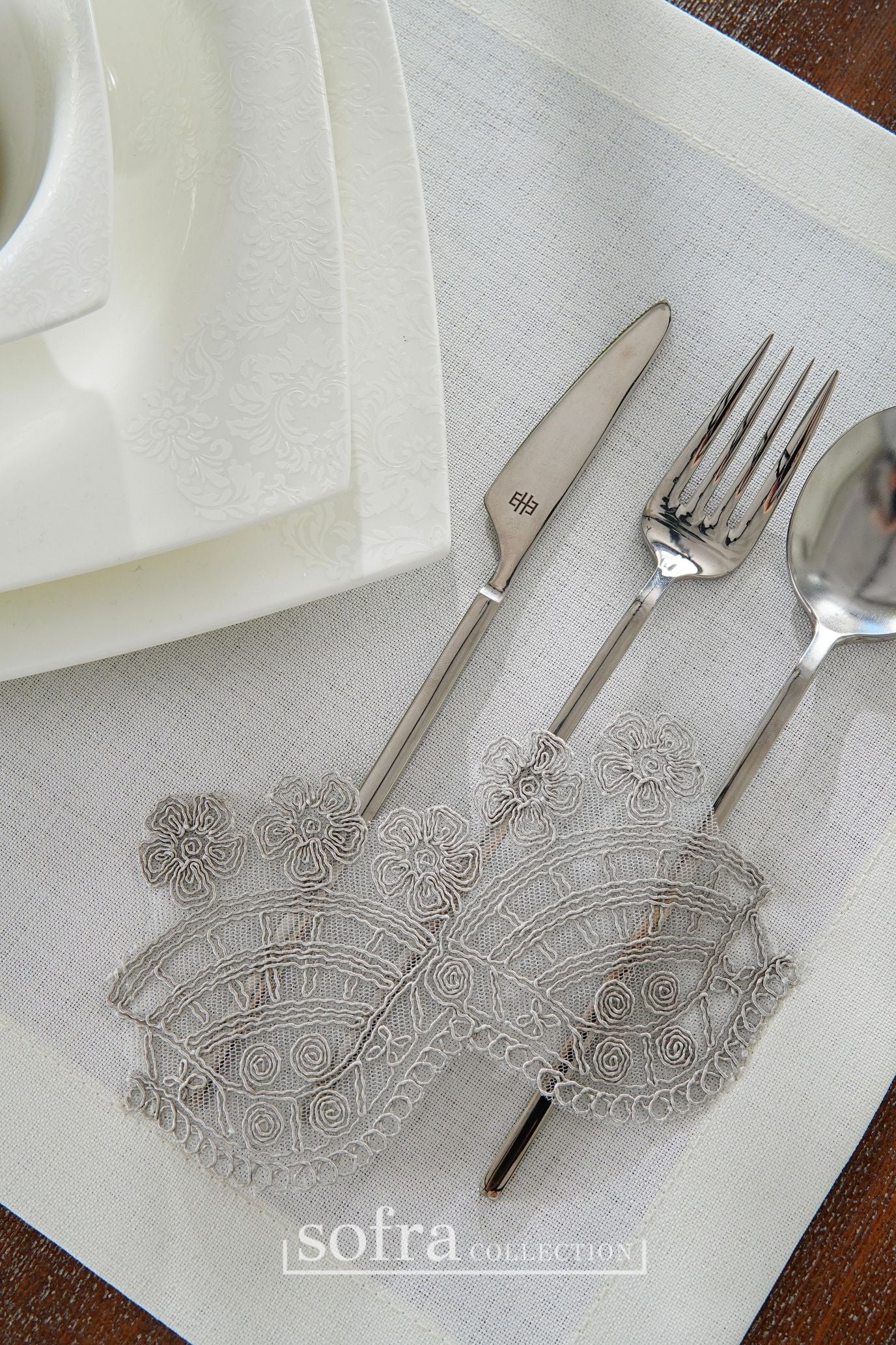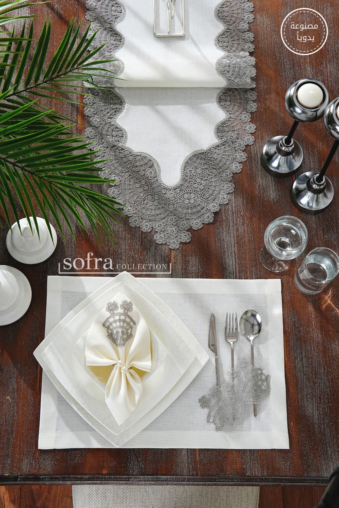 طقم مفارش سفرة مزين بدانتيل رمادى - موديل سيفدا – شامل المناديل - ٣٧ قطعة – ١٢ شخص - قماش كتان مقاوم للبقع