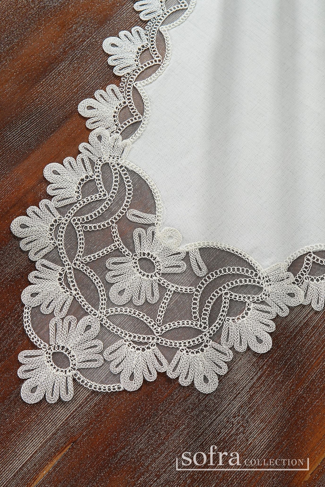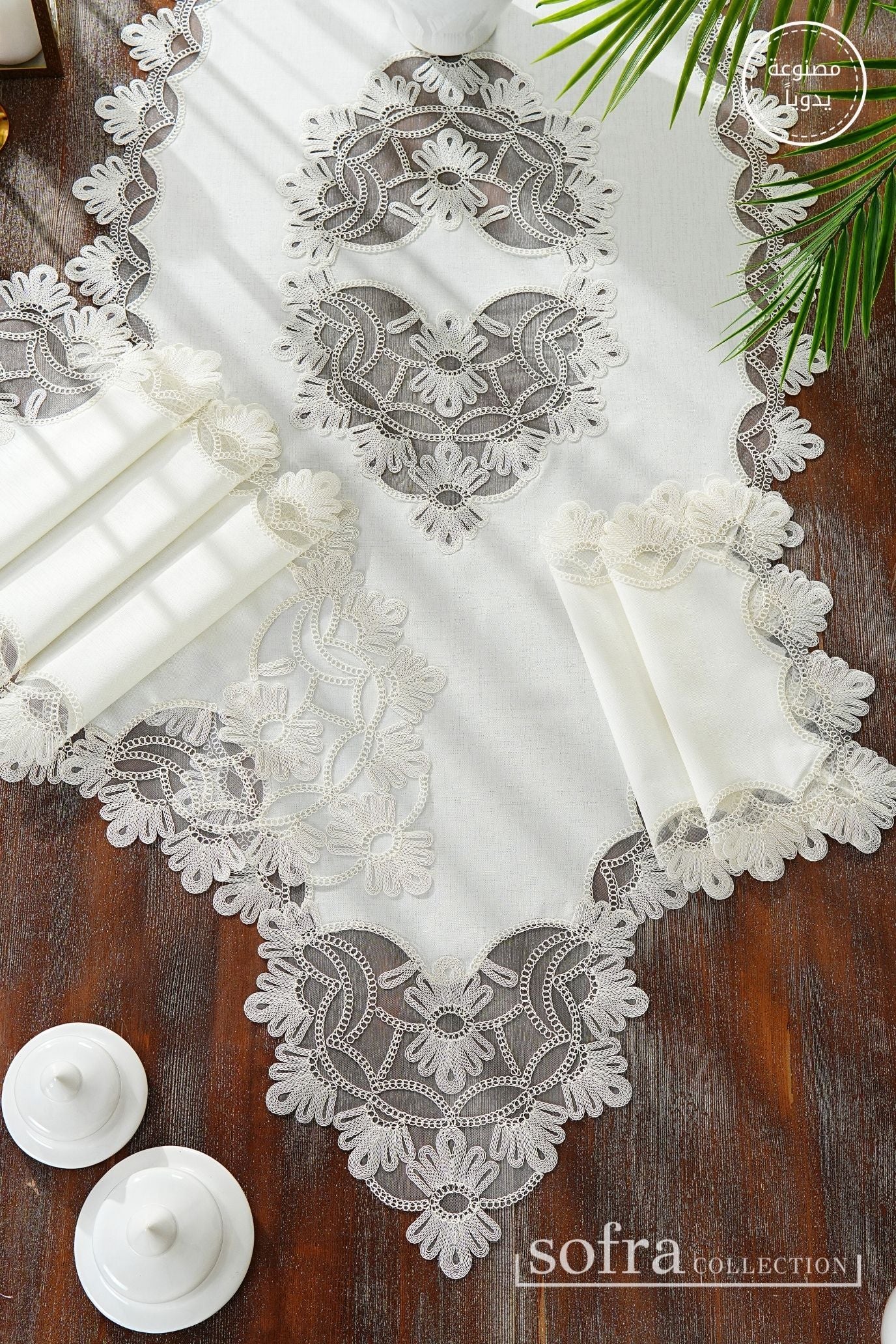 طقم مفارش صالون ٥ قطع مزين بدانتيل اوف وايت – موديل صوفيا - قماش كتان فاخر مقاوم للبقع
