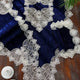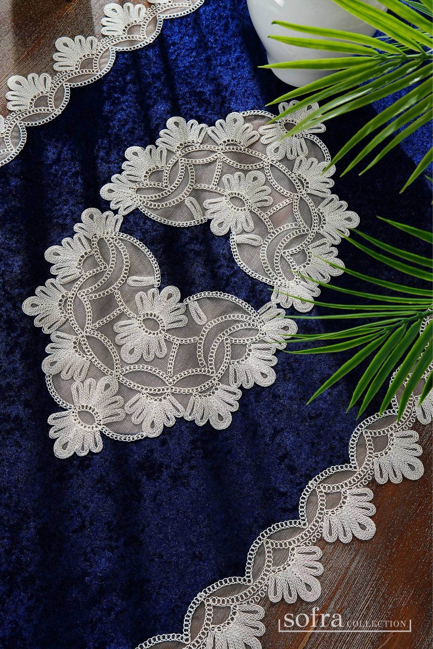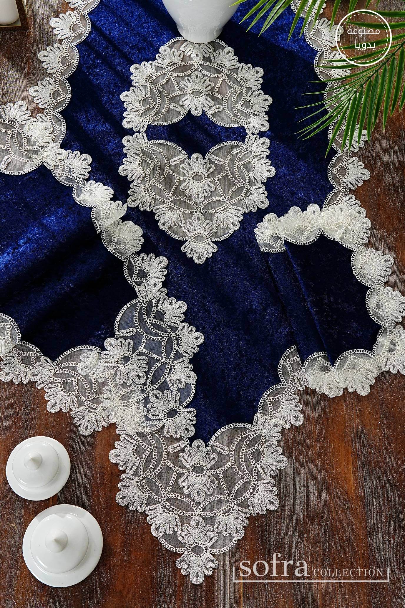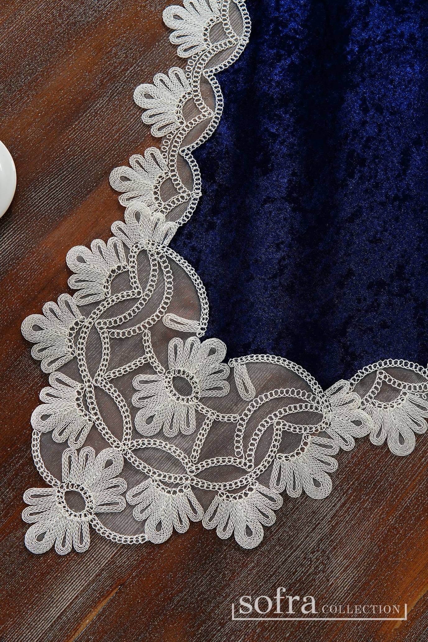 طقم مفارش صالون ٥ قطع مزين بدانتيل اوف وايت – موديل صوفيا – قماش قطيفة فاخر ازرق داكن اللون