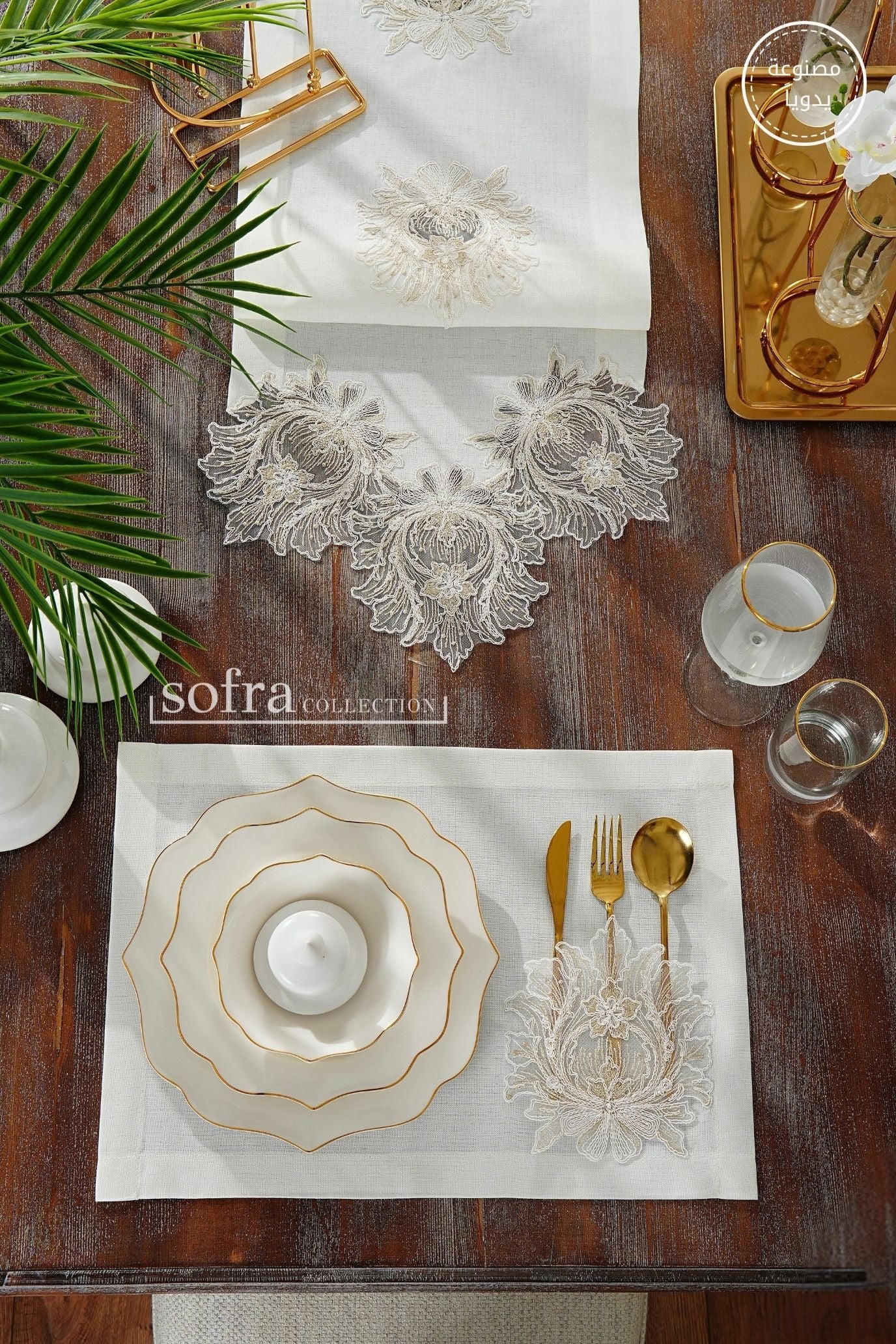 طقم مفارش سفرة مزين بدانتيل ذهبى - موديل تاج محل – بدون مناديل - ١٣ قطعة – ١٢ شخص - قماش كتان مقاوم للبقع