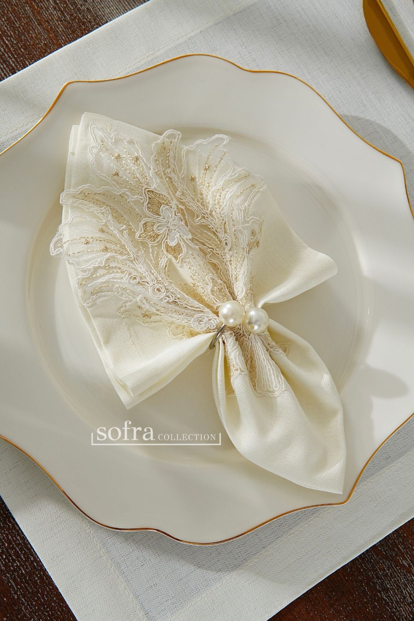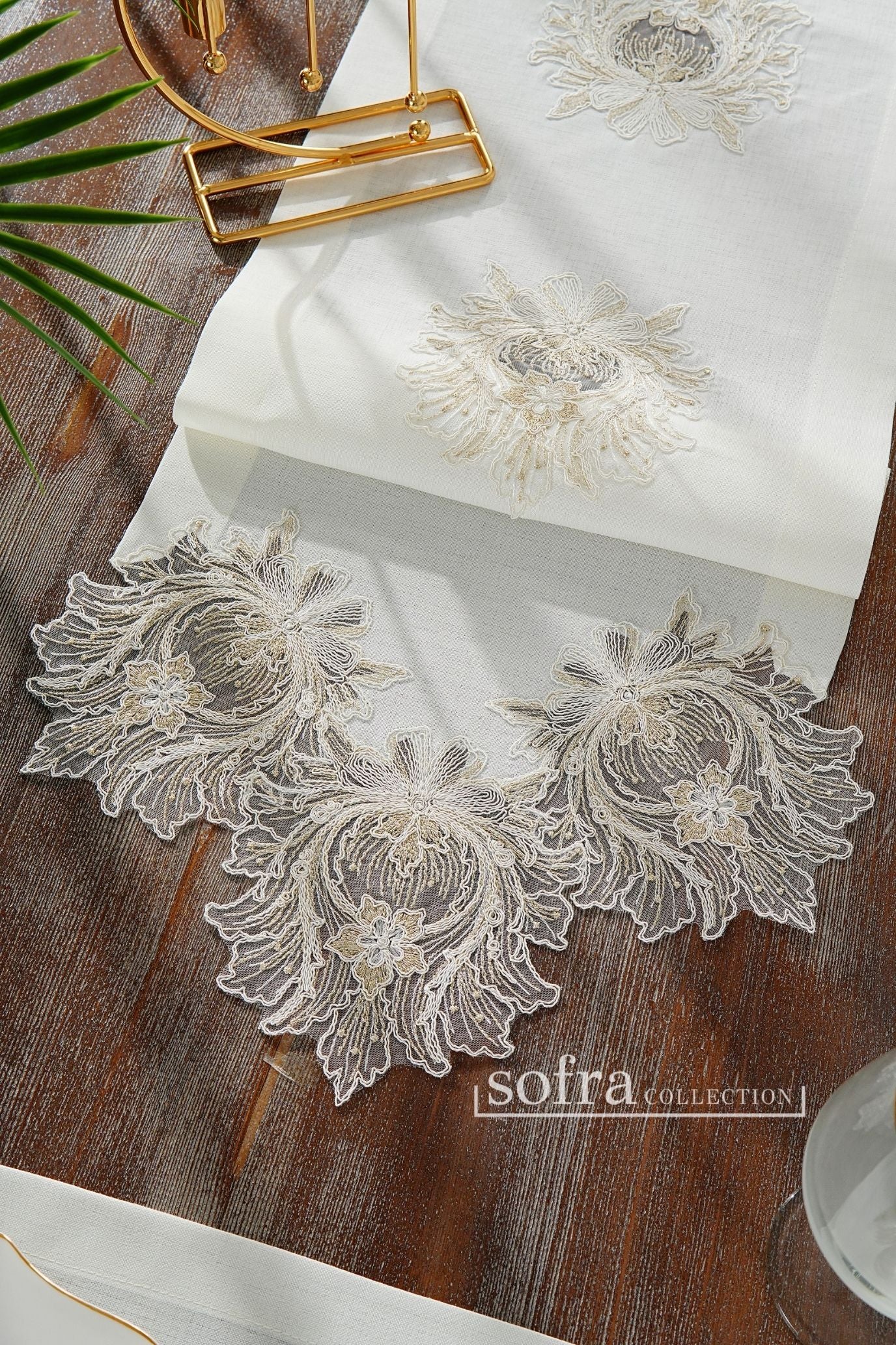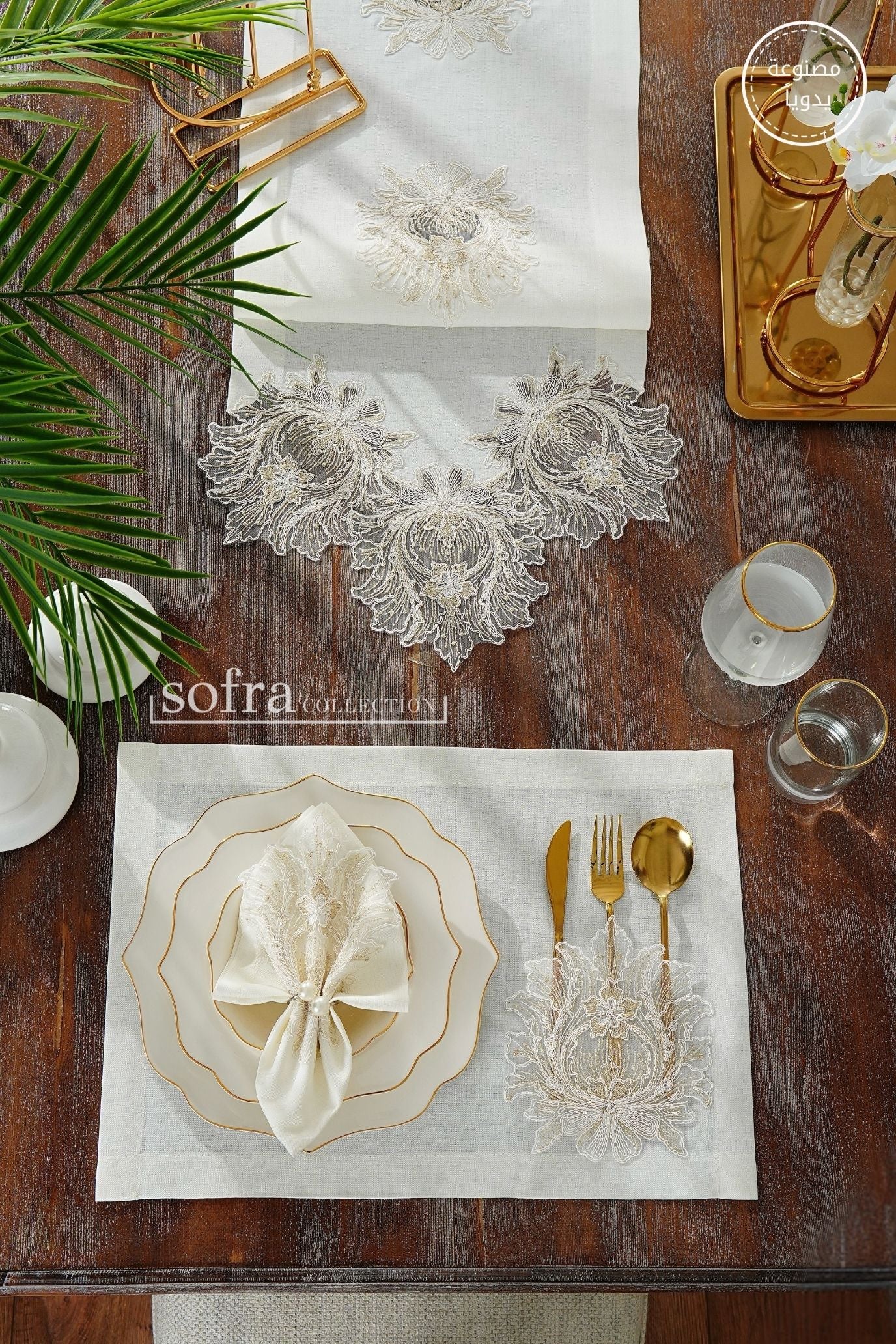طقم مفارش سفرة مزين بدانتيل ذهبى - موديل تاج محل – شامل المناديل - ٣٧ قطعة – ١٢ شخص - قماش كتان مقاوم للبقع