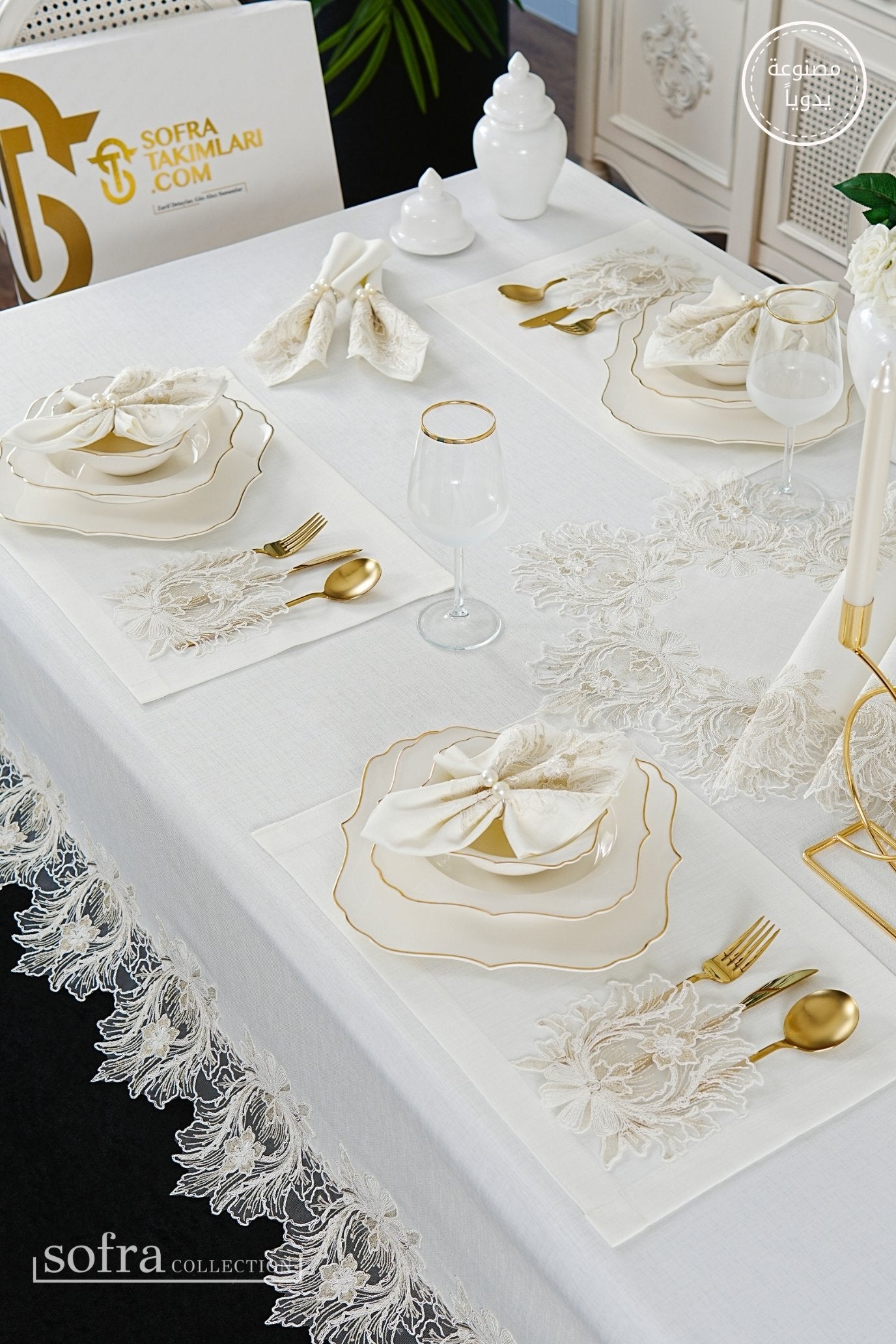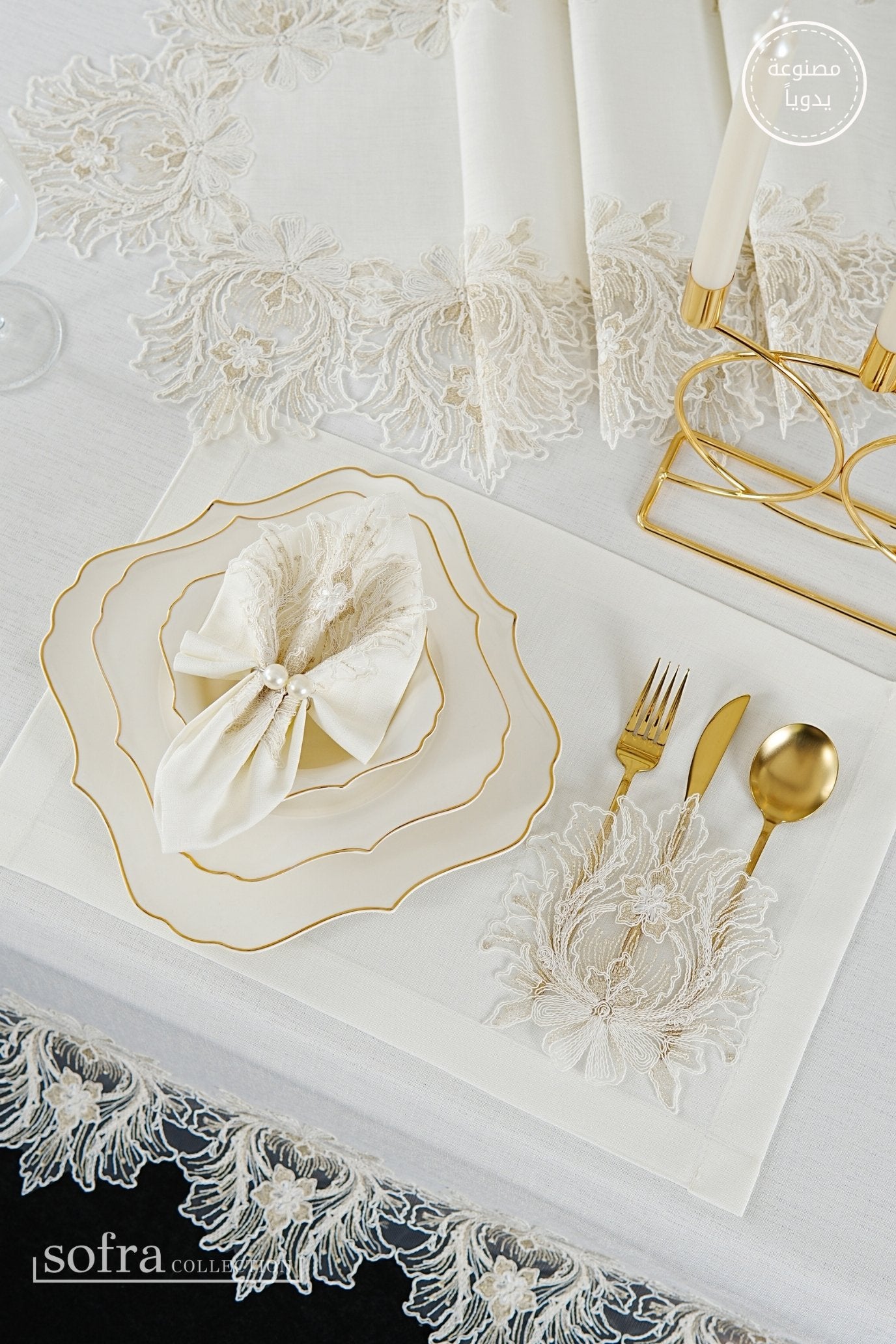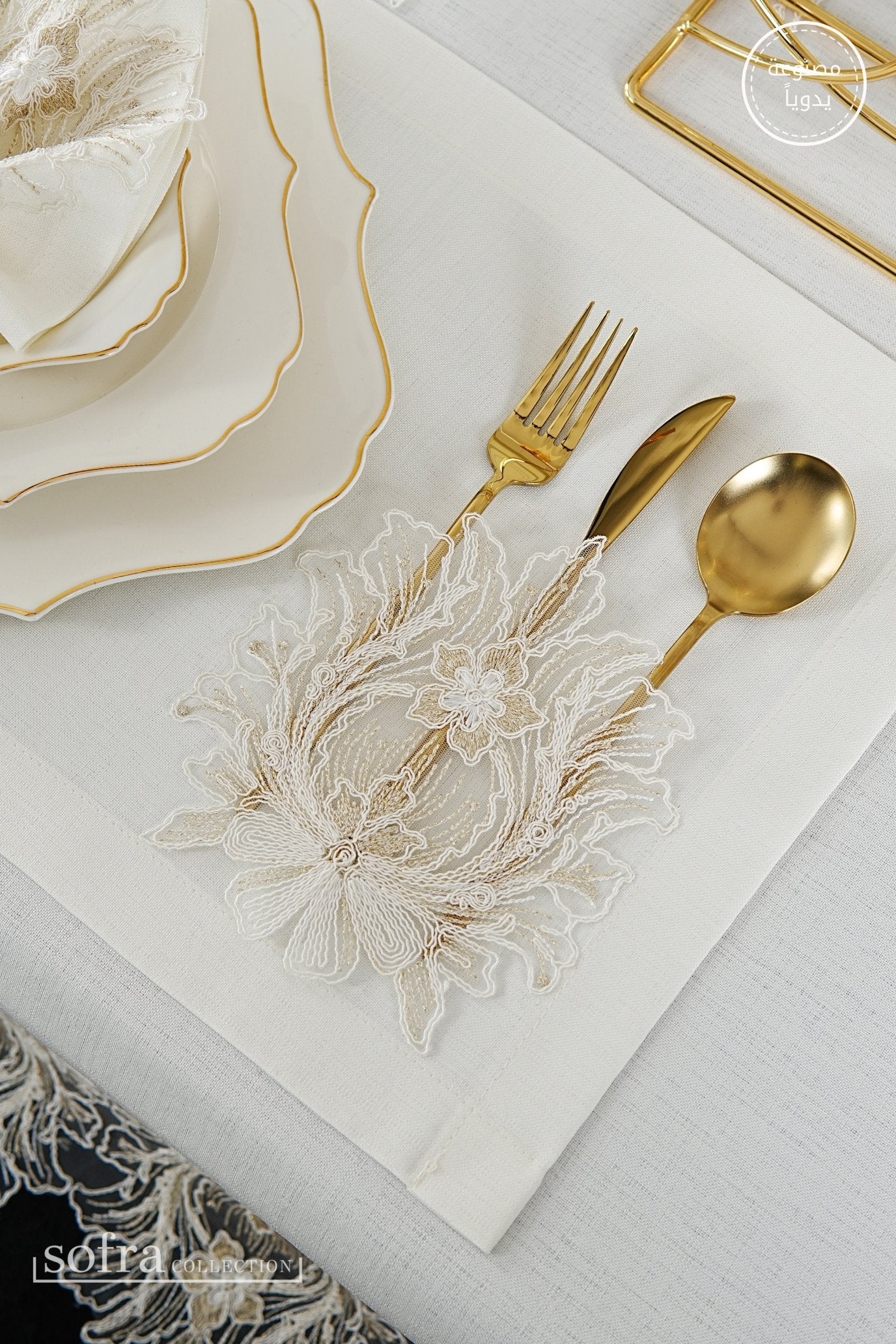 طقم مفارش سفرة كامل مزين بدانتيل ذهبى واوف وايت - موديل تاج محل – ٣٨ قطعة – ١٢ شخص - قماش كتان مقاوم للبقع