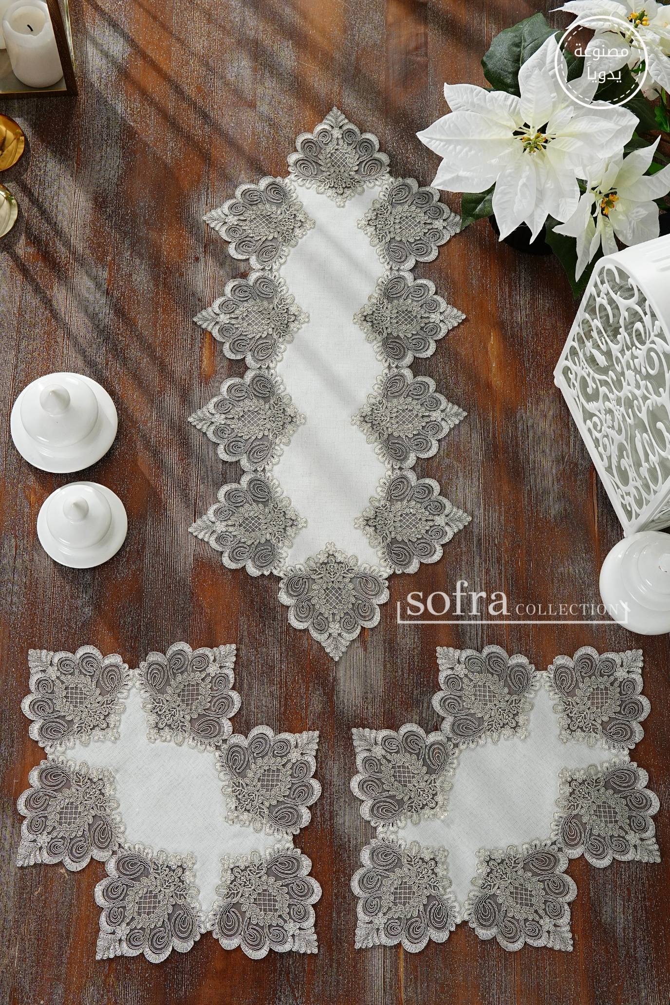 طقم مفارش ٣ قطع مزين بدانتيل رمادى وفضى – موديل فالنتينو - قماش كتان فاخر مقاوم للبقع