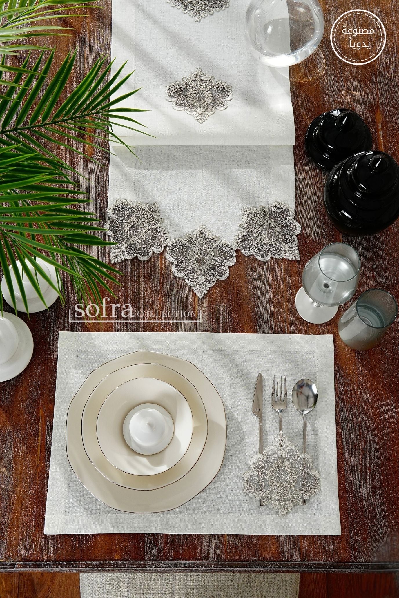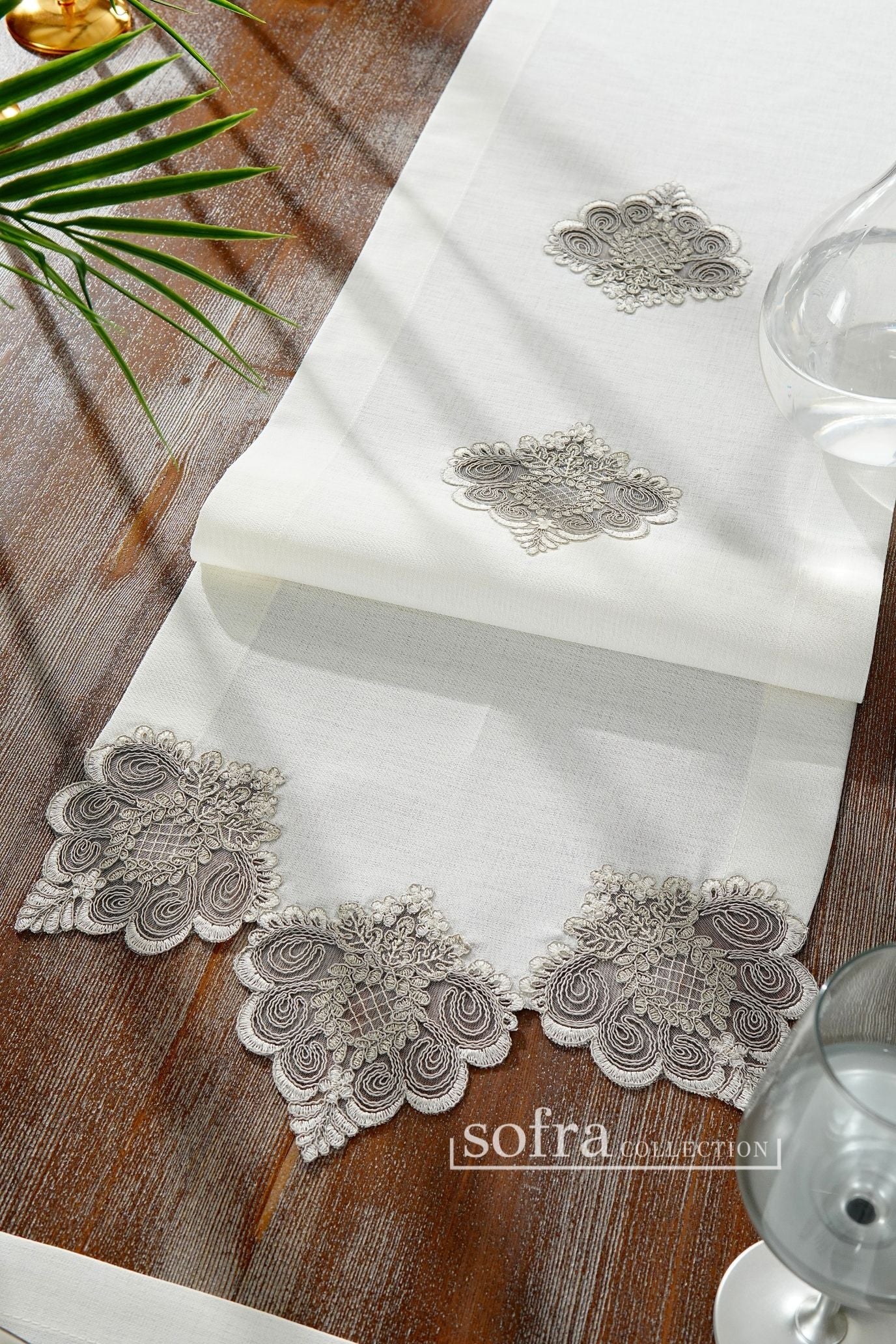 طقم مفارش سفرة دانتيل مزين بدانتيل فضى ورمادى - موديل فالنتينو – بدون مناديل - ١٣ قطعة – ١٢ شخص - قماش كتان مقاوم للبقع