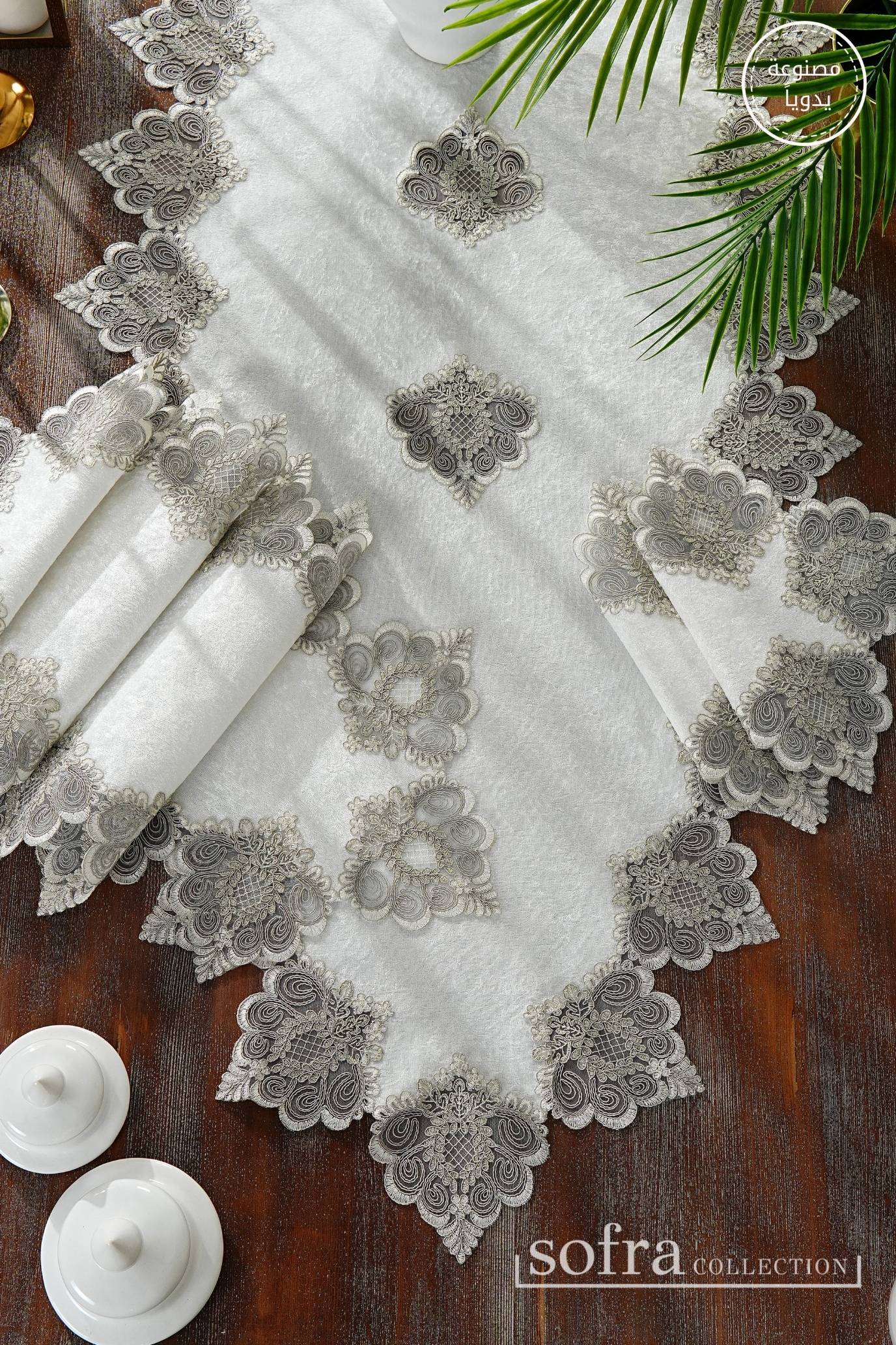طقم مفارش صالون ٥ قطع مزين بدانتيل اوف وايت – موديل فالنتينو – قماش قطيفة فاخر اوف وايت اللون