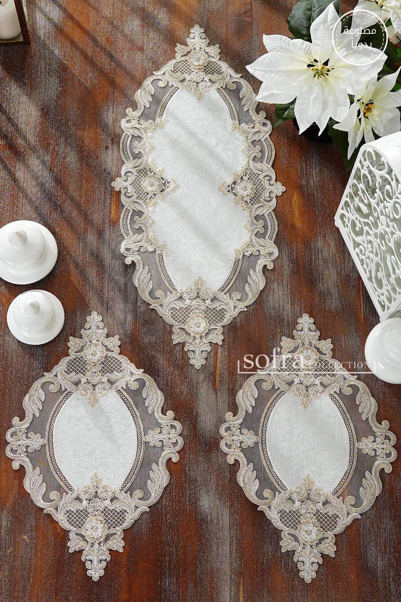طقم مفارش ٣ قطع قماش قطيفة مزين بالدانتيل
