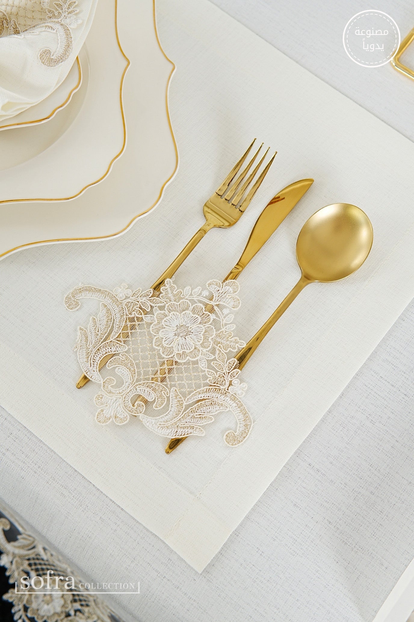 طقم مفارش سفرة كامل مزين بدانتيل ذهبى - موديل فيكتوريا – ٣٨ قطعة – ١٢ شخص - قماش كتان مقاوم للبقع