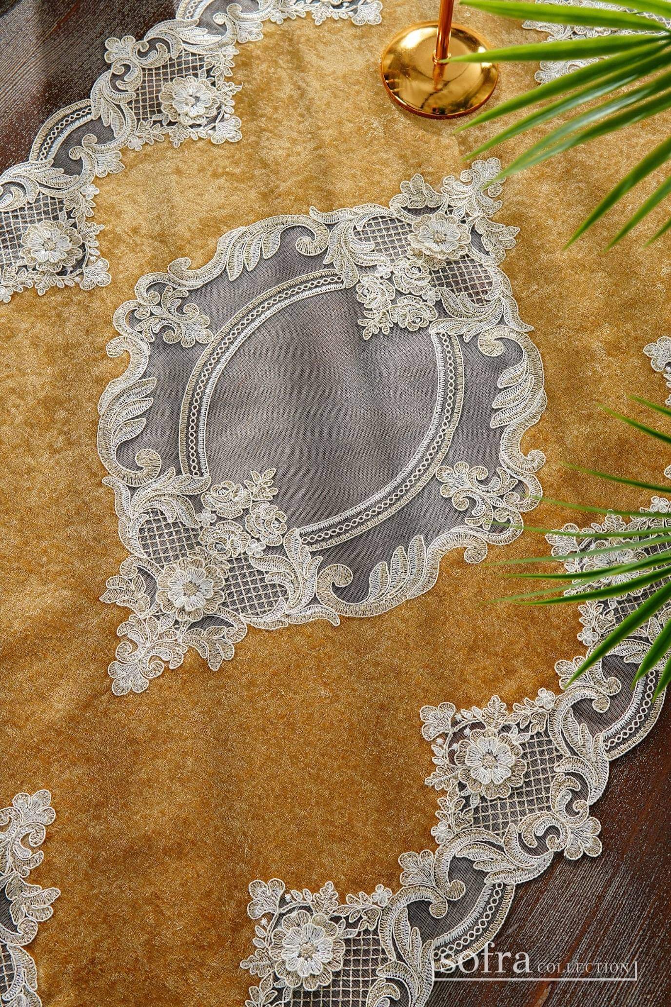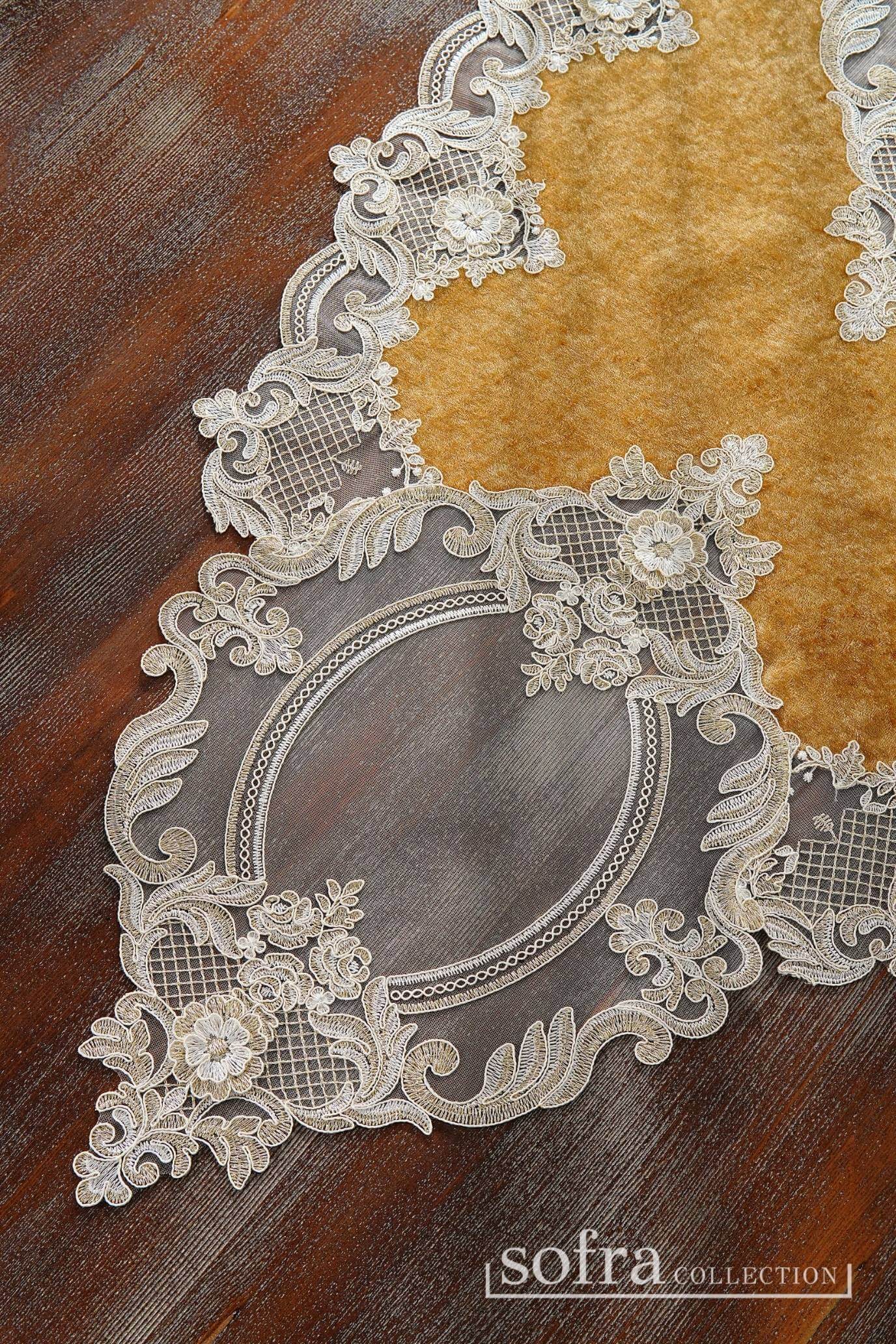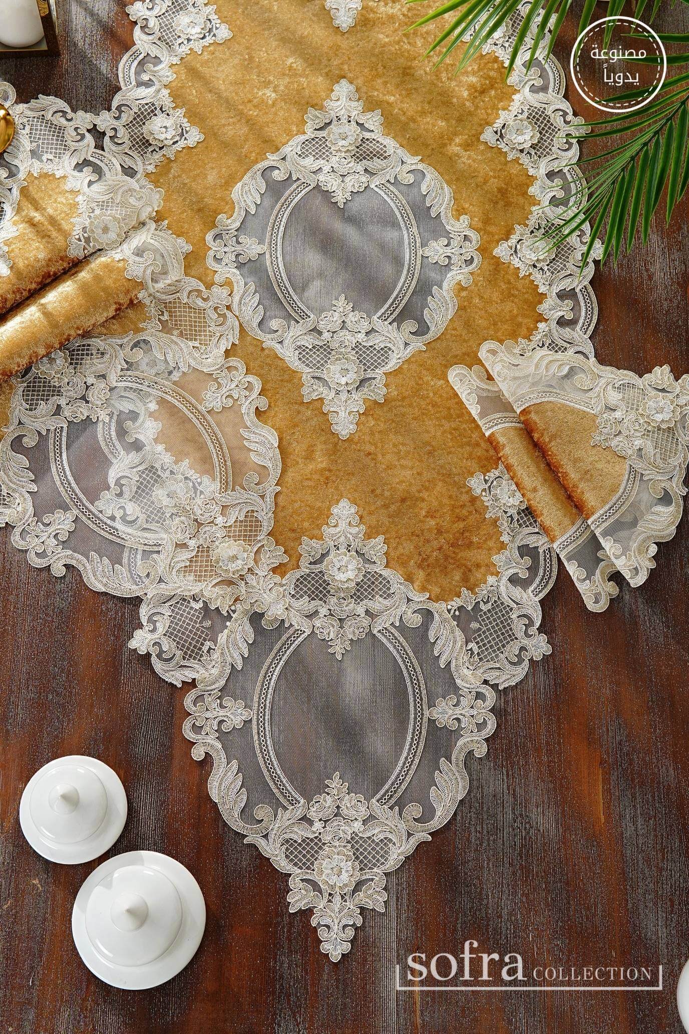 طقم مفارش صالون قماش قطيفة مزين بالدانتيل ٥ قطع