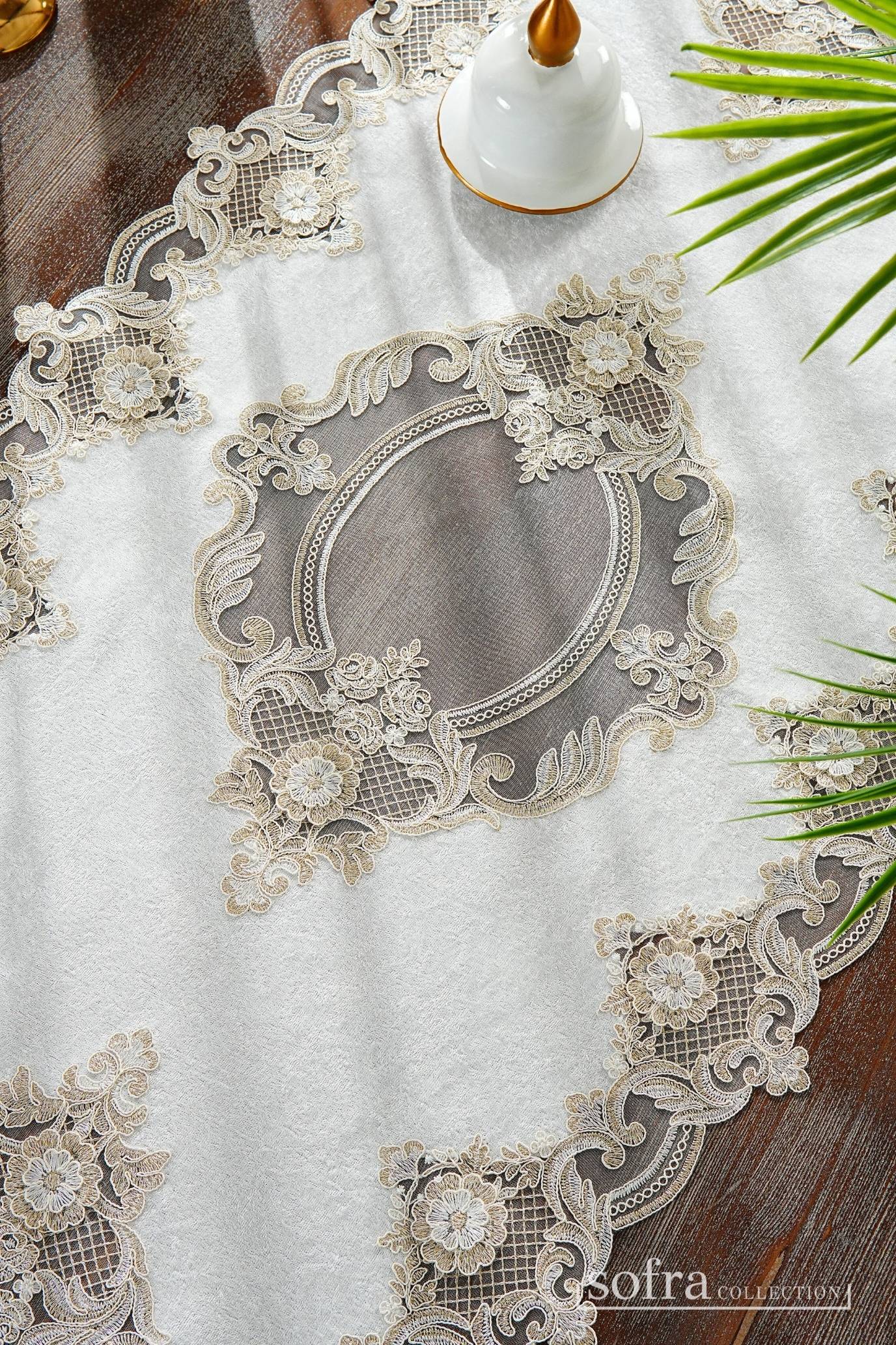 طقم مفارش صالون ٥ قطع مزين بدانتيل ذهبى – موديل فيكتوريا – قماش قطيفة فاخر اوف وايت اللون