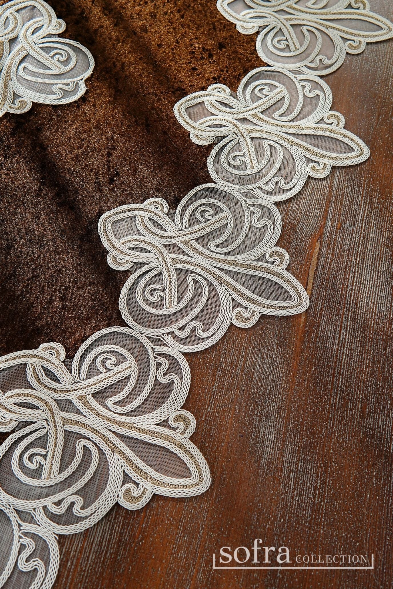 طقم مفارش صالون ٥ قطع مزين بدانتيل اوف وايت – موديل فينتو – قماش قطيفة فاخر بنى اللون