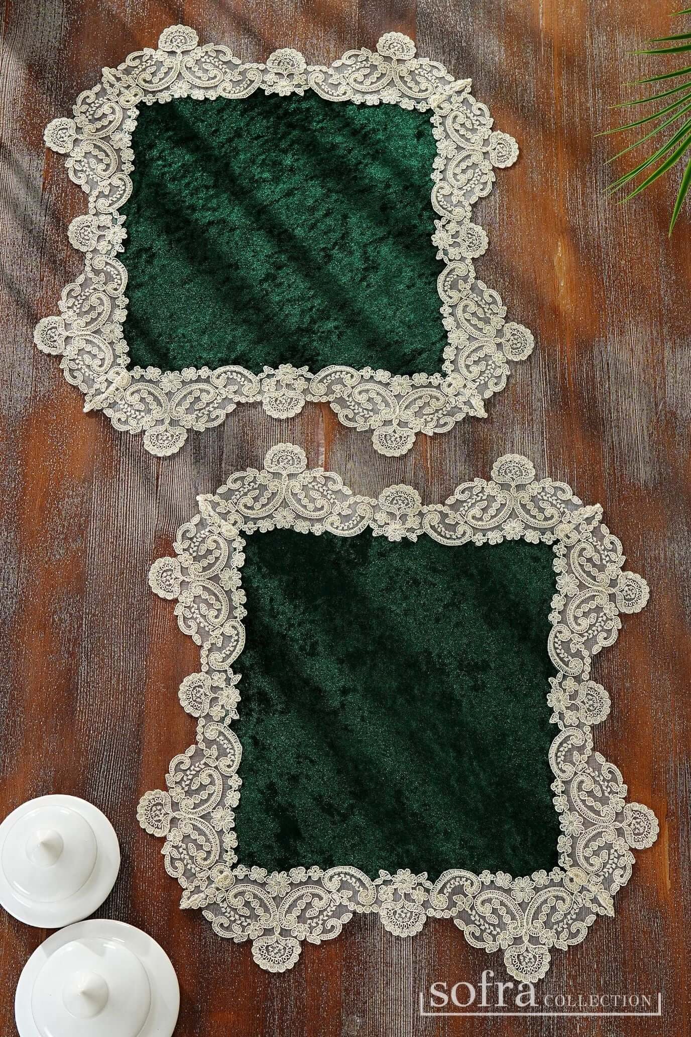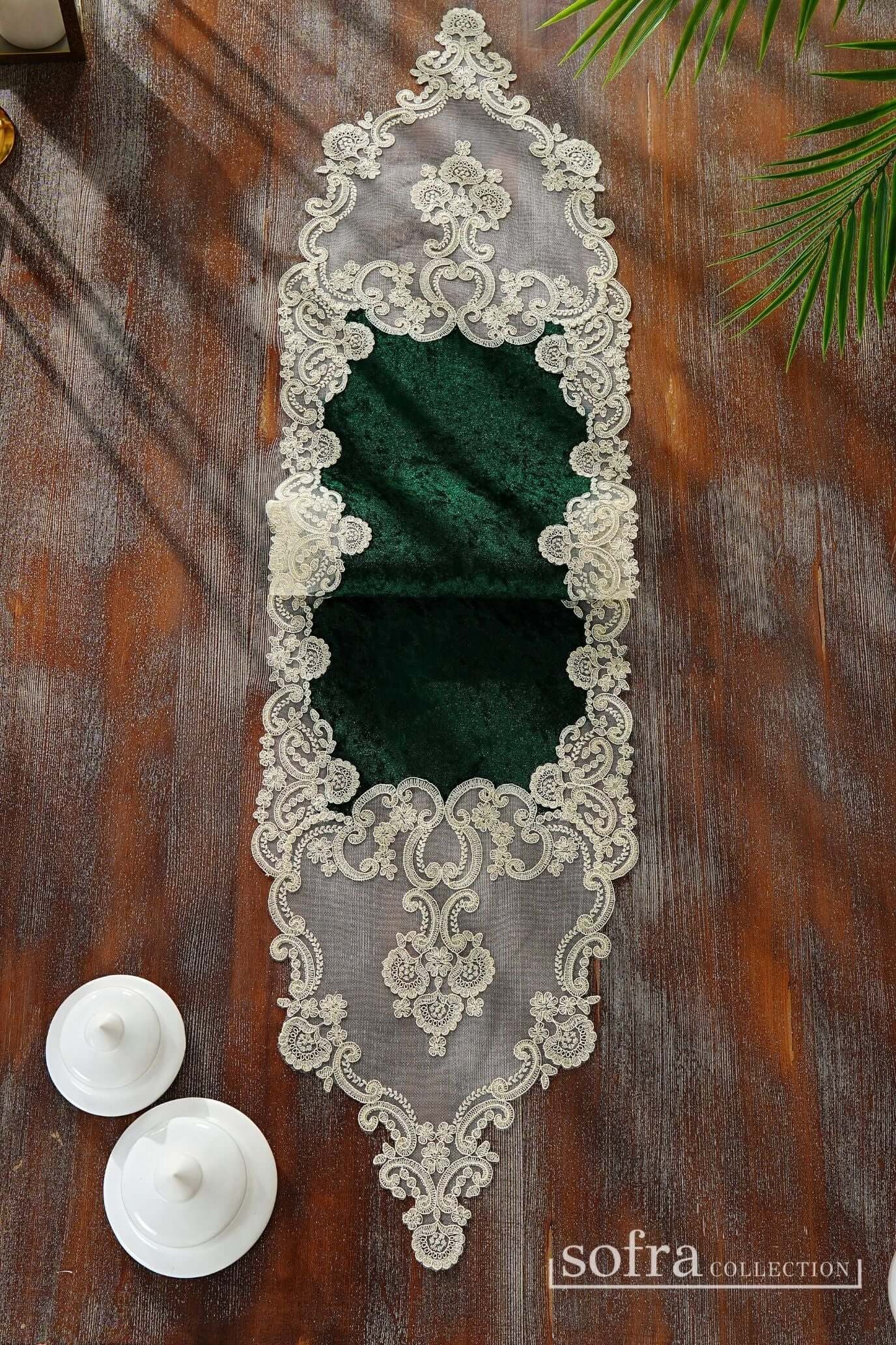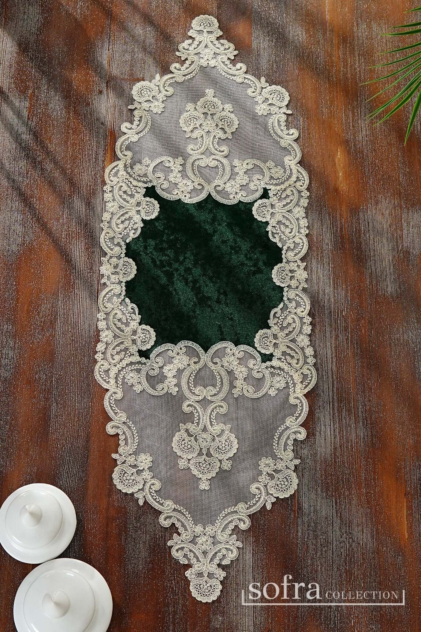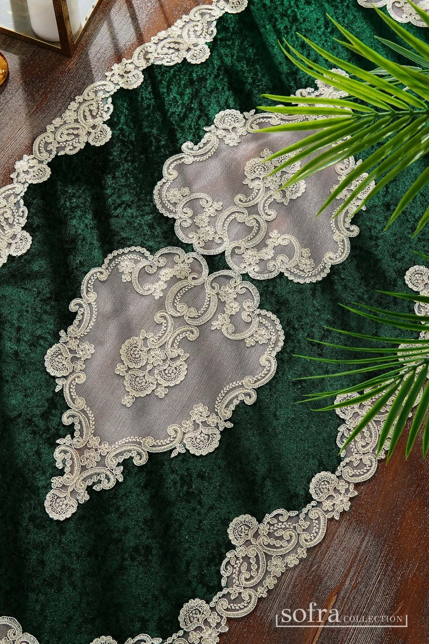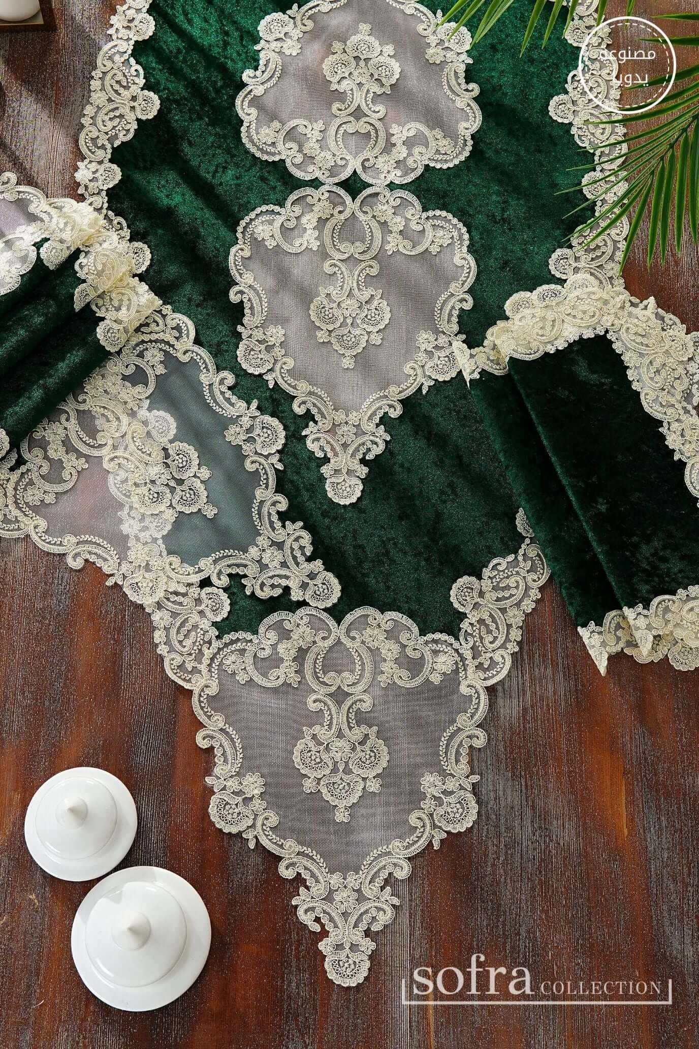 طقم مفارش صالون ٥ قطع مزين بدانتيل اوف وايت – موديل فينتاج – قماش قطيفة فاخر اخضر اللون