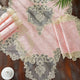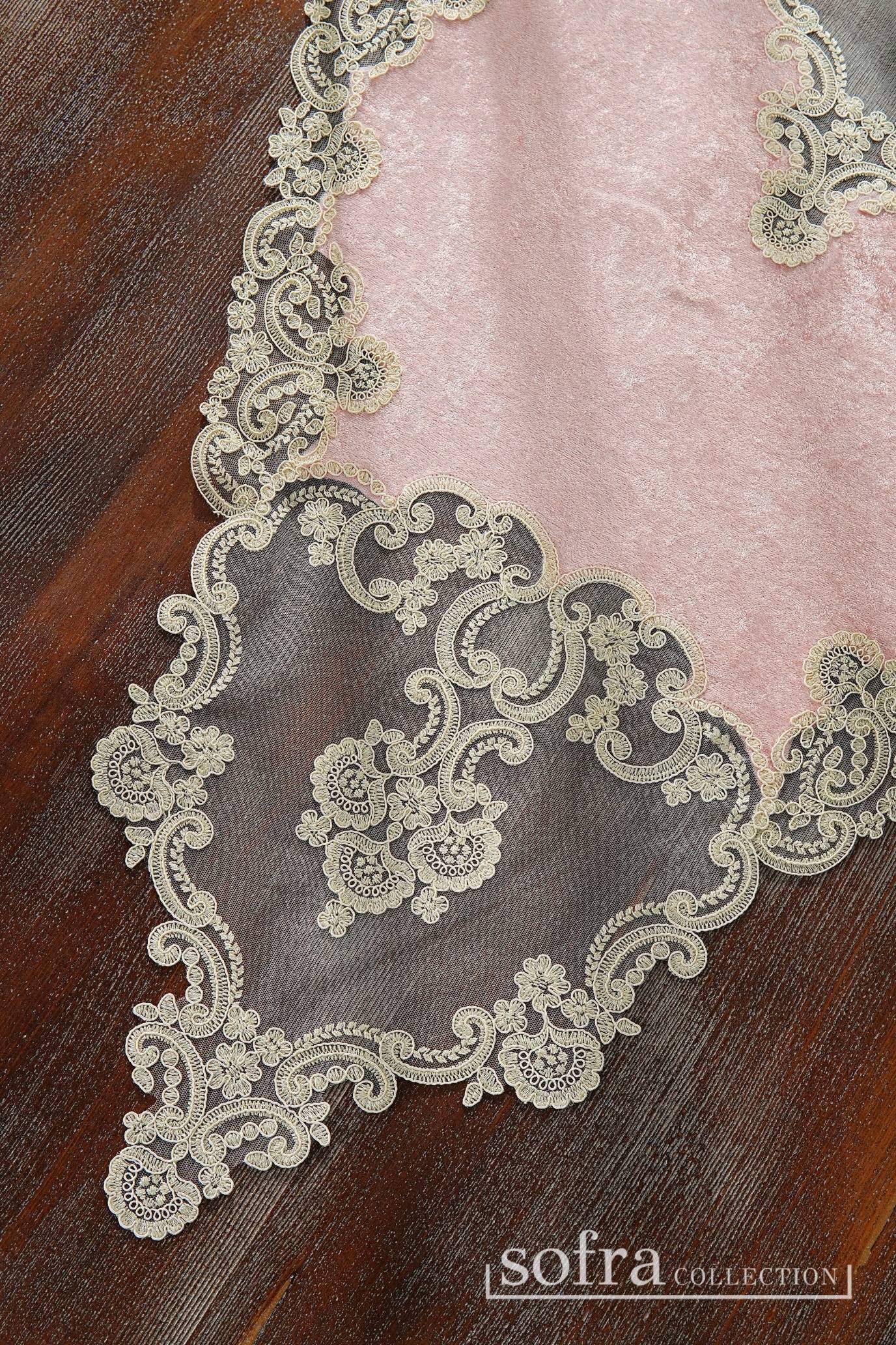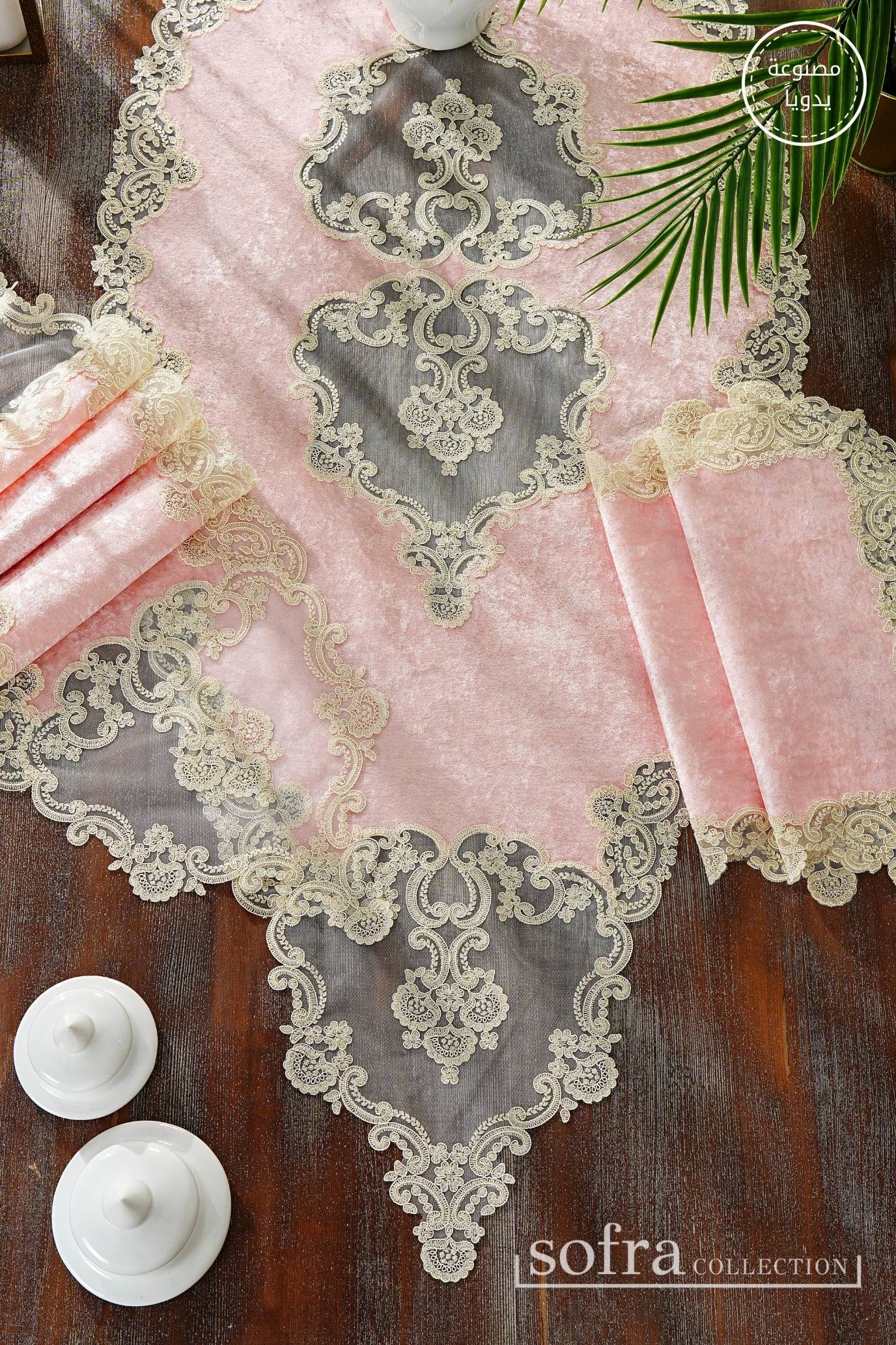 طقم مفارش صالون ٥ قطع مزين بدانتيل اوف وايت – موديل فينتاج - قماش قطيفة فاخر وردي فاتح اللون