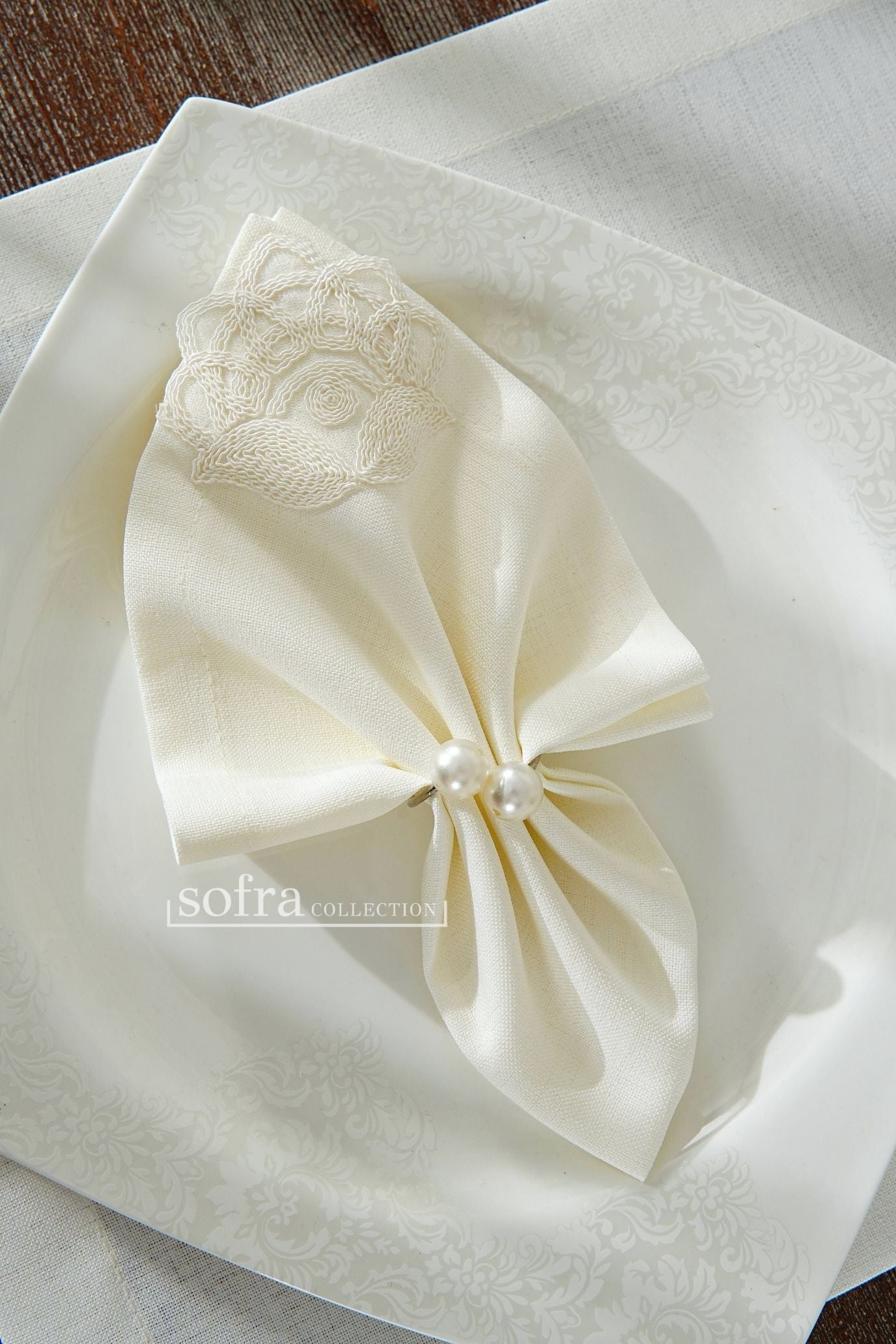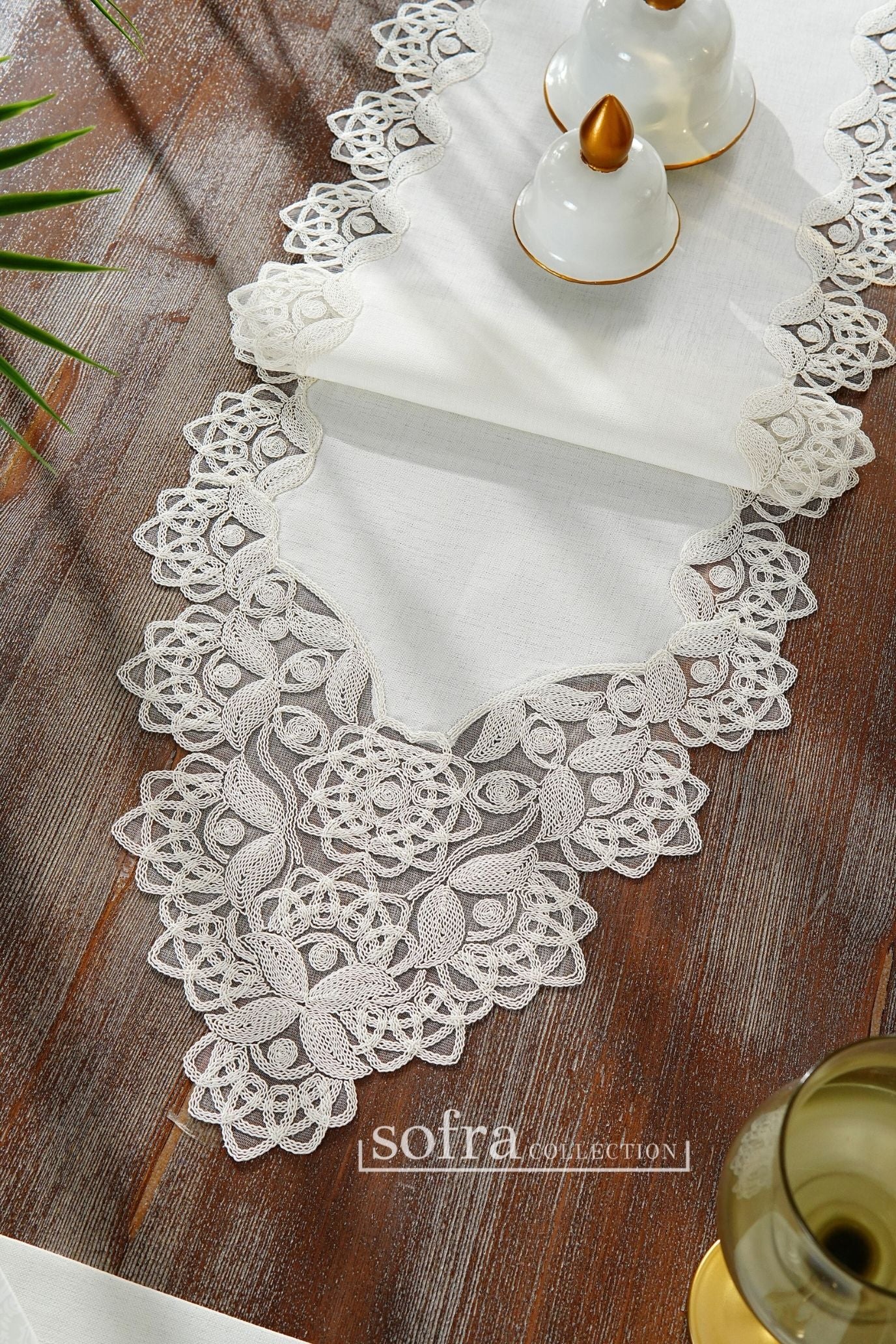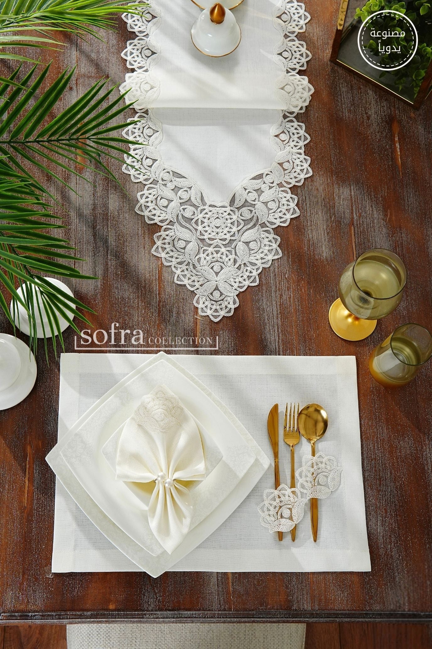 طقم مفارش سفرة مزين بدانتيل اوف وايت - موديل زهرة الصيف – شامل المناديل - ٣٧ قطعة – ١٢ شخص - قماش كتان مقاوم للبقع
