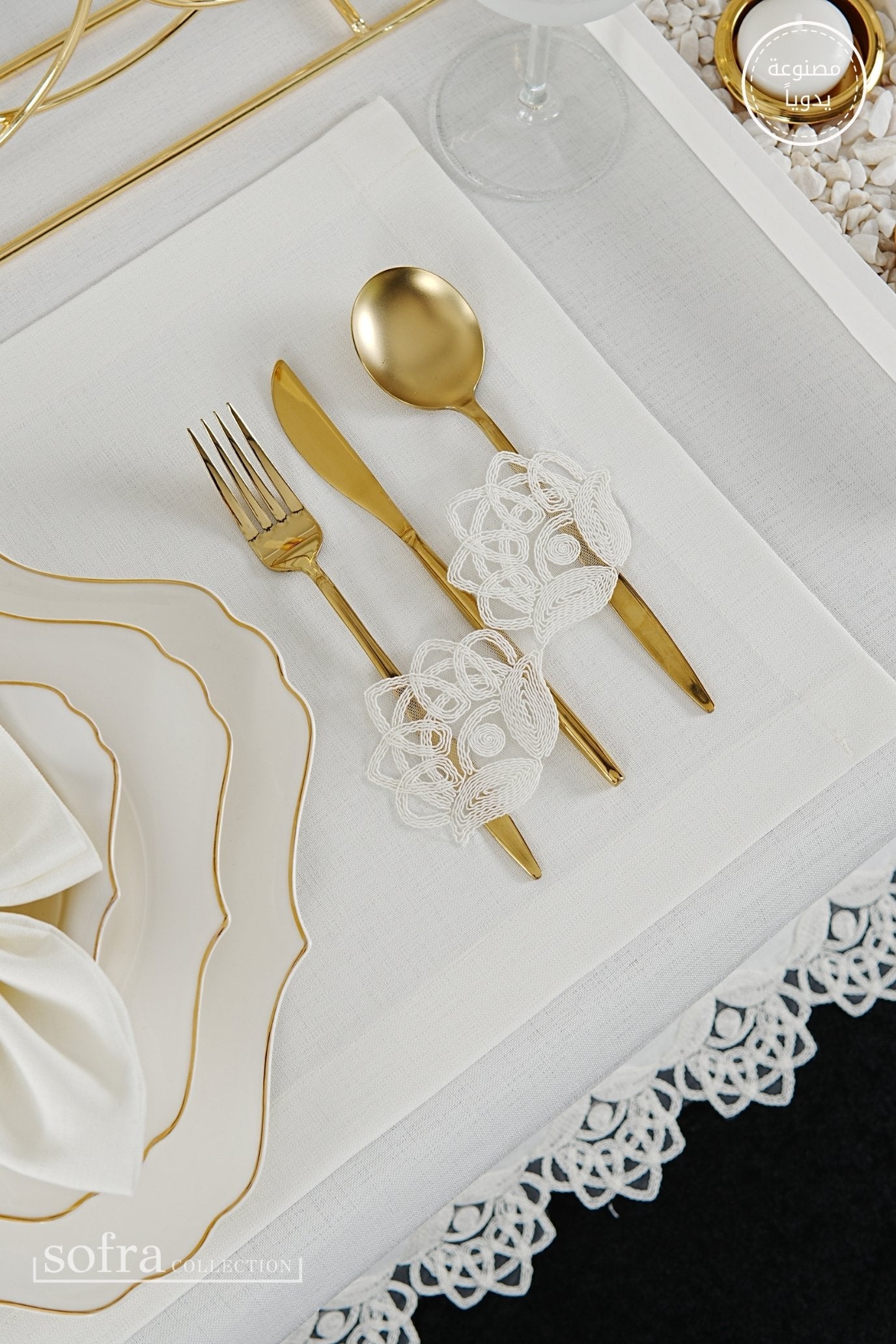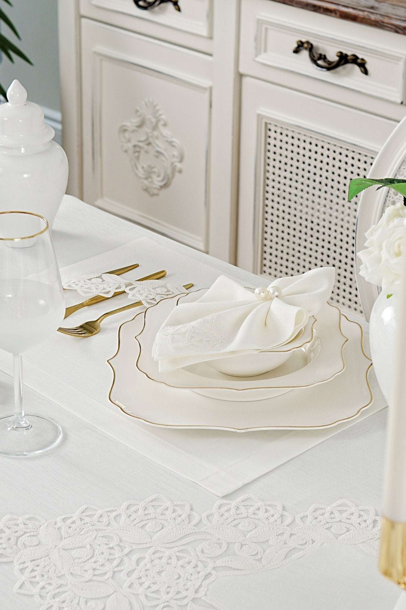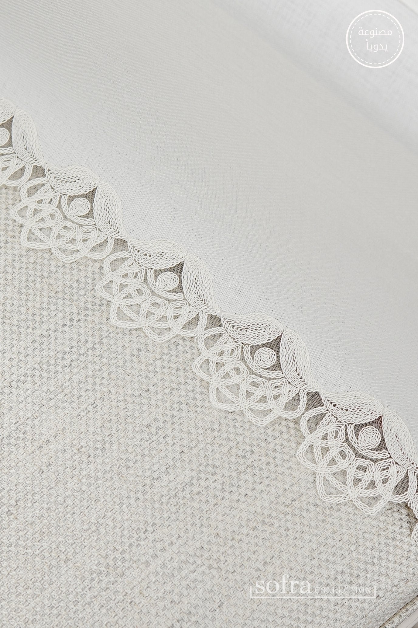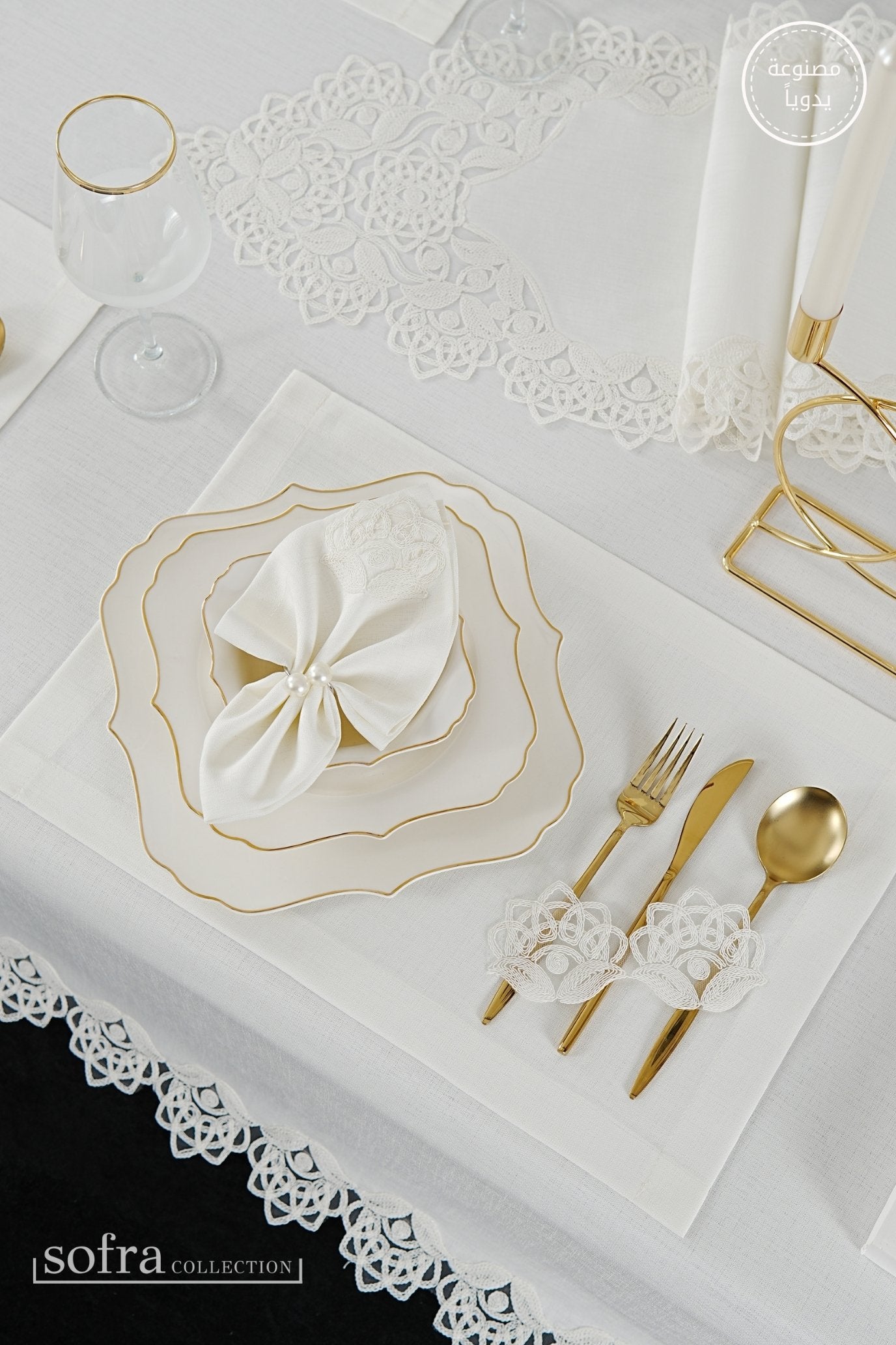 طقم مفارش سفرة كامل مزين بدانتيل اوف وايت - موديل زهرة الصيف – ٣٨ قطعة – ١٢ شخص - قماش كتان مقاوم للبقع