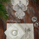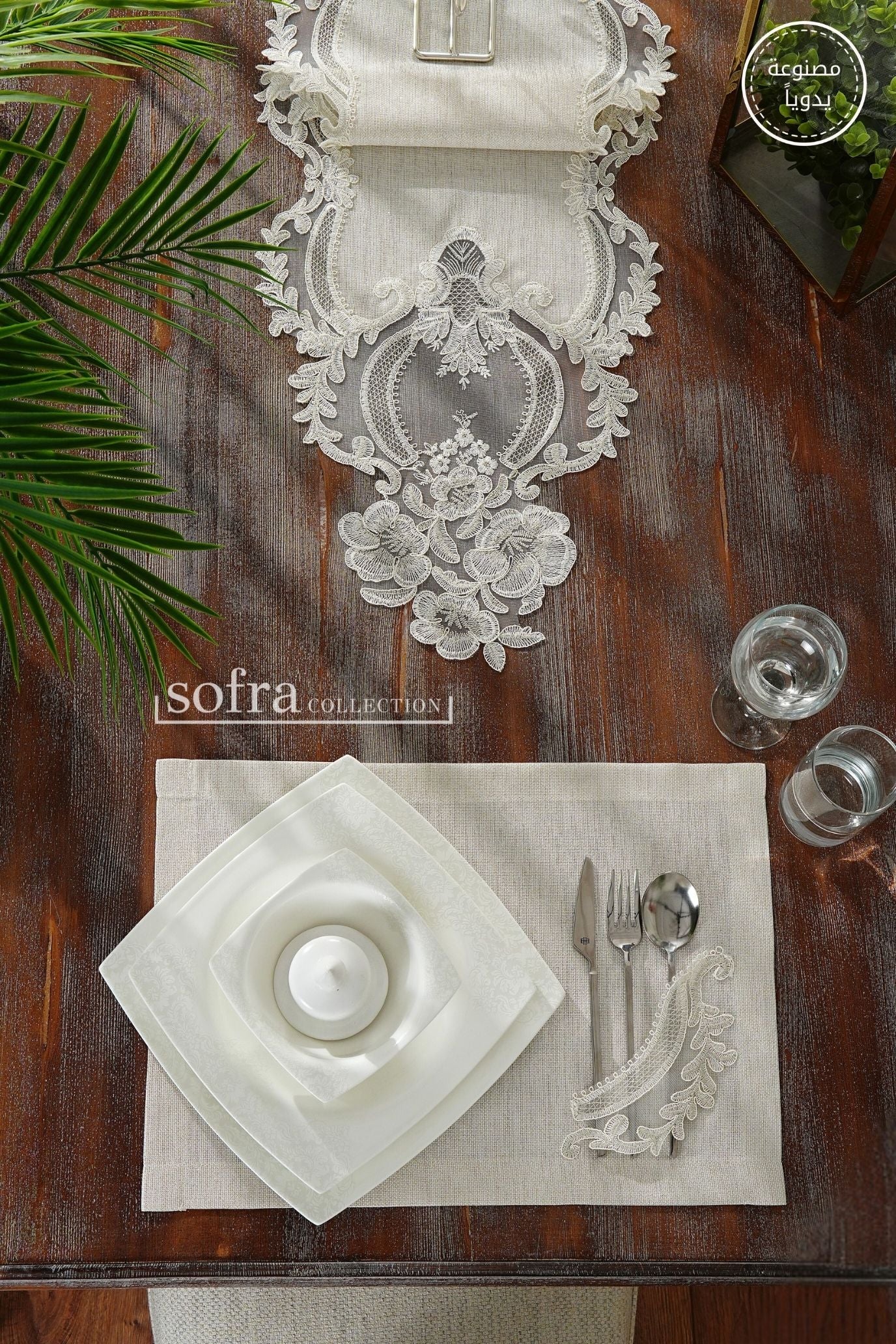 طقم مفارش سفرة مزين بدانتيل اوف وايت - موديل زاهيرة – بدون مناديل - ١٣ قطعة – ١٢ شخص - قماش كتان مقاوم للبقع