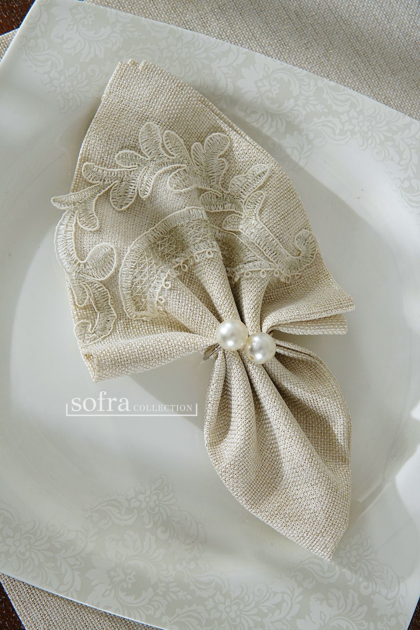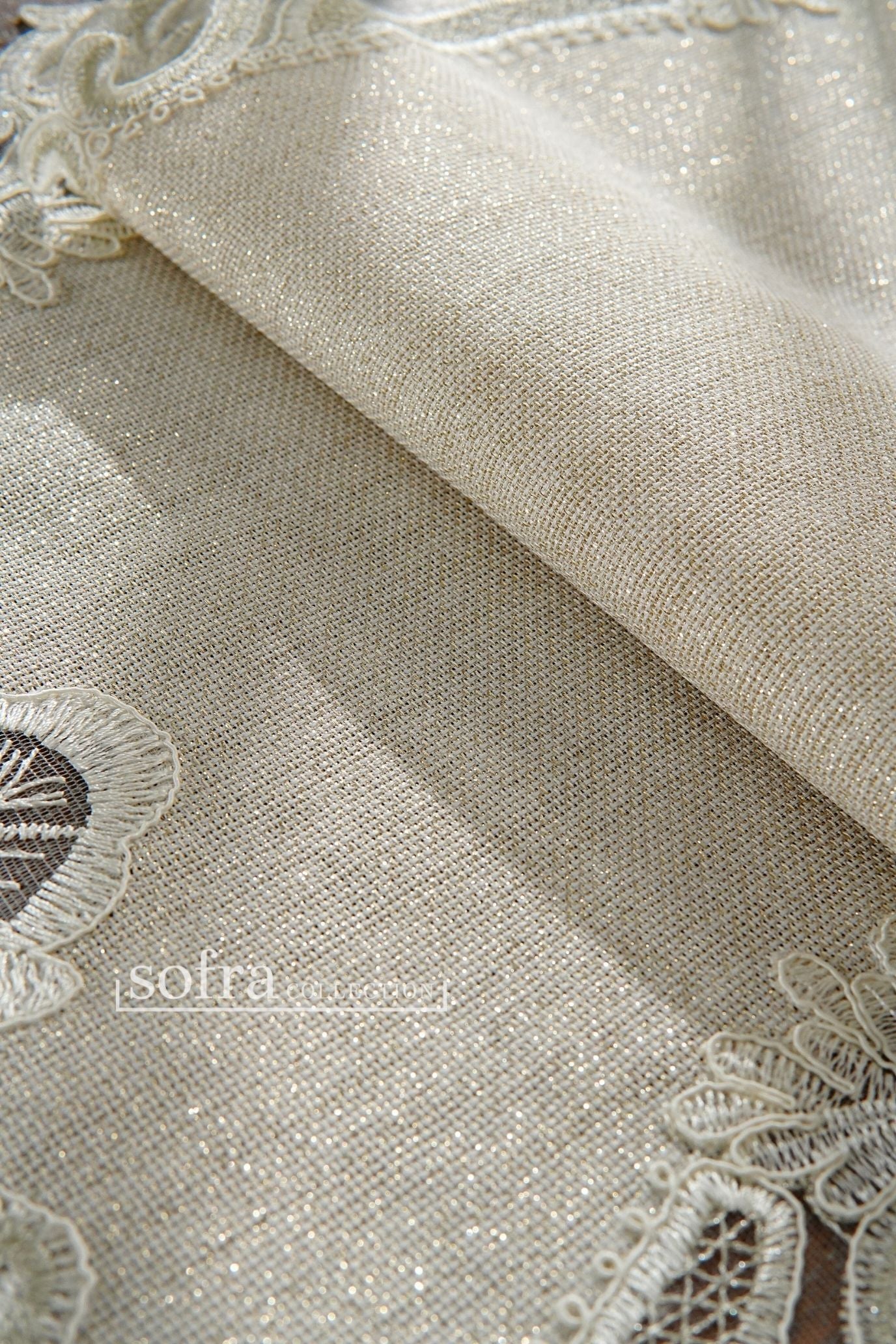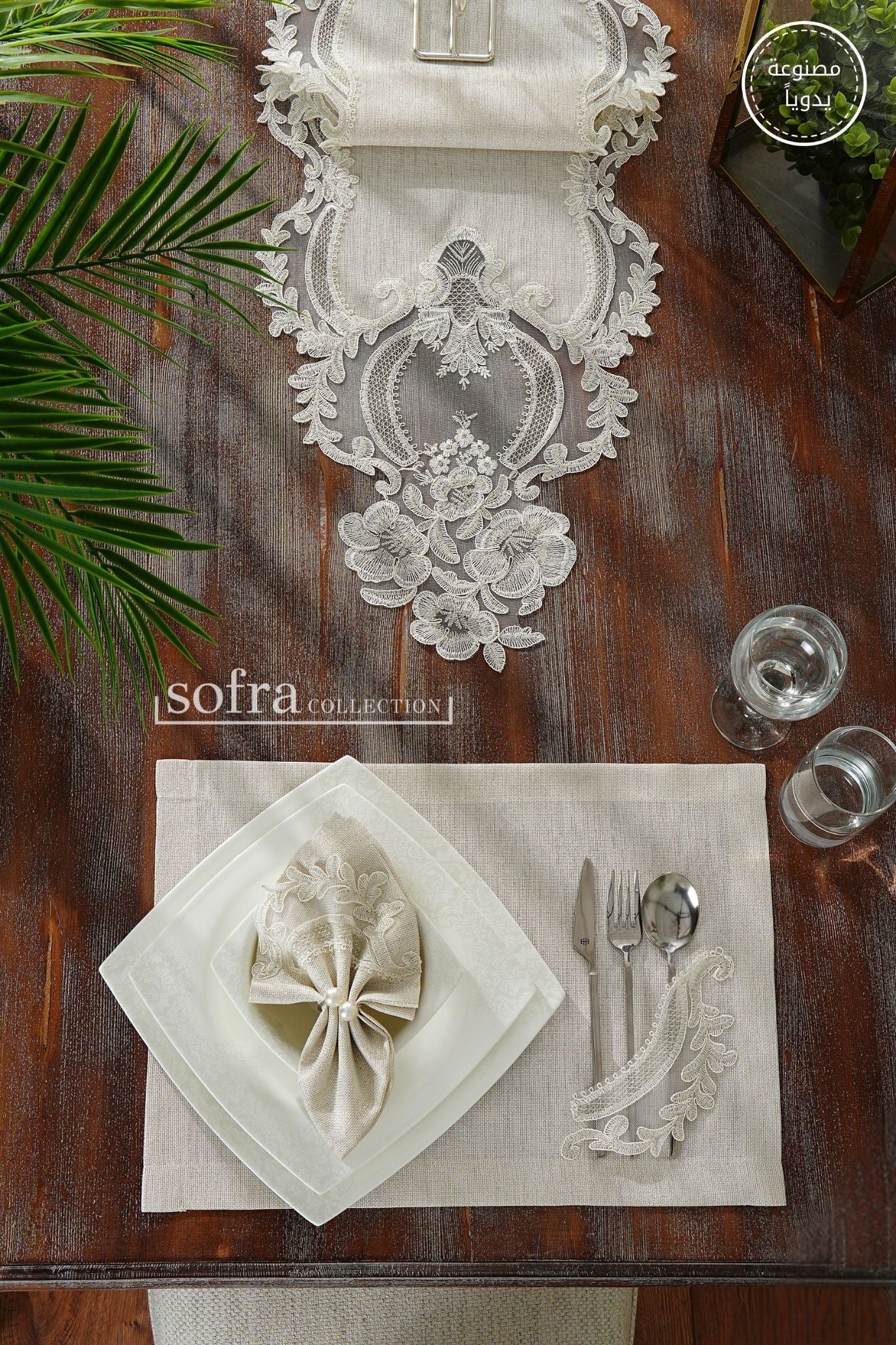 طقم مفارش سفرة مزين بدانتيل اوف وايت - موديل زاهيرة – شامل المناديل - ٣٧ قطعة – ١٢ شخص - قماش كتان مقاوم للبقع