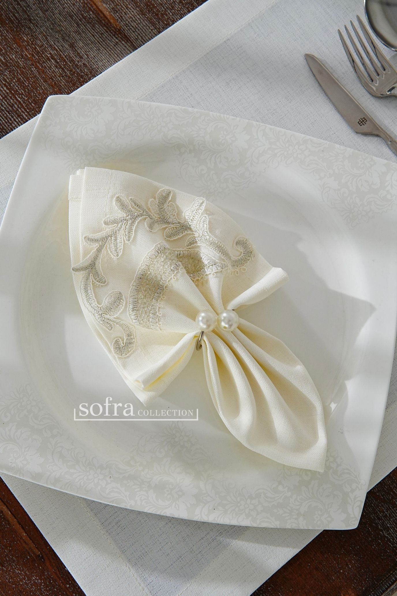 طقم مفارش سفرة مزين بدانتيل فضي واوف وايت - موديل زاهيرة – شامل المناديل - ٣٧ قطعة – ١٢ شخص - قماش كتان مقاوم للبقع