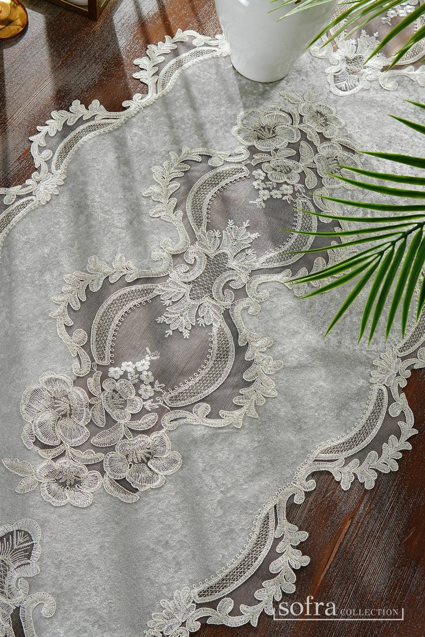طقم مفارش صالون ٥ قطع مزين بدانتيل فضى واوف وايت – موديل زاهيرة - قماش قطيفة فاخر رمادى اللون