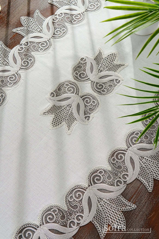 طقم مفارش سفرة كامل مزين بدانتيل اوف وايت - موديل لالى – ٣٨ قطعة – ١٢ شخص - قماش كتان مقاوم للبقع