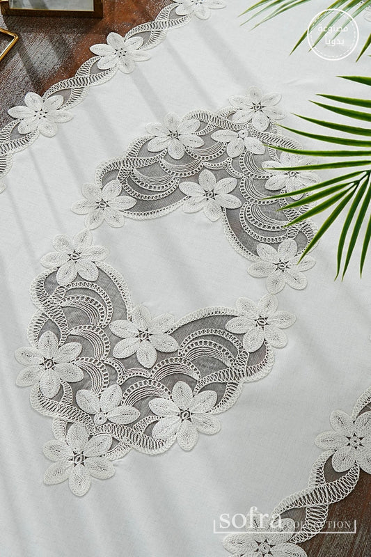 طقم مفارش سفرة مزين بدانتيل اوف وايت - موديل زهرة الصيف – شامل المناديل - ٣٧ قطعة – ١٢ شخص - قماش كتان مقاوم للبقع