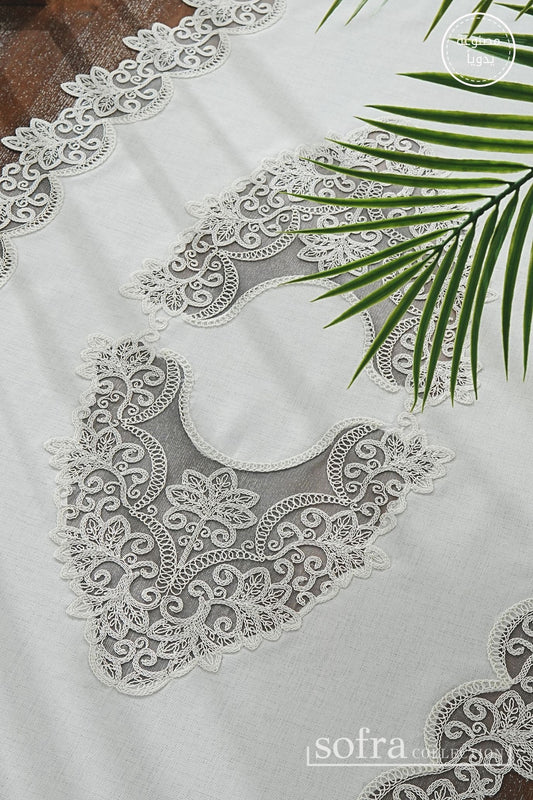 طقم مفارش صالون ٥ قطع مزين بدانتيل اوف وايت – موديل فريدة - قماش كتان فاخر مقاوم للبقع