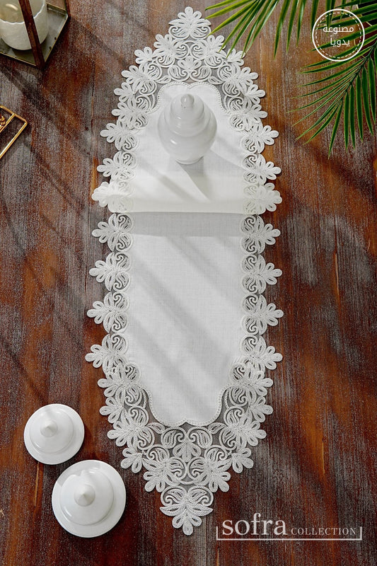 طقم مفارش سفرة كامل مزين بدانتيل اوف وايت - موديل لالى – ٣٨ قطعة – ١٢ شخص - قماش كتان مقاوم للبقع
